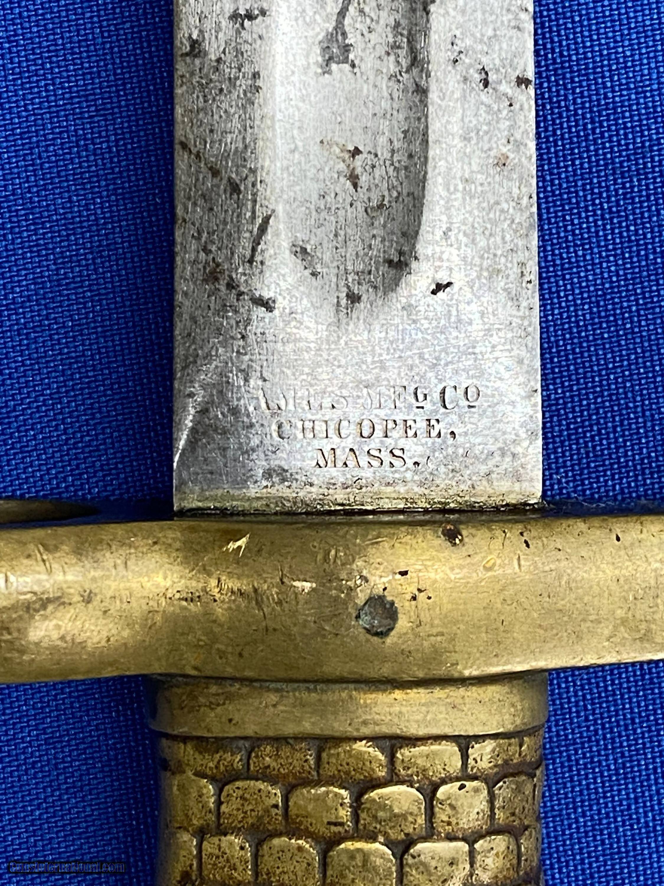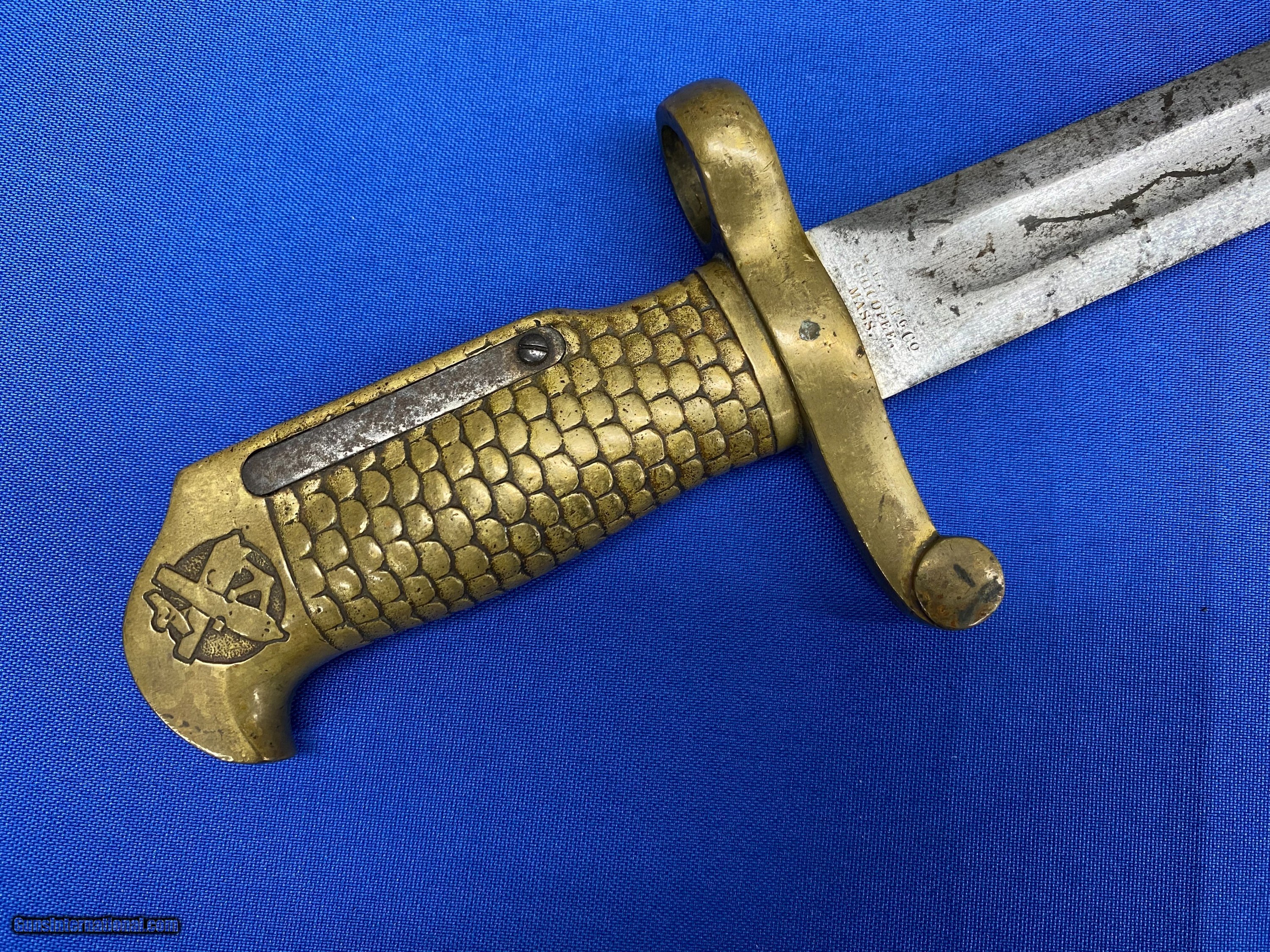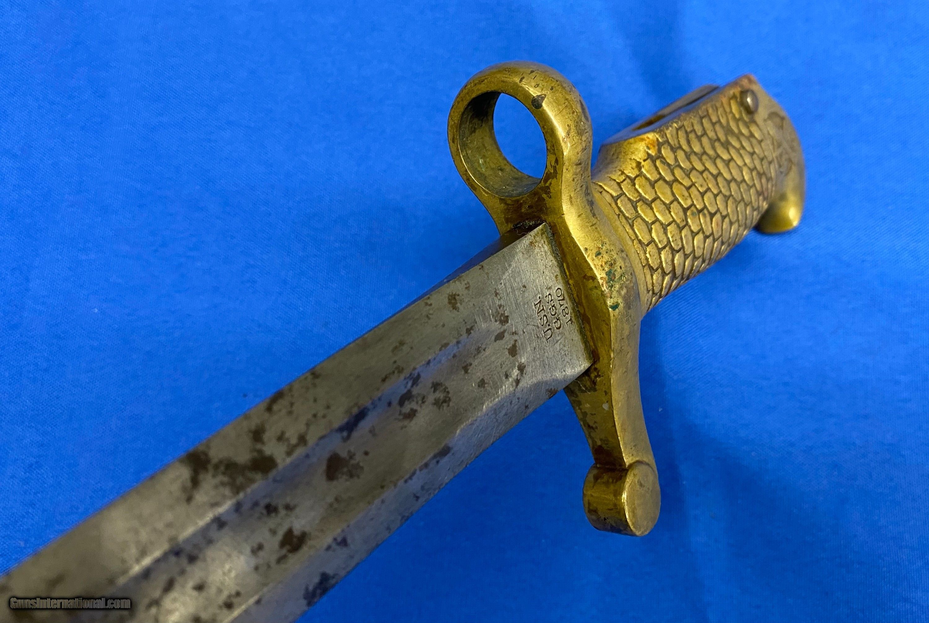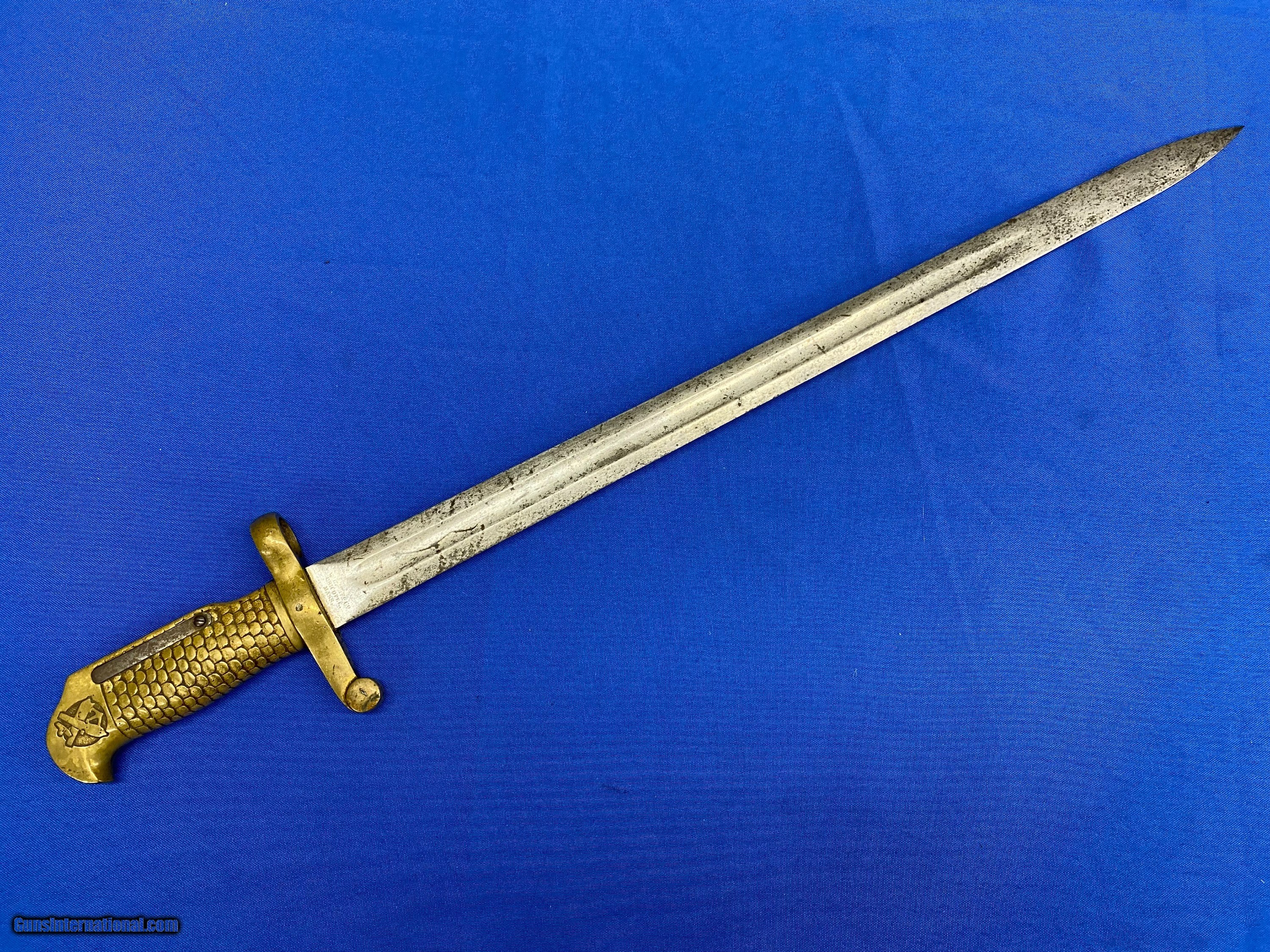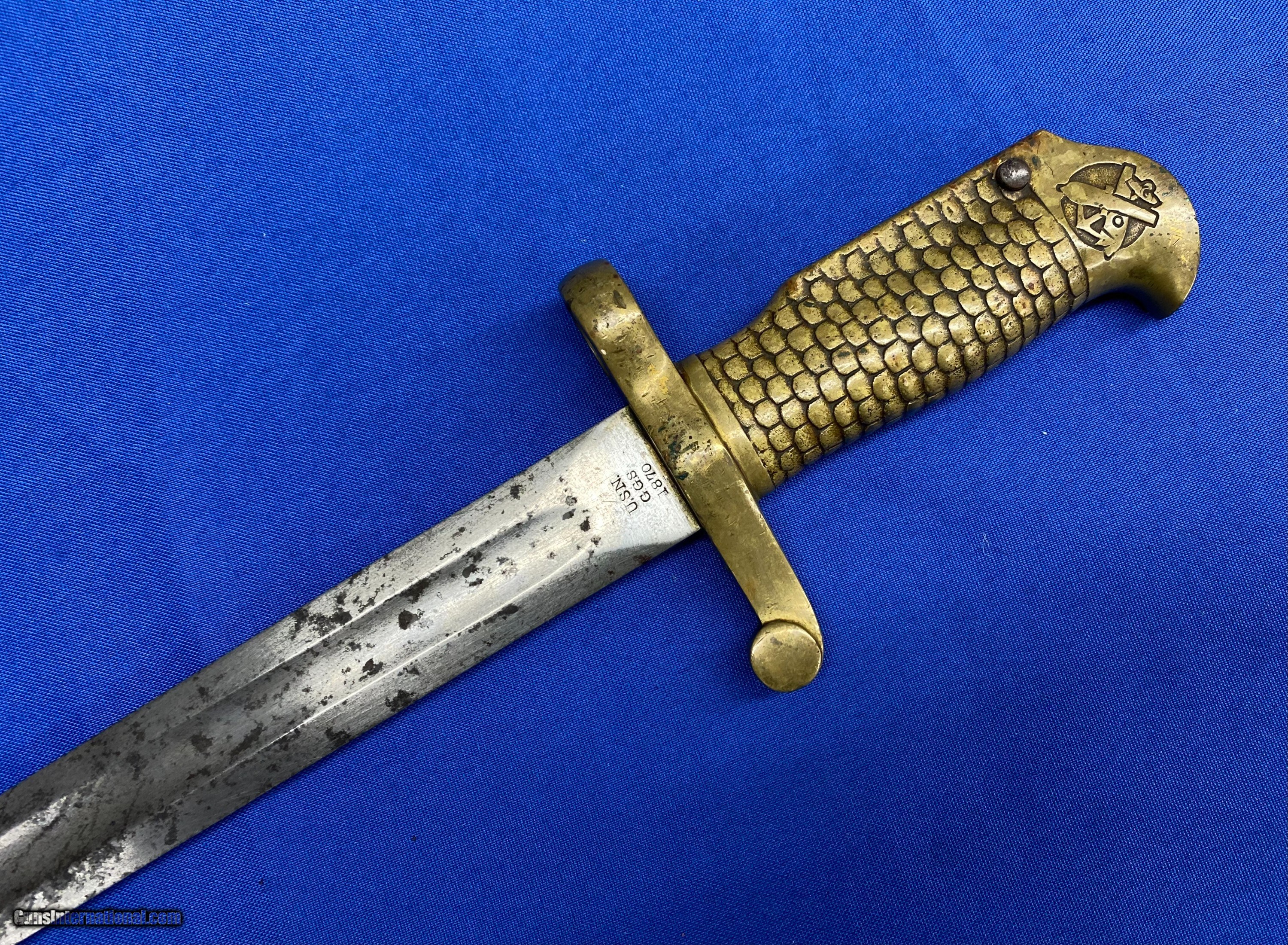 Description: This is an original, rare and lesser known of the Post Civil War Naval brass hilted bayonets for the U.S. Navy M1870 Remington Rolling block rifle, the Type 2 being somewhat more distinctive. It is a lovely yataghan style sword bayonet with a 20" blade, measuring 25” overall. It features a distinctive solid brass hilt with a feather/scale design cast into the grip. The blade is marked on one side “Ames Co. Chicopee, Mass”. The other side is marked U.S.N. G.G.S. 1870. The pommel is cast with the U.S. Crossed Cannons overlaying an Anchor and still bears the U.S. Inspector's initials of G.G.S. it is in nice untouched condition with some staining but is still in great shape. SOLD |