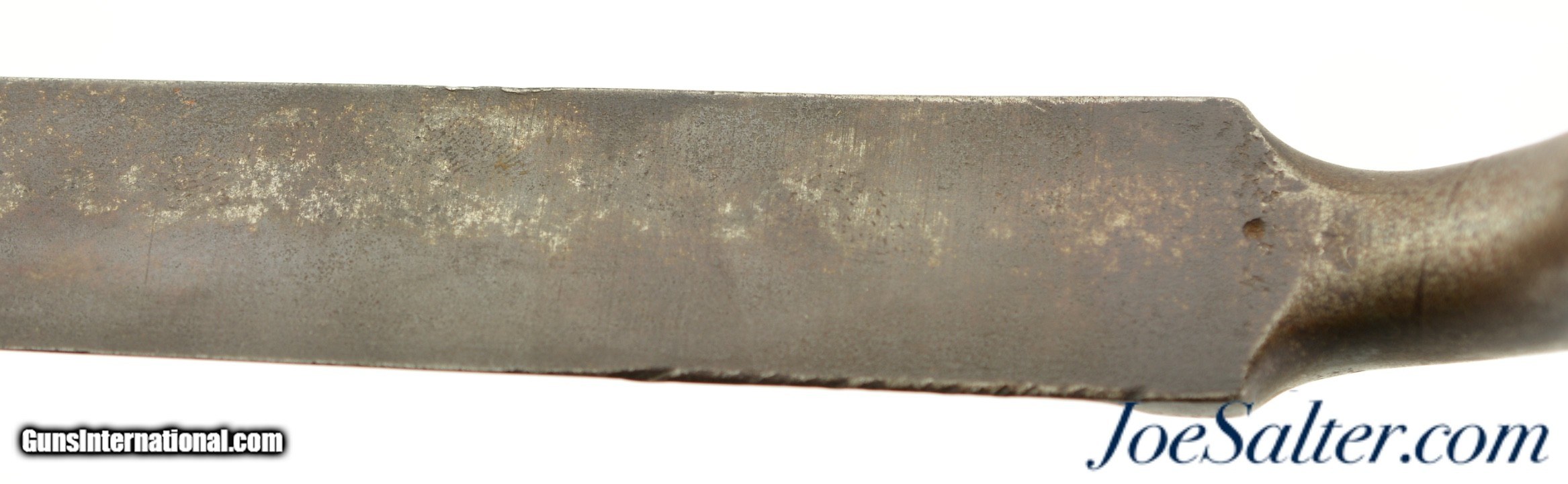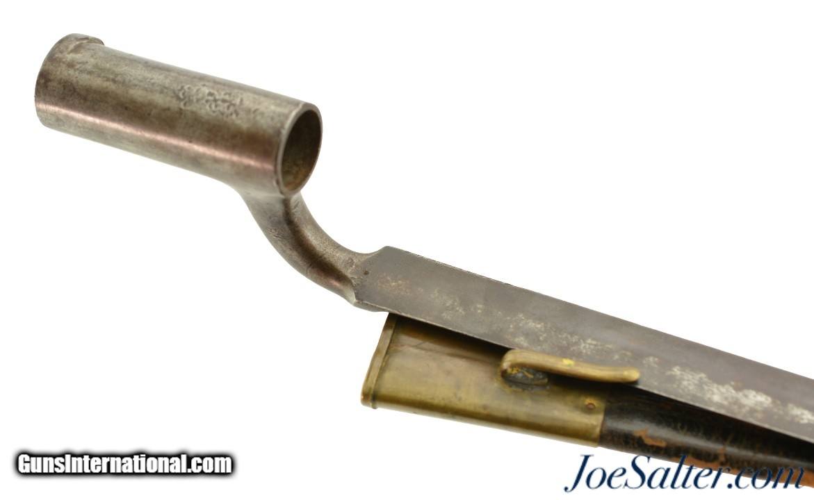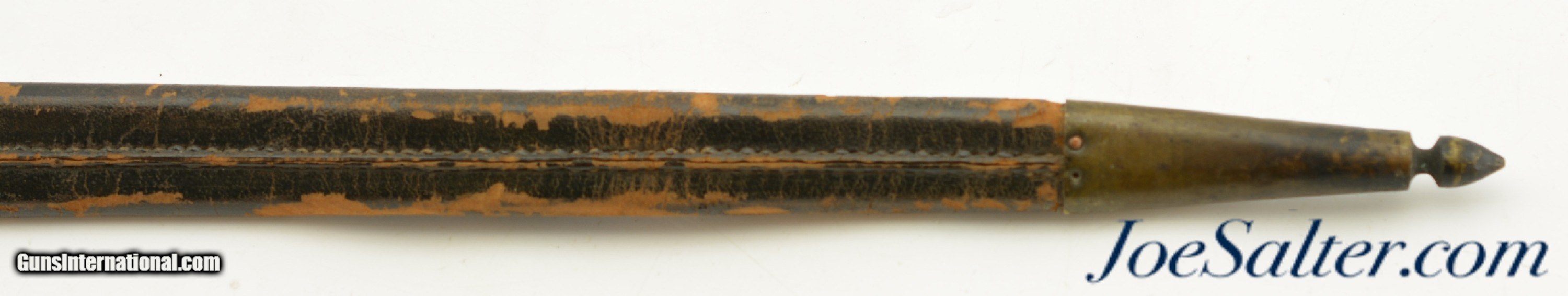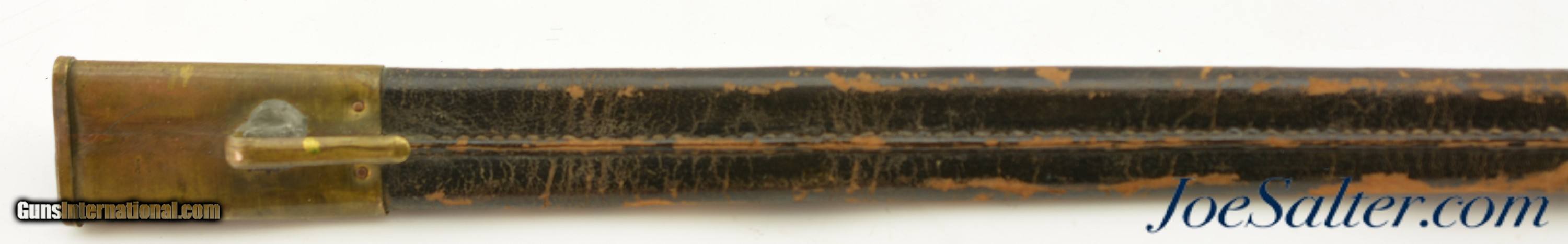 Description: This is an original Prussian Potsdam M1809 Bayonet. These are frequently encountered in the US, owing to the M1809 musket’s use during the U.S. Civil War. The bayonet is unusual in that it lacks the mortise commonly found on socket bayonets. In 1861, the Union purchased 165,000 Prussian arms, most of which were obsolete smoothbore M1809 percussion muskets with bayonets. This example is in very good condition with a 19 1/4" blade, 3" socket and 22 1/2" OA. The base of the blade at the neck is marked with an 8 and some other marks. The side of the neck is marked 69 with no other markings. The M1839 scabbard is in very good condition and these two items could have served together in the field. This was worn on shoulder belt as was popular in the day but fazed out of use within the next 10 years. There are no markings of the brass throat or finial, leather is supple, tight stitching and has most of the original finish.; Price: $189.00 Contact Seller |