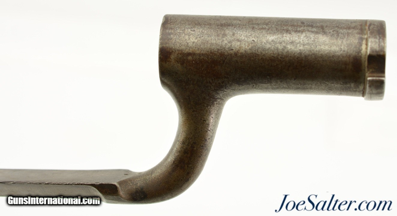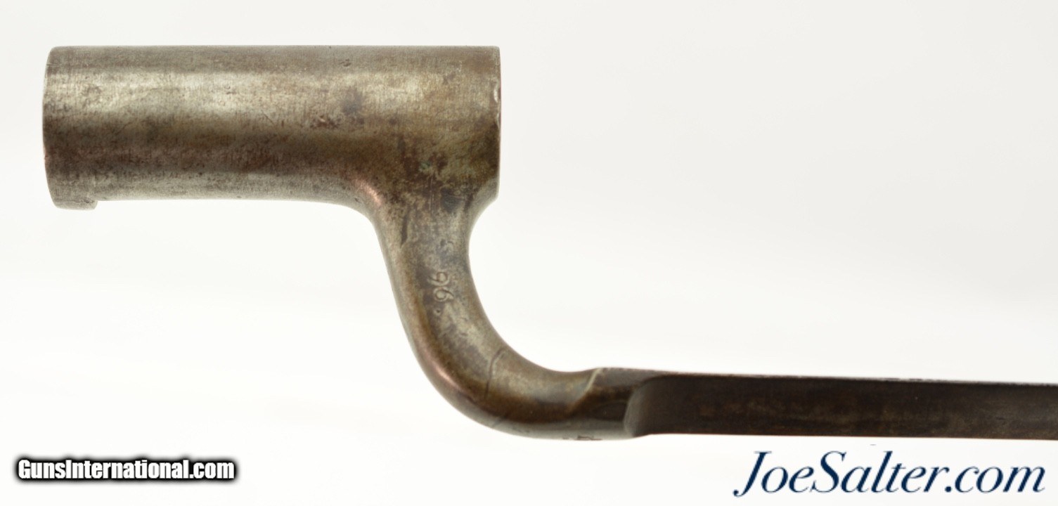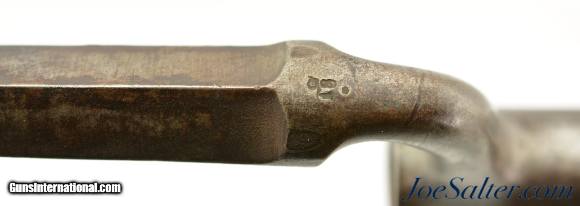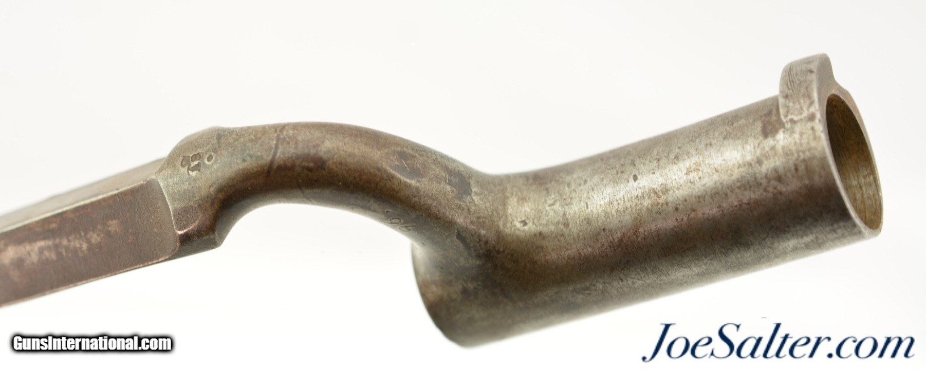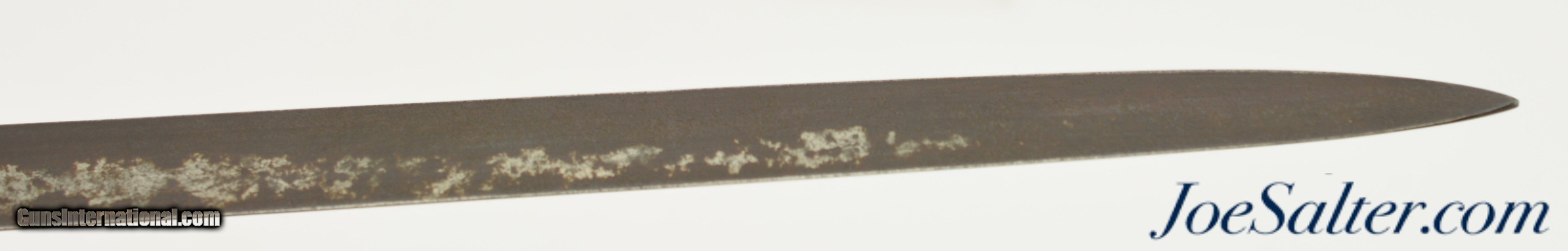 Description: This is an original Prussian Potsdam M1809 Bayonet. These are frequently encountered in the US, owing to the M1809 musket’s use during the U.S. Civil War. The bayonet is unusual in that it lacks the mortise commonly found on socket bayonets. In 1861, the Union purchased 165,000 Prussian arms, most of which were obsolete smoothbore M1809 percussion muskets with bayonets. This example is in very good condition with a 19 1/4" blade, 3" socket and 22 1/2" OA. The base of the blade at the neck is marked with an 8 and some other marks. The side of the neck is marked 69 with no other markings. The M1839 scabbard is in very good condition and these two items could have served together in the field. This was worn on shoulder belt as was popular in the day but fazed out of use within the next 10 years. There are no markings of the brass throat or finial, leather is supple, tight stitching and has most of the original finish.; Price: $189.00 Contact Seller |