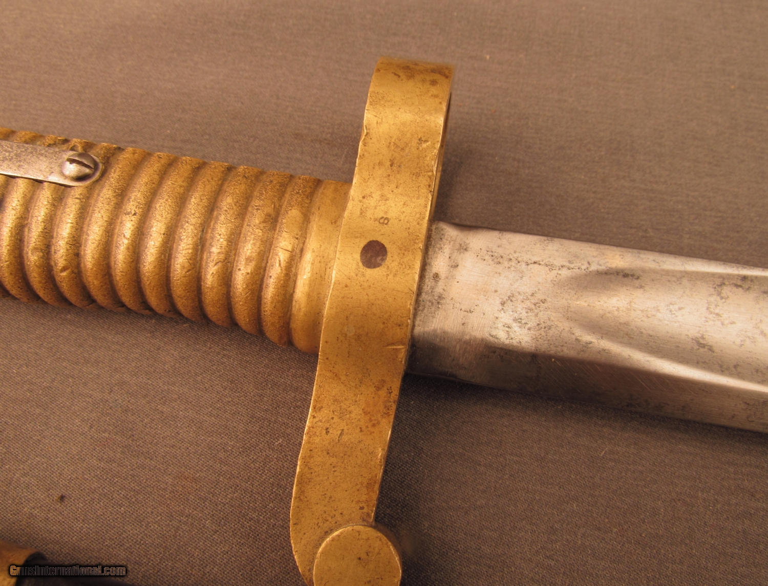 Description: This 24 1/4 inch baronet features a 20 inch Yataghan blade with 14 inch unstopped fullers. Blade is marked with a tiny "B" at ricasso. Right side of guard shows small "S" with "B.H." inspectors marks behind ring on grip top. Blade is bright with light stains and scattered light pitting. Brass grip shows a nice aged mustard patina. This comes in an excellent leather and brass scabbard showing a period copper rivet repair to tip. Scabbard has a tight seam and leather shows light wear with a few scuffs. Brass fittings show a few shallow dents. Tip is marked with a small "S". A fine example of this popular bayonet. SOLD Manufacturer: Remington Model: Zouave |