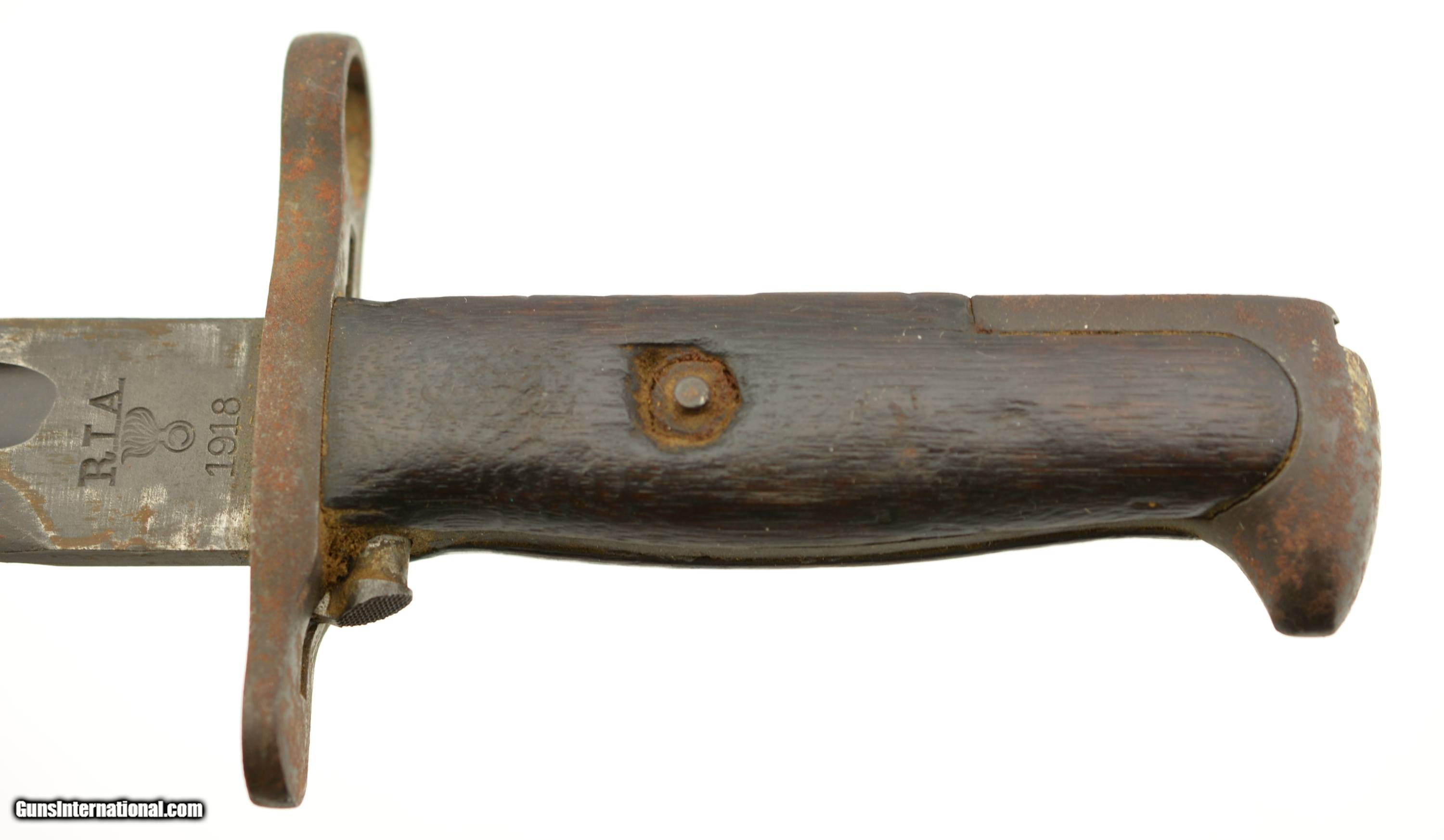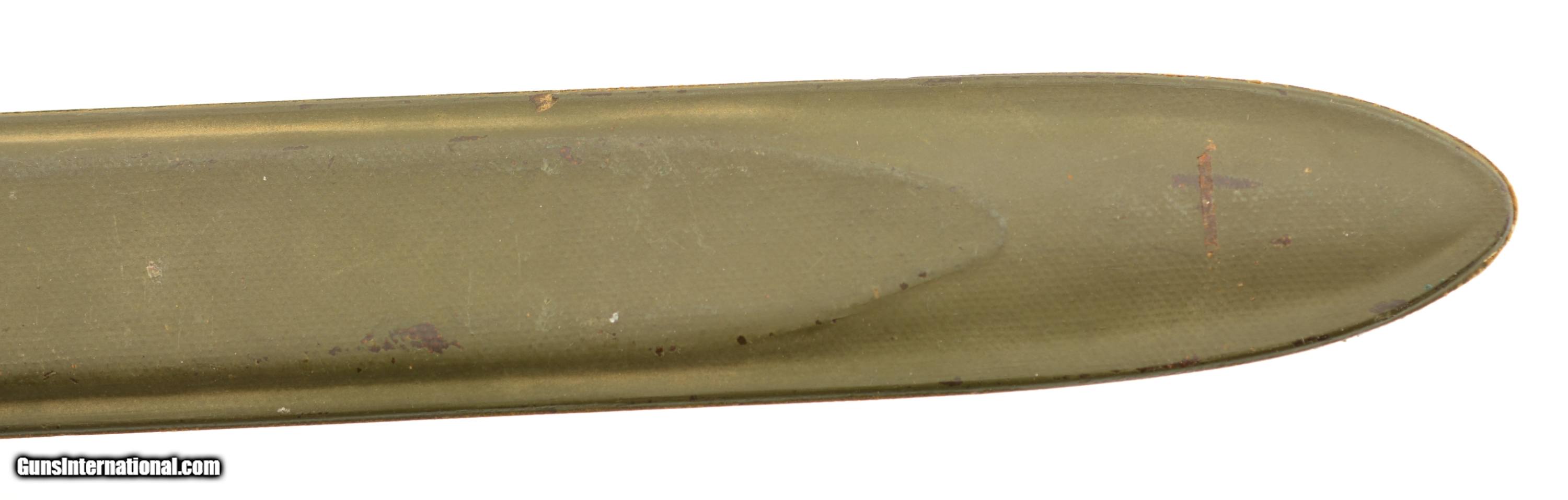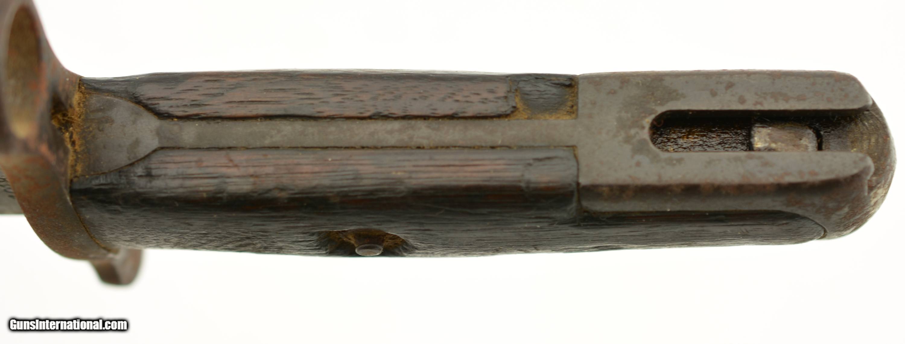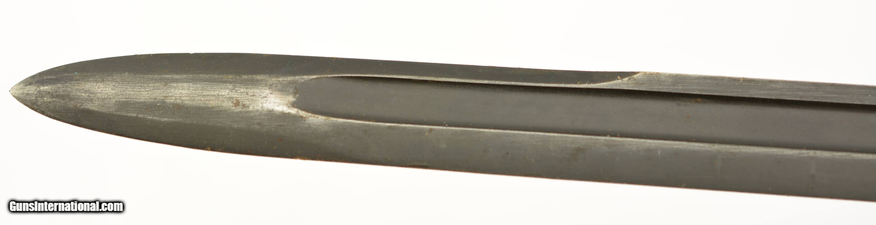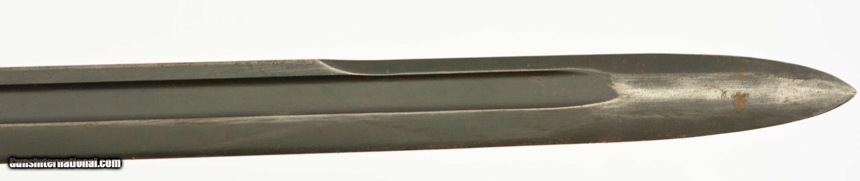 Description: This bayonet was manufactured in 1918 by the Rock Island Arsenal. The blade of this bayonet would rate excellent with more than 80% of it original bluing, only light surface rust is percent with a patch near the guard and by the tip. This blade still retains its original length of 16 inches. This blade was not cut down for WWII. It was later paired with an M3 scabbard. The guard and pommel show more surface rust with the guard being a bit heavier. The handle is the original wood scales with two wars of scares. There is one chip in the right top scale which looks as if it has been there a long time. Spring works fine and attaches correctly to scabbard. The scabbard is in very good shape with a fine coating of surface rust on the metal parts. The US and flaming bomb are visible. SOLD Manufacturer: US Military Model: Bayonet |