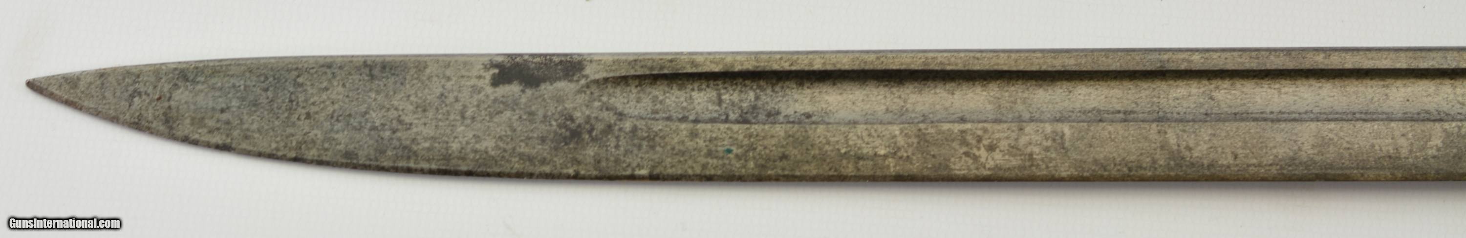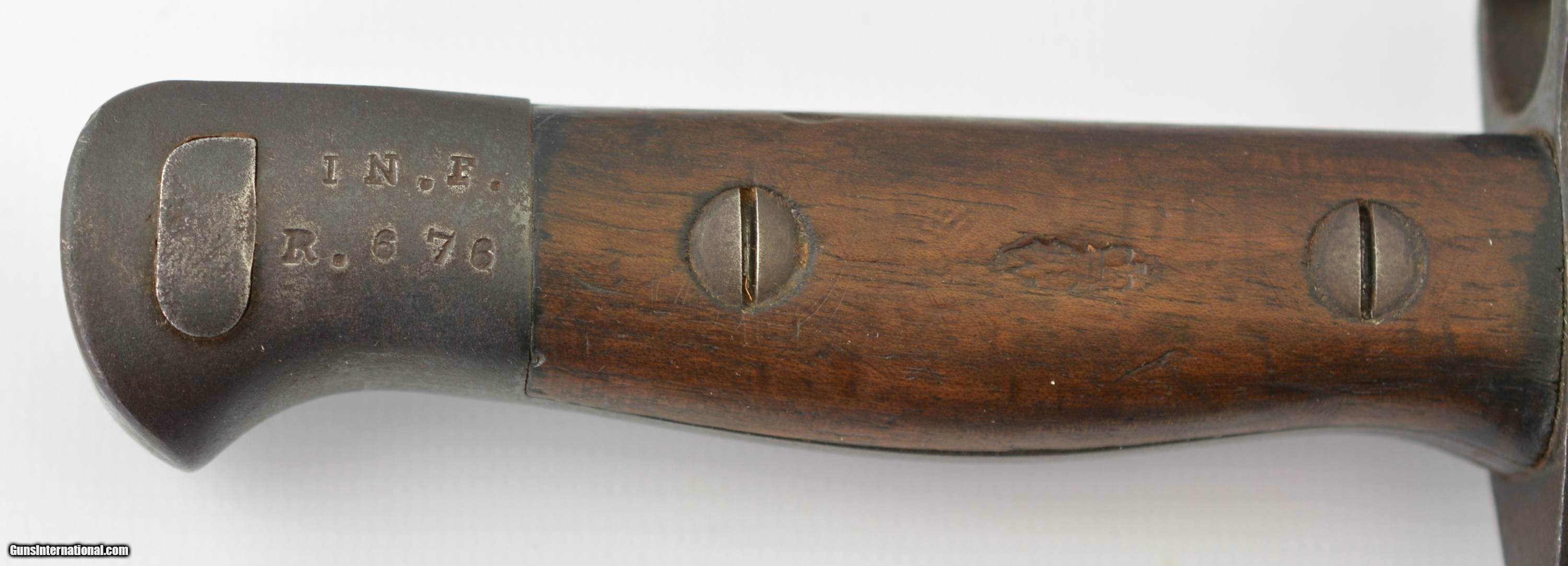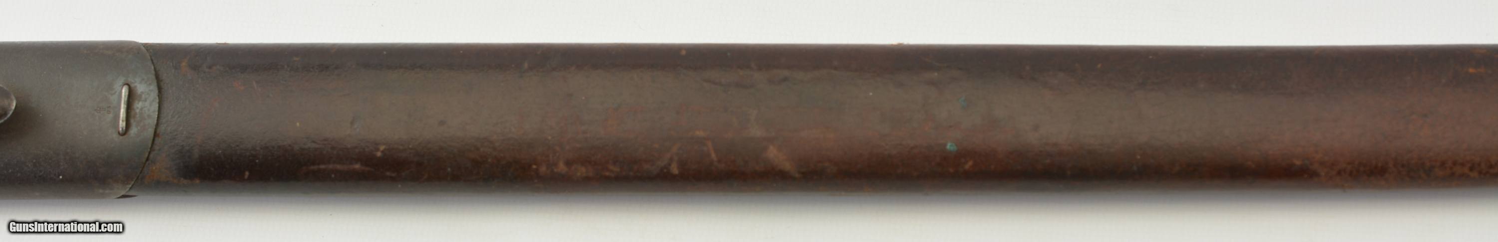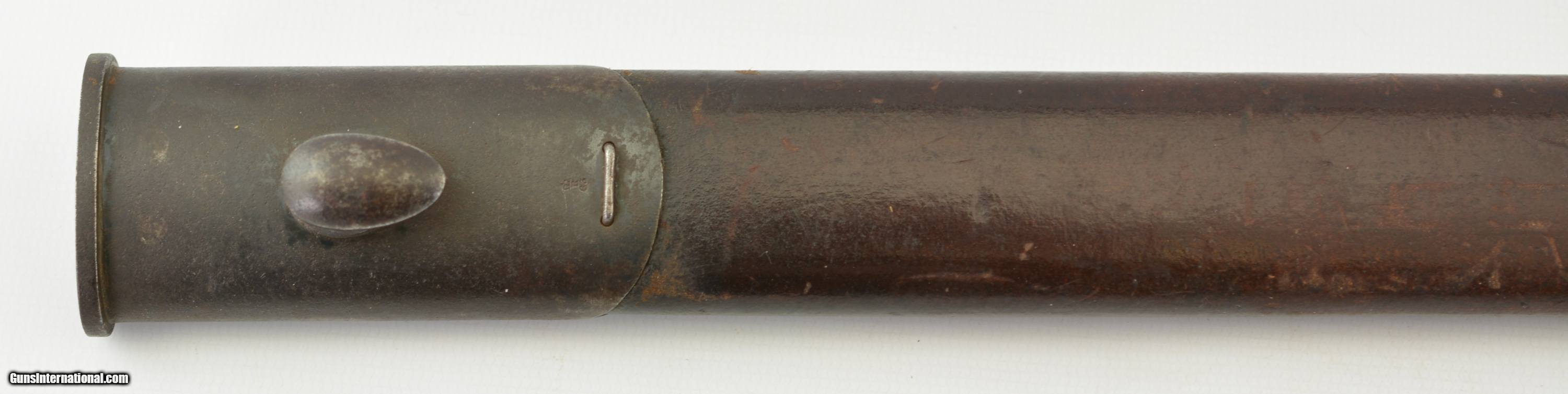 Description: This is a very scarce British Hooked Quillion Pattern 1907 bayonet manufactured by Wilkinson and includes a proper first year scabbard. This example is dated 11/1908 and the ricasso is marked "Crown/ER/1907/11/08/Wilkinson" Reverse is marked with a Broad Arrow, 2 inspector marks and proof. Only about 25,575 Wilkinson bayonets manufactured 1908-1911 compared to about 175,000 by Enfield. Wooden grips are marked "CROWN/49" with inspectors mark. Pommel is unit marked "IN.F R.676" The Royal Inskilling Fusileers" an English Militia Infantry Unit. Mouth of the very early original MK I scabbard is matching "R.676" The internal chape has only the iron tip visible. Leather is marked "BROAD ARROW/AC/CROWN/INSPECTOR 09/INSPECTOR" Pattern 1907 hooked quillion bayonets are not common. Please see pages 186-187 of British Commonweath Bayonets by Skeenerton & Richardson. SOLD Manufacturer: Enfield Model: Bayonet |