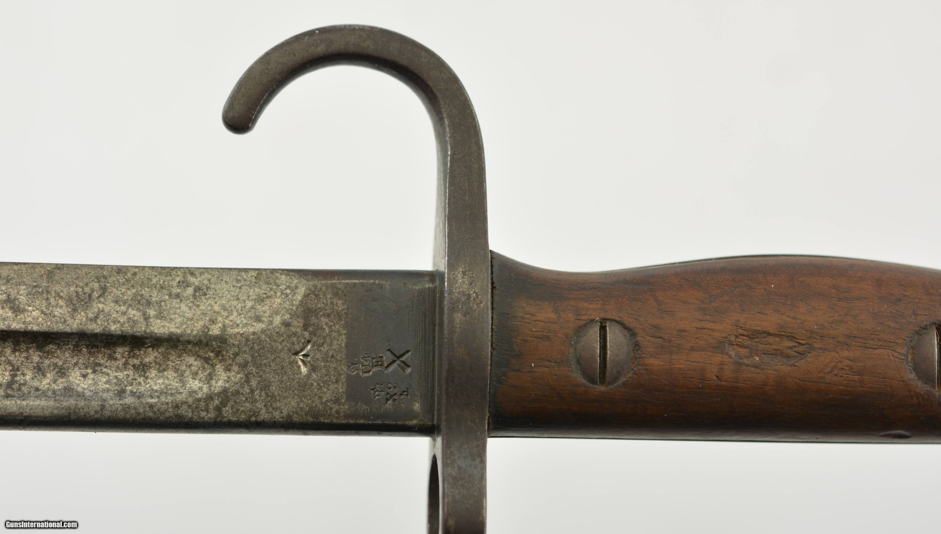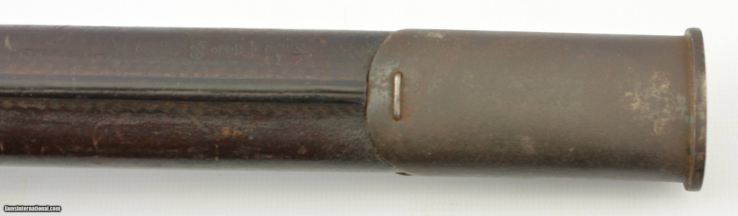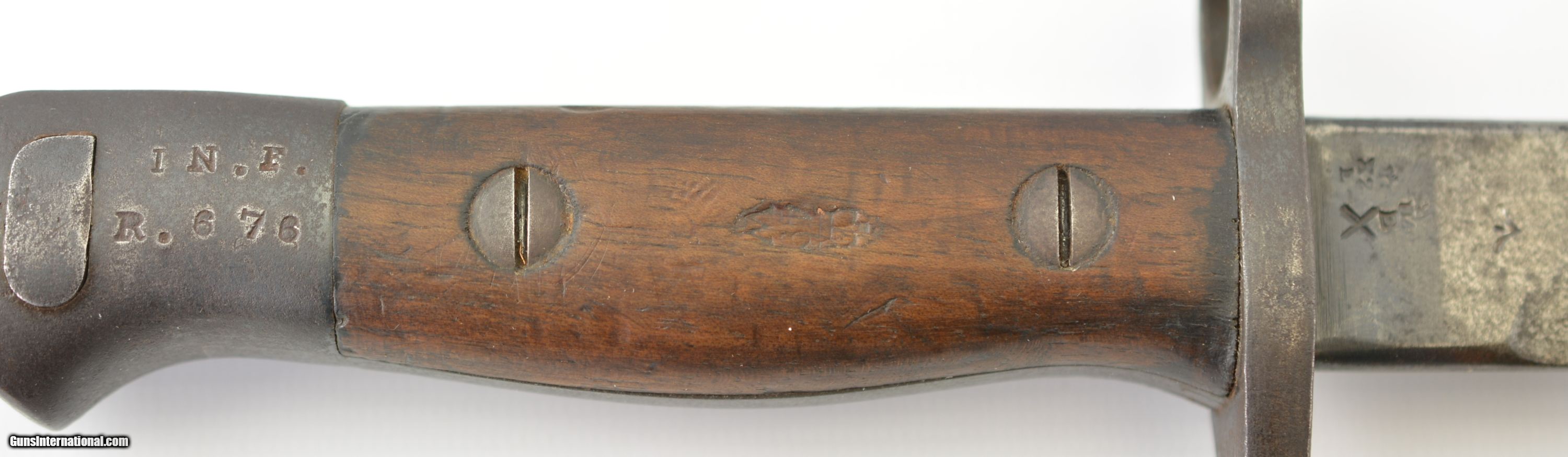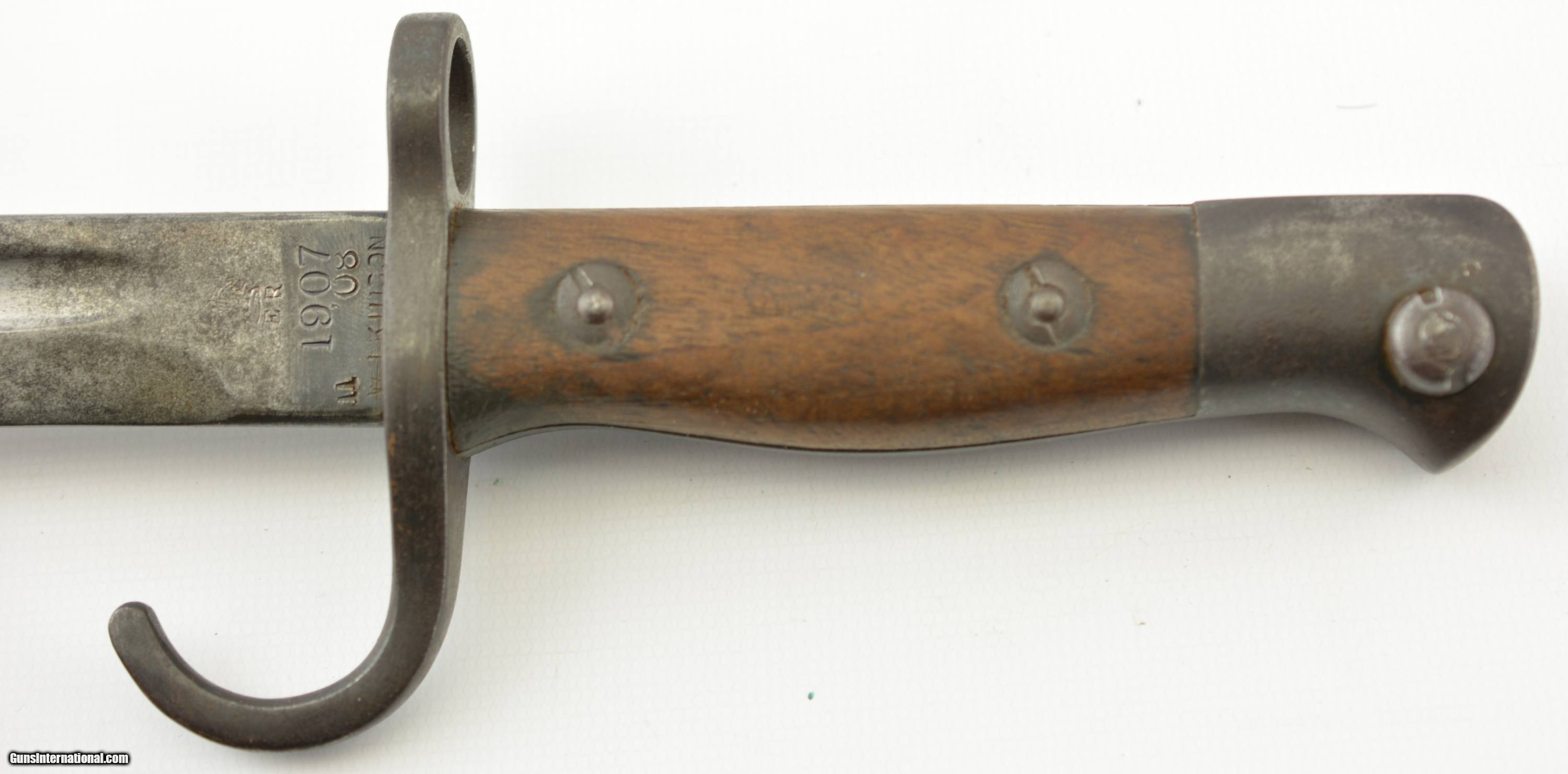 Description: This is a very scarce British Hooked Quillion Pattern 1907 bayonet manufactured by Wilkinson and includes a proper first year scabbard. This example is dated 11/1908 and the ricasso is marked "Crown/ER/1907/11/08/Wilkinson" Reverse is marked with a Broad Arrow, 2 inspector marks and proof. Only about 25,575 Wilkinson bayonets manufactured 1908-1911 compared to about 175,000 by Enfield. Wooden grips are marked "CROWN/49" with inspectors mark. Pommel is unit marked "IN.F R.676" The Royal Inskilling Fusileers" an English Militia Infantry Unit. Mouth of the very early original MK I scabbard is matching "R.676" The internal chape has only the iron tip visible. Leather is marked "BROAD ARROW/AC/CROWN/INSPECTOR 09/INSPECTOR" Pattern 1907 hooked quillion bayonets are not common. Please see pages 186-187 of British Commonweath Bayonets by Skeenerton & Richardson. SOLD Manufacturer: Enfield Model: Bayonet |