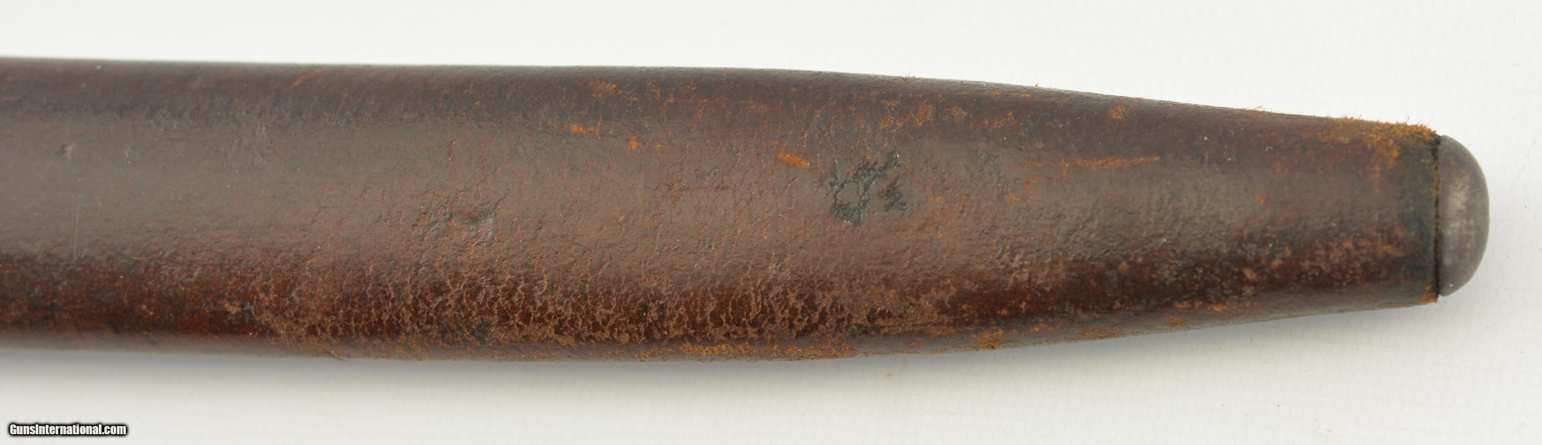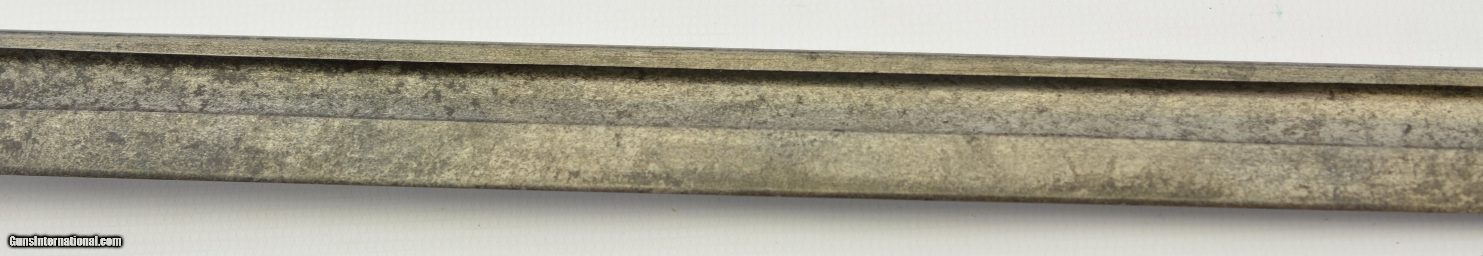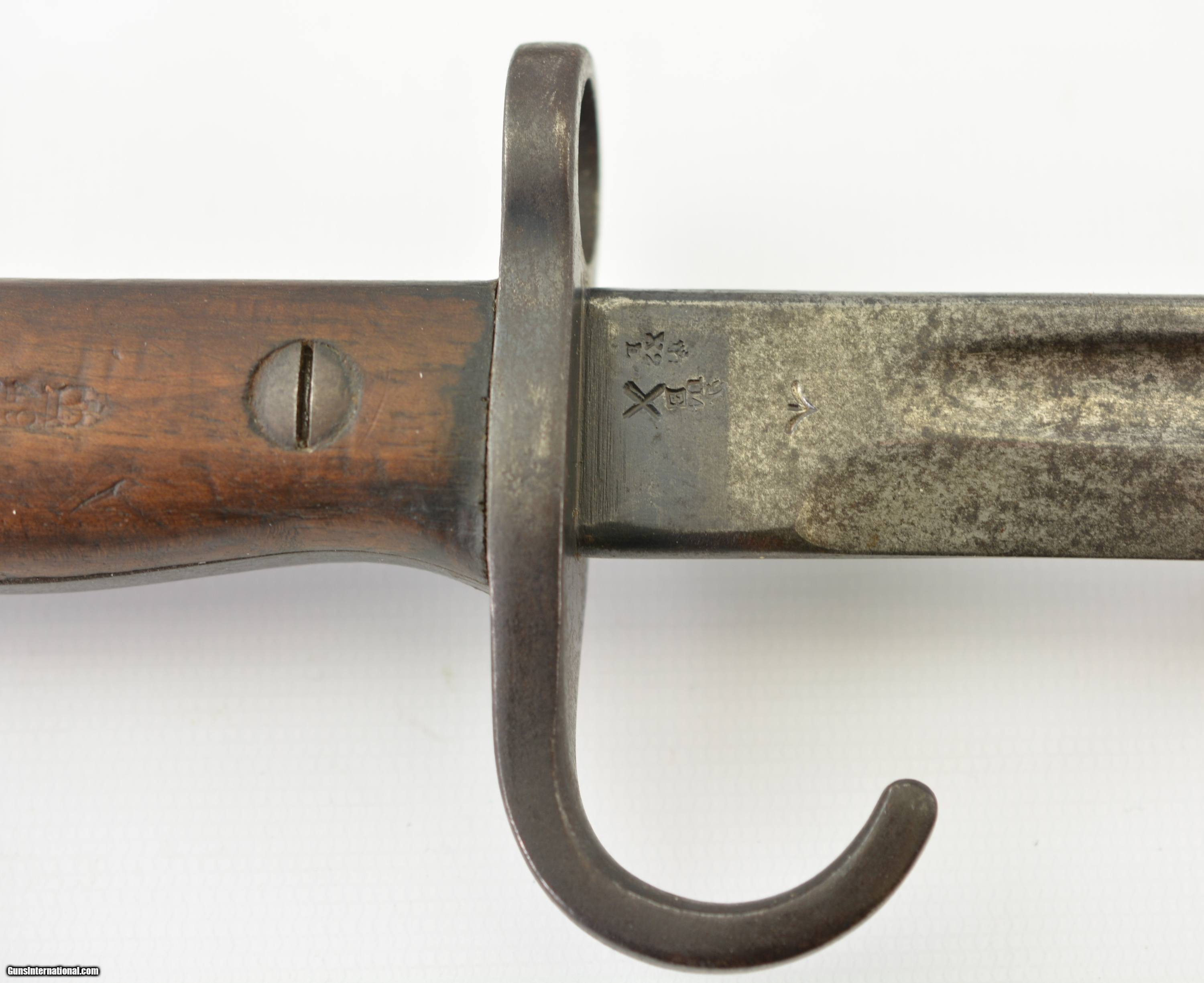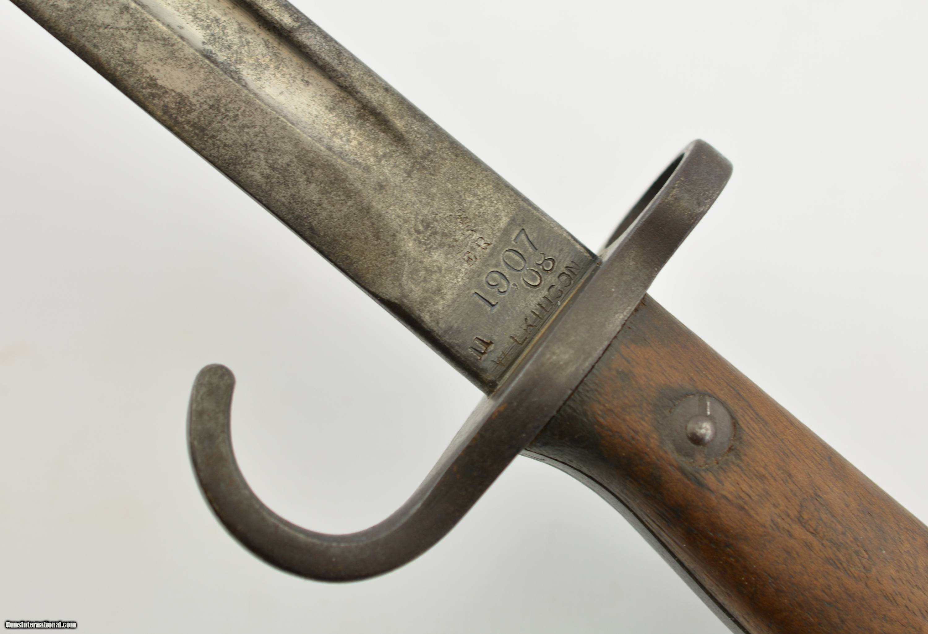 Description: This is a very scarce British Hooked Quillion Pattern 1907 bayonet manufactured by Wilkinson and includes a proper first year scabbard. This example is dated 11/1908 and the ricasso is marked "Crown/ER/1907/11/08/Wilkinson" Reverse is marked with a Broad Arrow, 2 inspector marks and proof. Only about 25,575 Wilkinson bayonets manufactured 1908-1911 compared to about 175,000 by Enfield. Wooden grips are marked "CROWN/49" with inspectors mark. Pommel is unit marked "IN.F R.676" The Royal Inskilling Fusileers" an English Militia Infantry Unit. Mouth of the very early original MK I scabbard is matching "R.676" The internal chape has only the iron tip visible. Leather is marked "BROAD ARROW/AC/CROWN/INSPECTOR 09/INSPECTOR" Pattern 1907 hooked quillion bayonets are not common. Please see pages 186-187 of British Commonweath Bayonets by Skeenerton & Richardson. SOLD Manufacturer: Enfield Model: Bayonet |