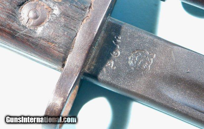 Description: SIAMESE PATTERN 1920 SMLE 1907 TYPE BAYONET & SCABBARD BY BSA. 22" overall with 17 1/4" stop fullered blade in original blue. No signs of use or damage with original slight edge. Ricasso stamped with Wild Tiger Corps stamp and other acceptance stamps crisp. Wood grip panels held by unturned screws. Correct steel scabbard with original 1907 mounts affixed. Scabbard with no dings or crimps. One of 10,000 ordered by King Rama VI from Birmingham Small Arms. SOLD |