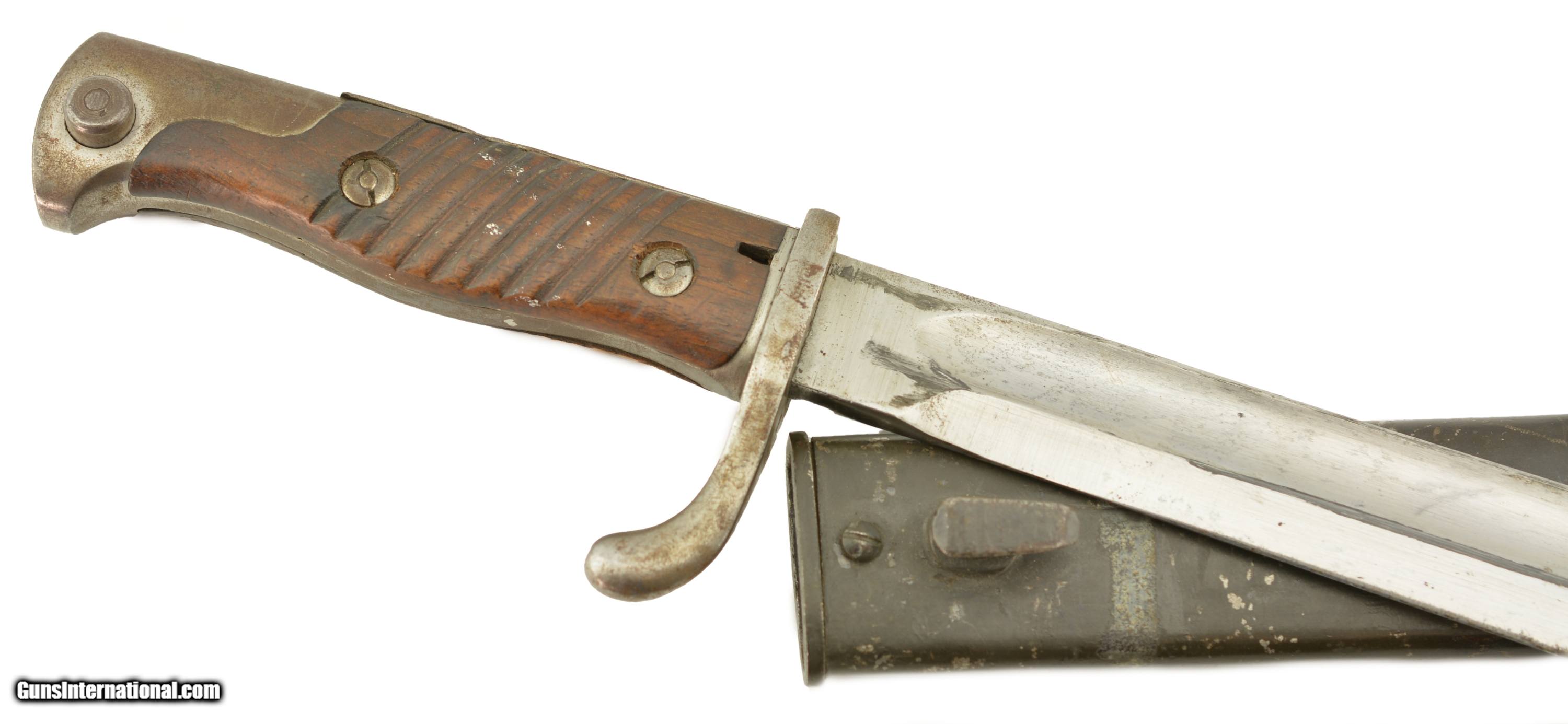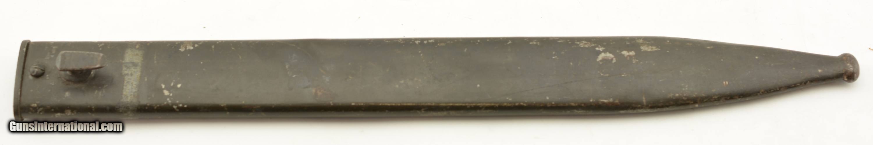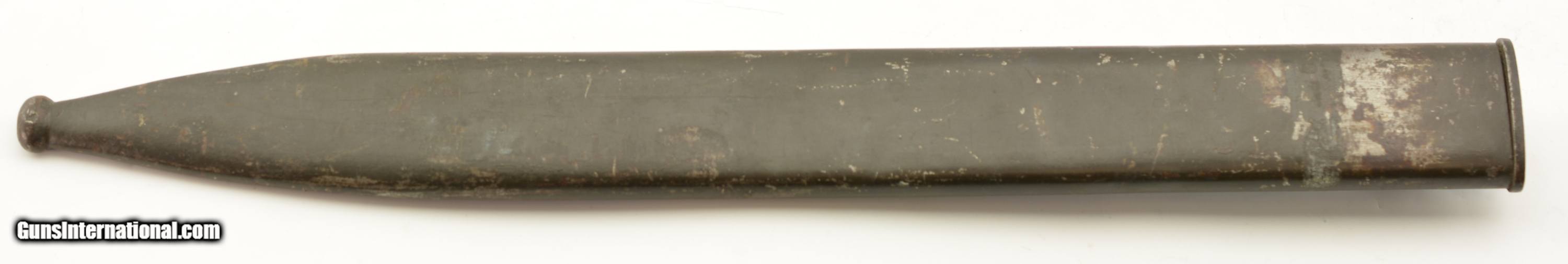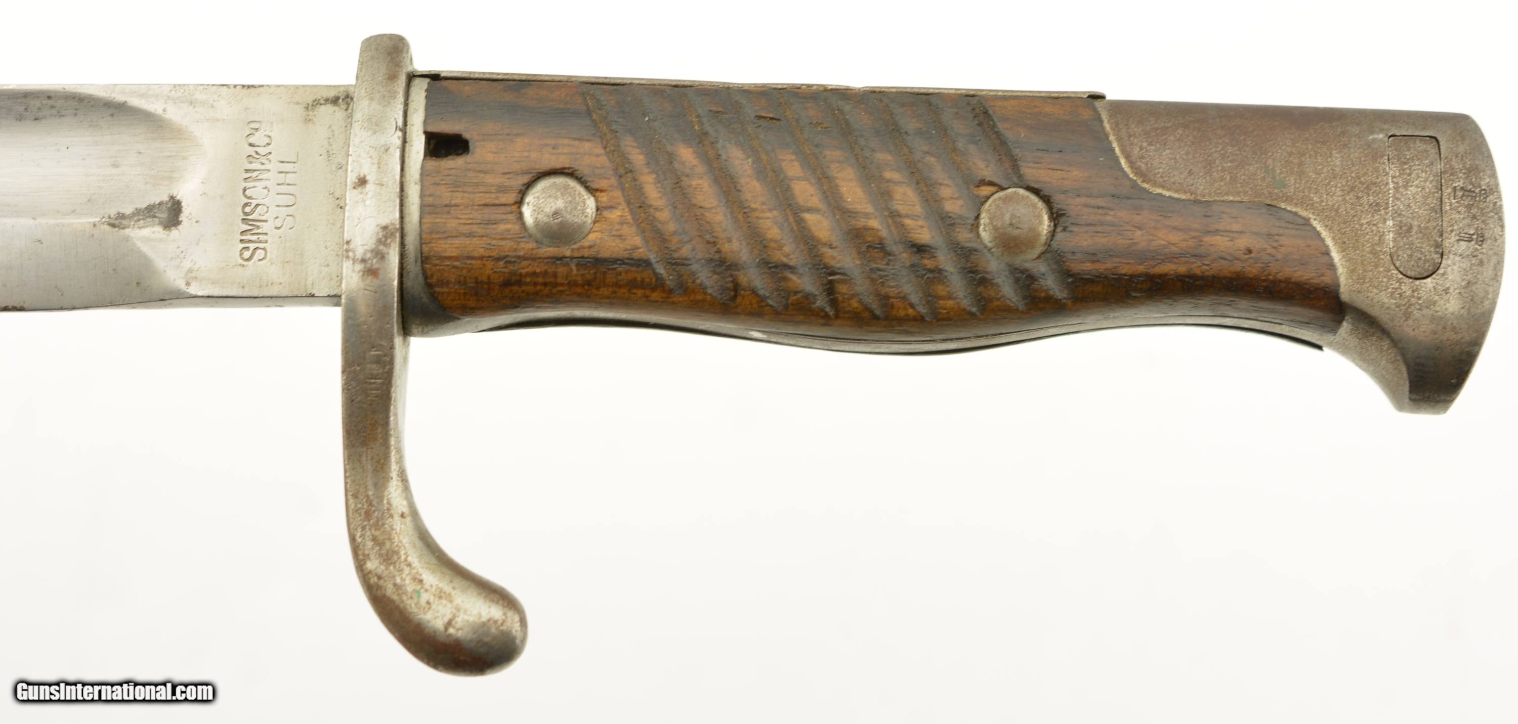 Description: German M1898/05 rifle Bayonet & scabbard WWI for 98 Mauser. This is a nice example of a, Simson & CO Suhl, early type 05 with a part muzzle ring and with flash guard. The blade is fine original condition, no chip with correct tip, length is correct at 14 3/8". Handle is also in fine shape. Very little surface rust on handle. Spine markings correct with manufacture date of 1916. Scabbard has normal wear for age. Light scratches and wearmarks from frog at top and one small lateral dent on hanging side. SOLD Manufacturer: German Model: Bayonet |