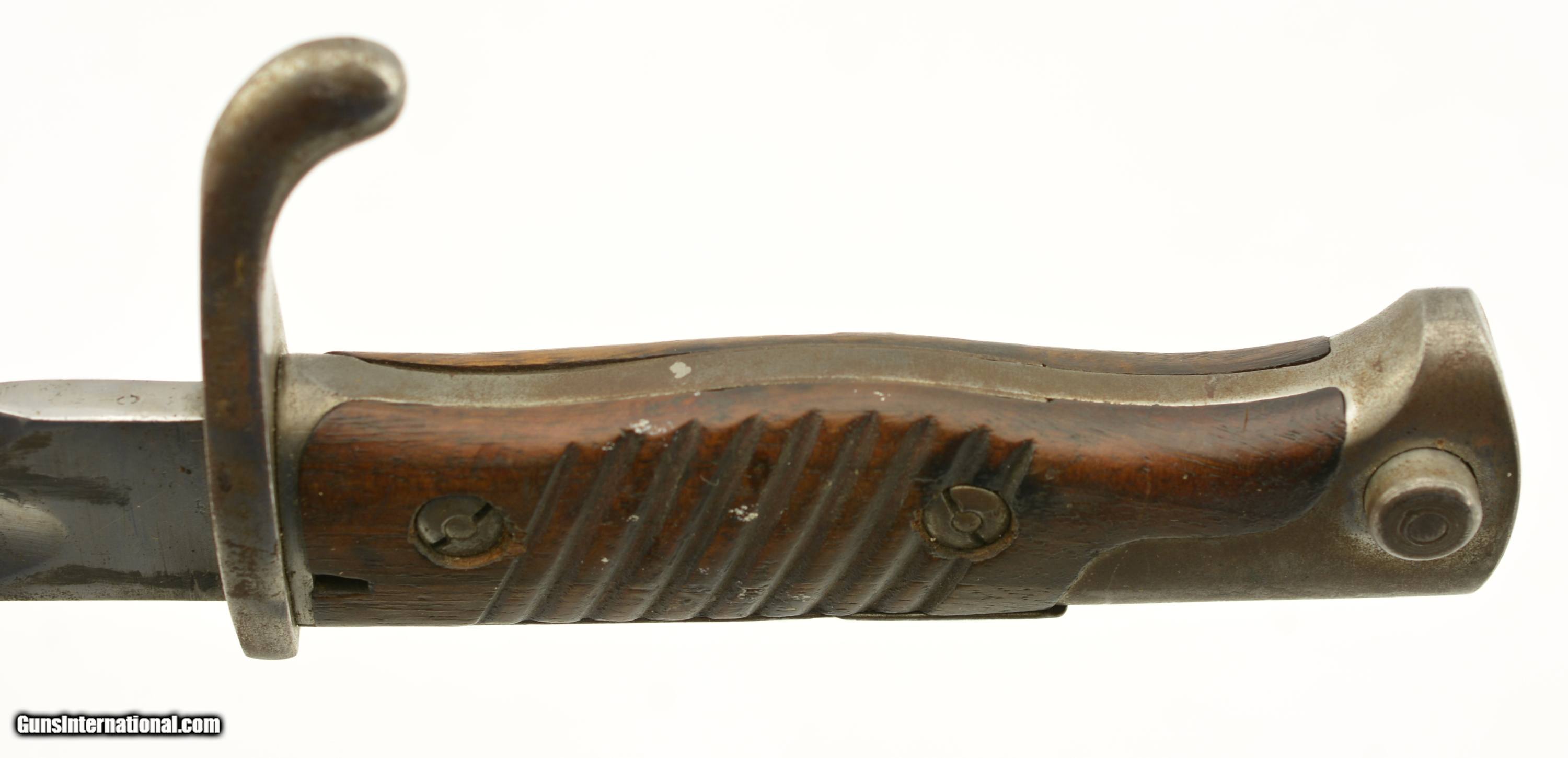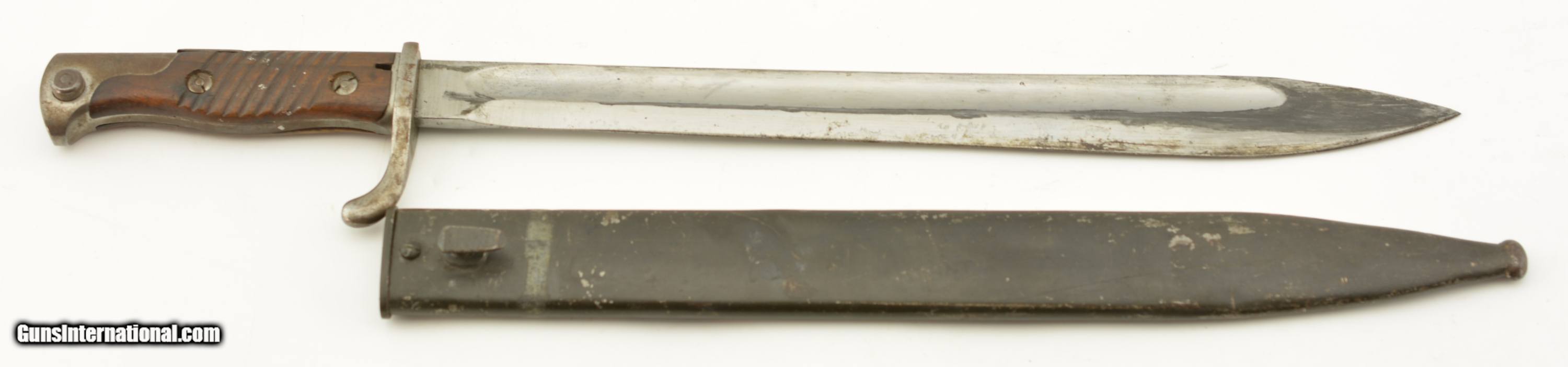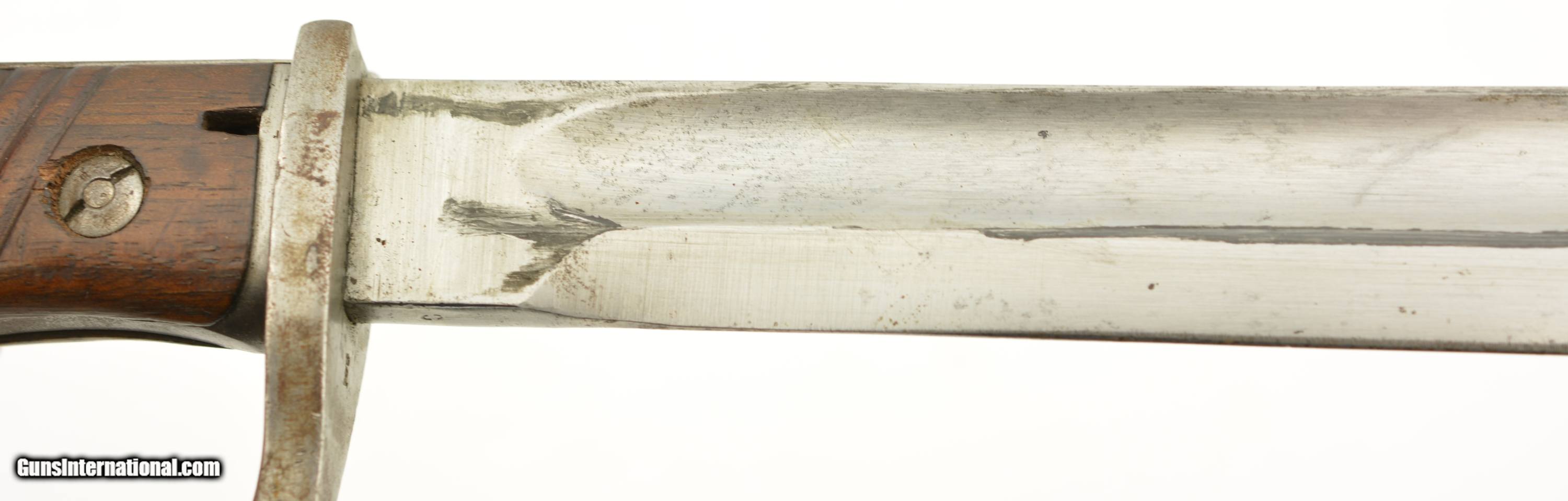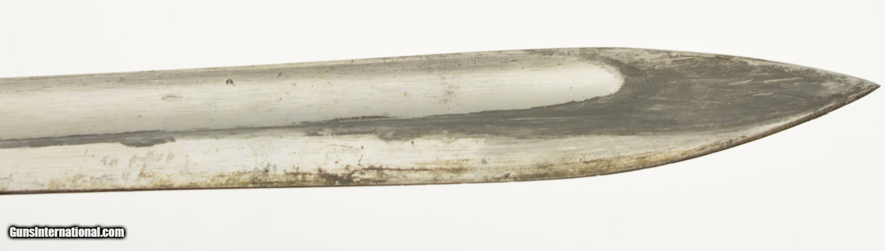 Description: German M1898/05 rifle Bayonet & scabbard WWI for 98 Mauser. This is a nice example of a, Simson & CO Suhl, early type 05 with a part muzzle ring and with flash guard. The blade is fine original condition, no chip with correct tip, length is correct at 14 3/8". Handle is also in fine shape. Very little surface rust on handle. Spine markings correct with manufacture date of 1916. Scabbard has normal wear for age. Light scratches and wearmarks from frog at top and one small lateral dent on hanging side. SOLD Manufacturer: German Model: Bayonet |