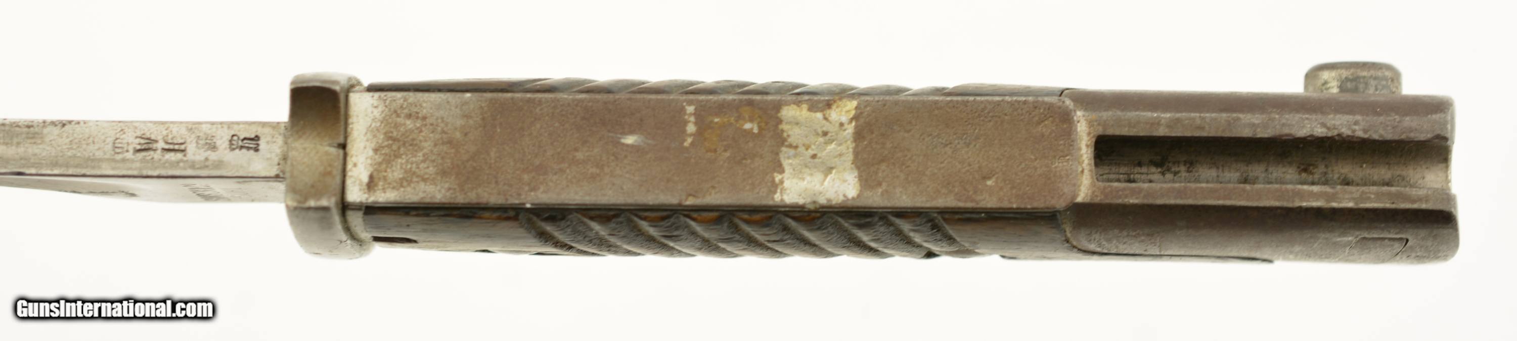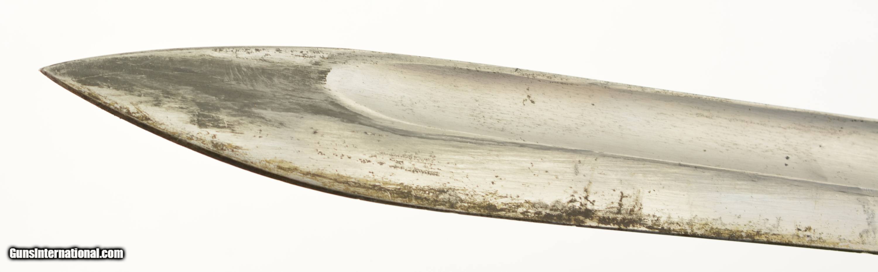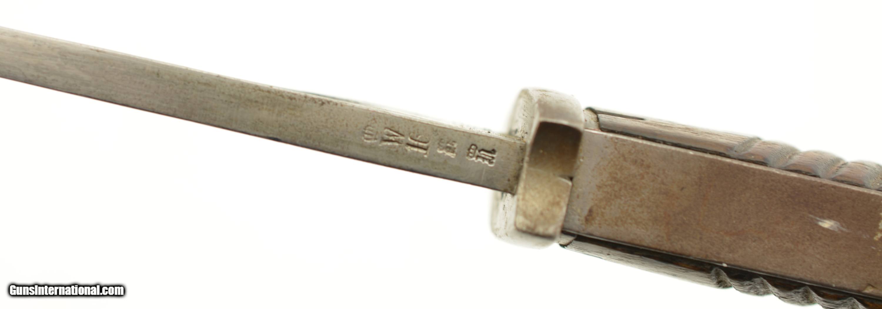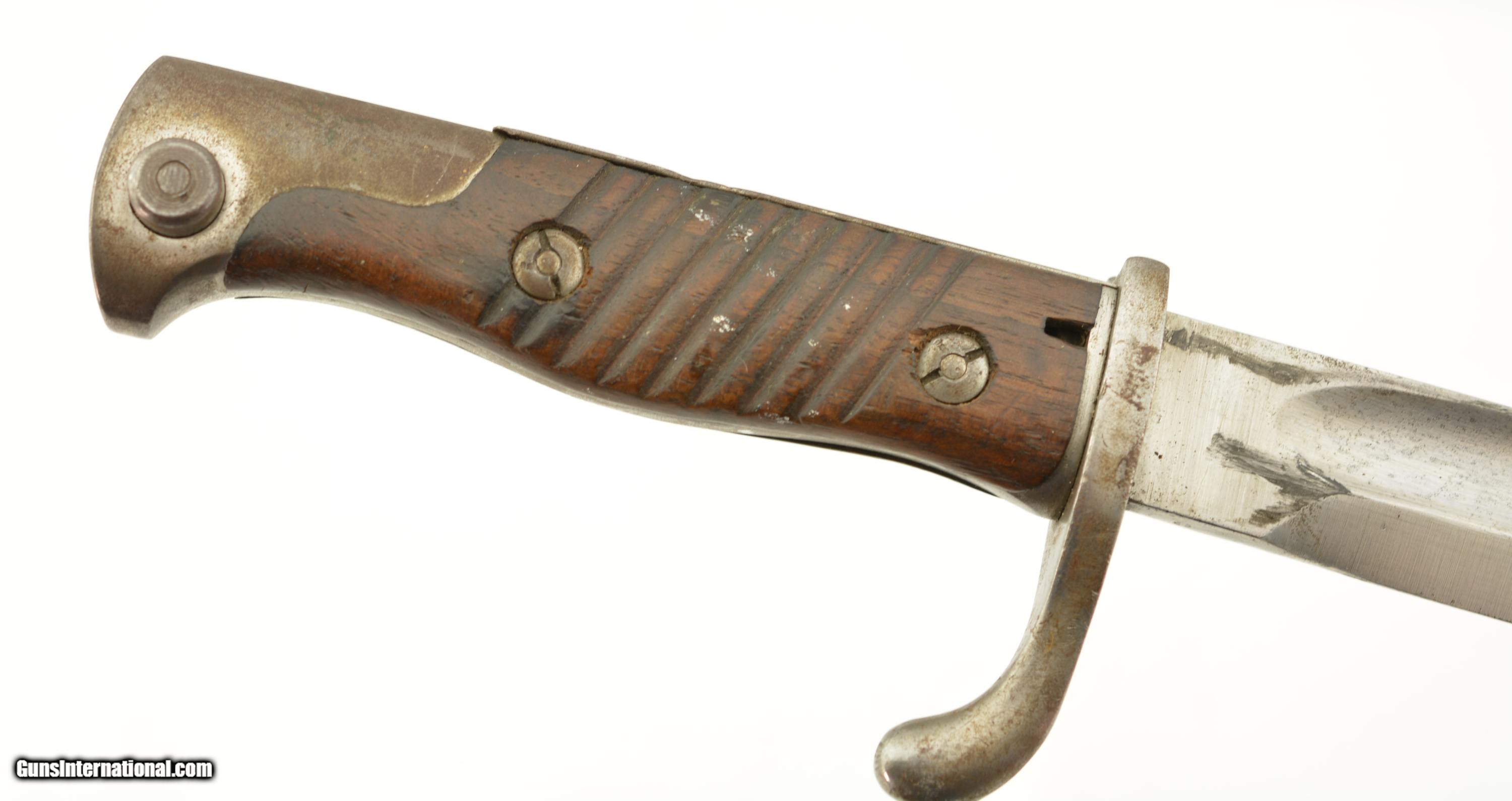 Description: German M1898/05 rifle Bayonet & scabbard WWI for 98 Mauser. This is a nice example of a, Simson & CO Suhl, early type 05 with a part muzzle ring and with flash guard. The blade is fine original condition, no chip with correct tip, length is correct at 14 3/8". Handle is also in fine shape. Very little surface rust on handle. Spine markings correct with manufacture date of 1916. Scabbard has normal wear for age. Light scratches and wearmarks from frog at top and one small lateral dent on hanging side. SOLD Manufacturer: German Model: Bayonet |