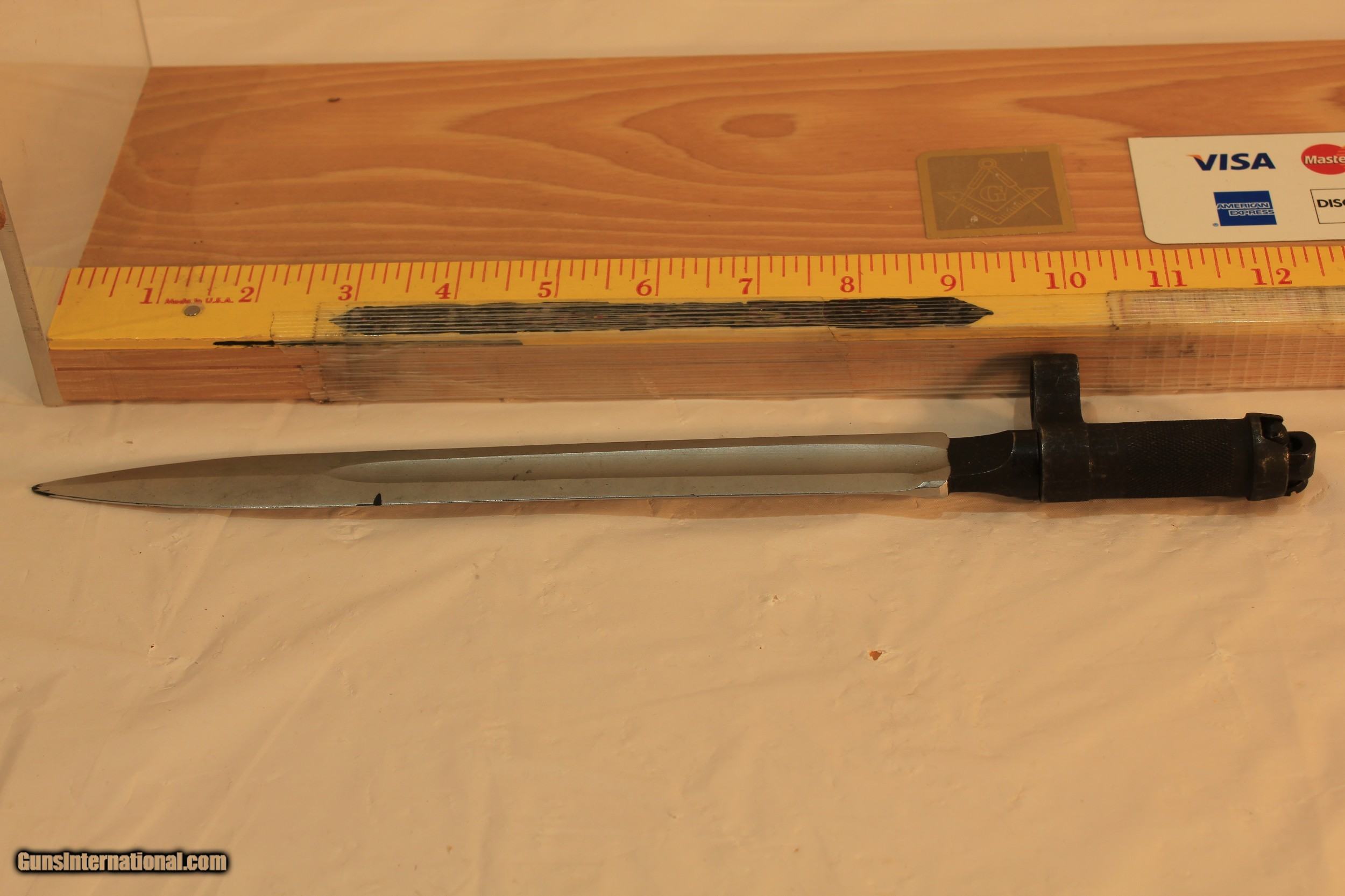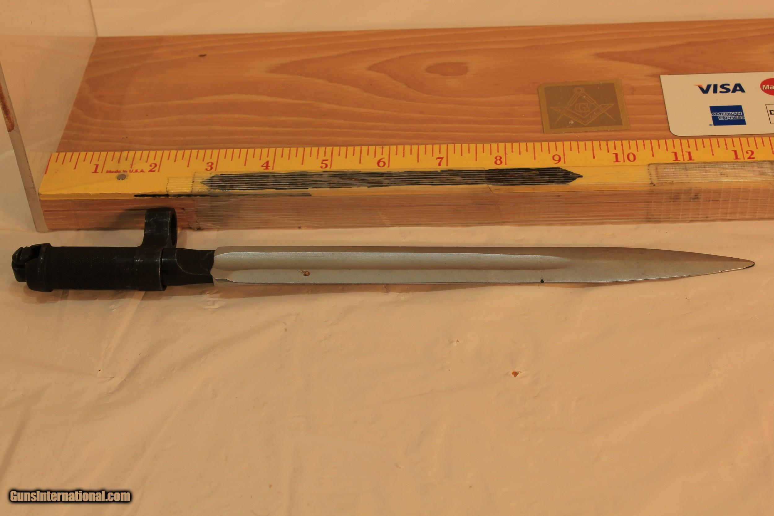 Description: I am not sure just what this is so you are on your own. This is a folding bayonet that folds back under the weapon and has a loop to secure the bayonet to the gun barrel. The screw and spring are intact. The knife blade is 12 1/4 inches overall and the blade is 9 inches. The pictures are part of the description and please use the ZOOM feature SOLD |