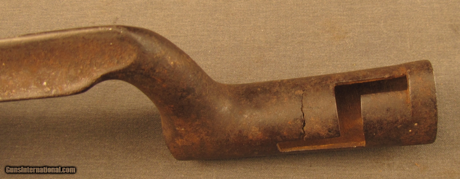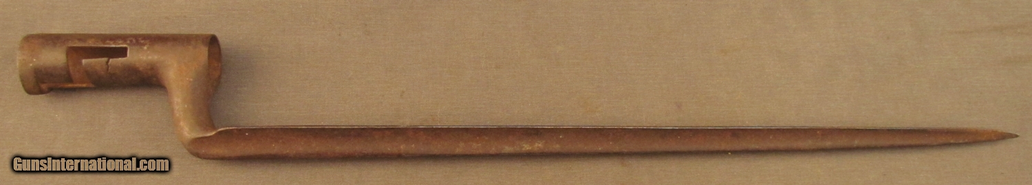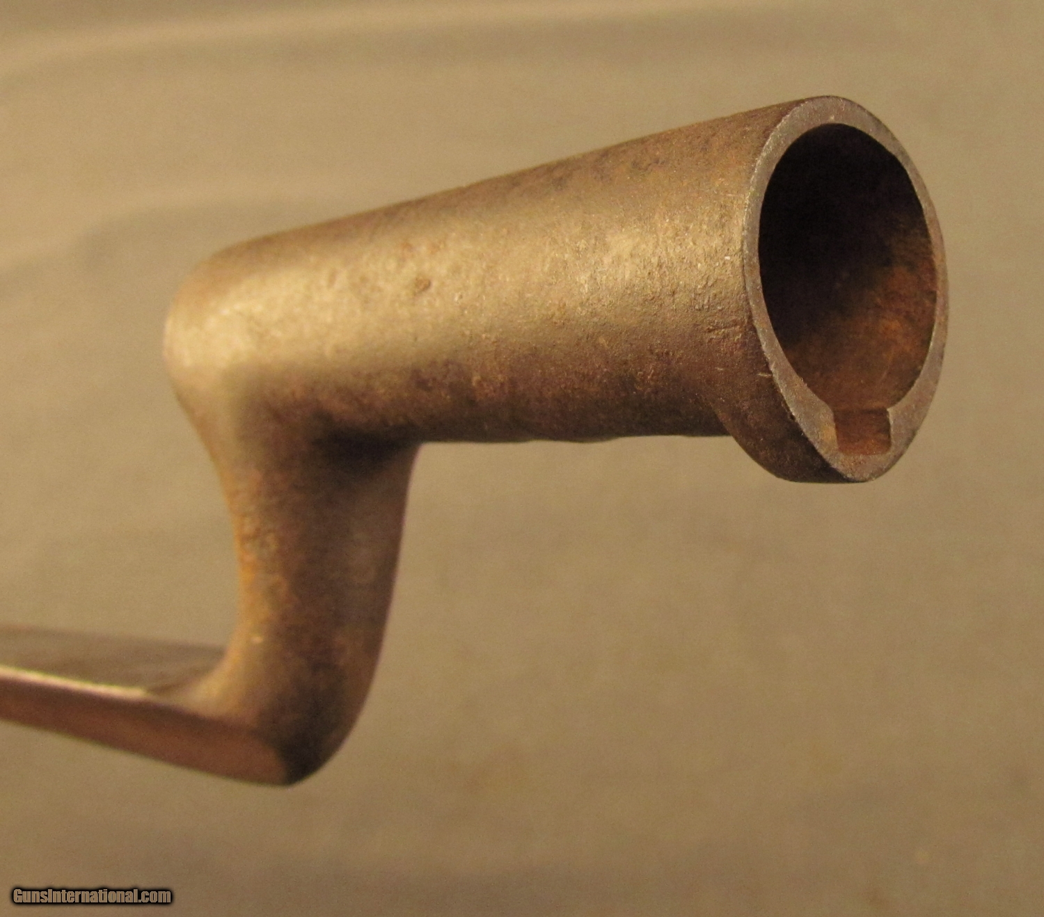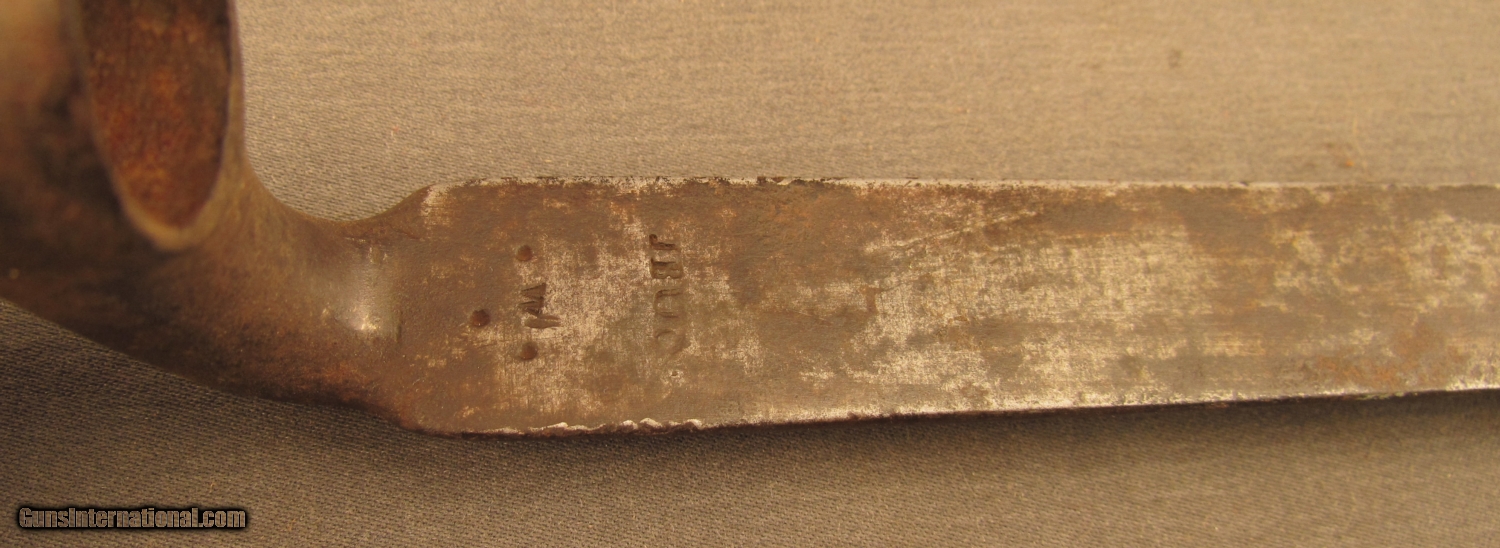 Description: This 19 inch bayonet features a small bridge, L shaped mortice and flat faced blade with "JBUS" stamping over a "W" with 3 punch dots around it. The 3 5/16 inch socket has a "S" at end of mortice with an inside diameter of .850 inches. These features including the punch dots are discussed on page 24 of Reilly's American socket bayonets. Surfaces shows a dark patina with staining, oxidation and areas of light pitting. Socket has a half inch crack adjacent to mortice. A very good example of this early American bayonet. SOLD Manufacturer: Spfld Model: 1795 |