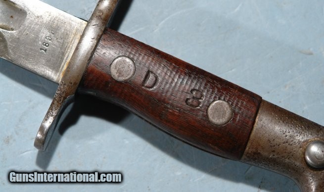 Description: SPANISH-AMERICAN WAR ERA 10TH NEW YORK VOLUNTEERS SPRINGFIELD KRAG U.S. MODEL 1892 BAYONET DATED 1899 W/SCABBARD. All original and excellent. Scabbard with nearly all the blue and blade with the original polish and good “US” and date stamp. Grip scales stamped “10 N.Y./D 3”. SOLD |