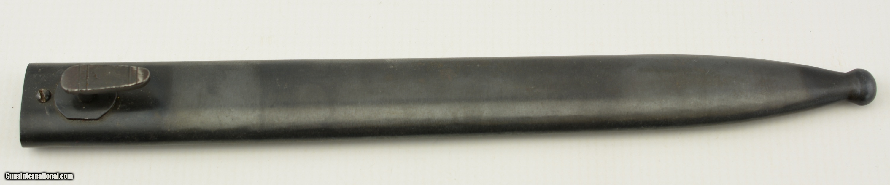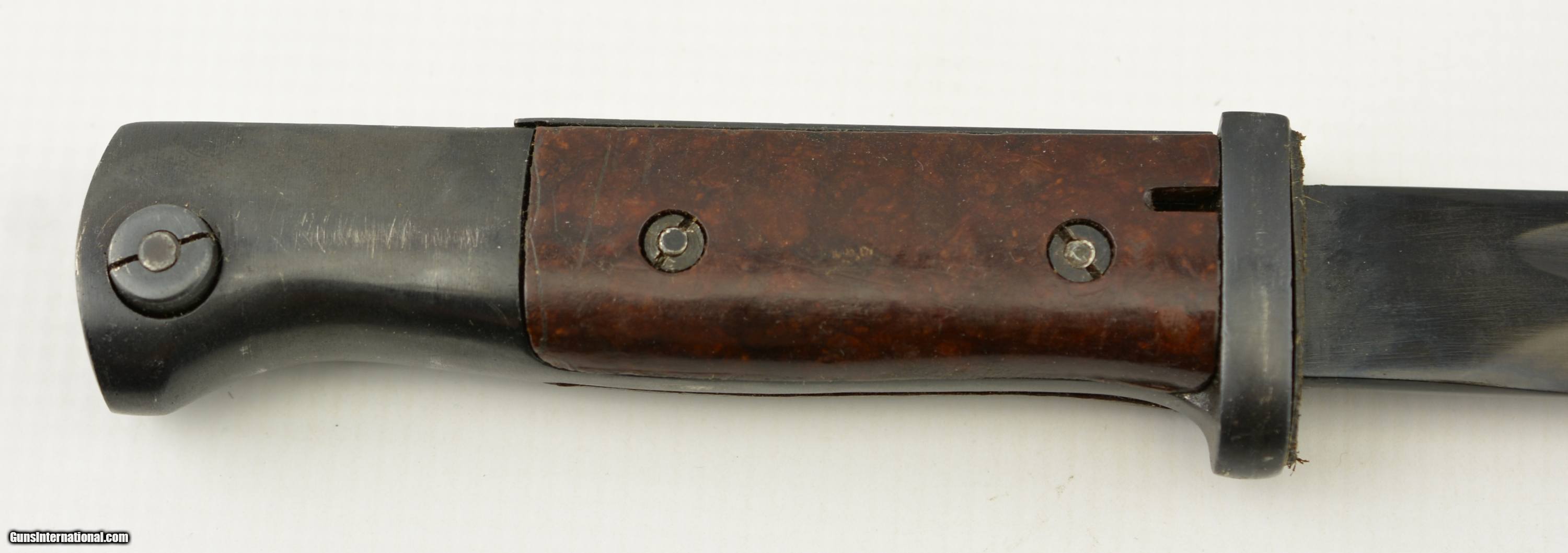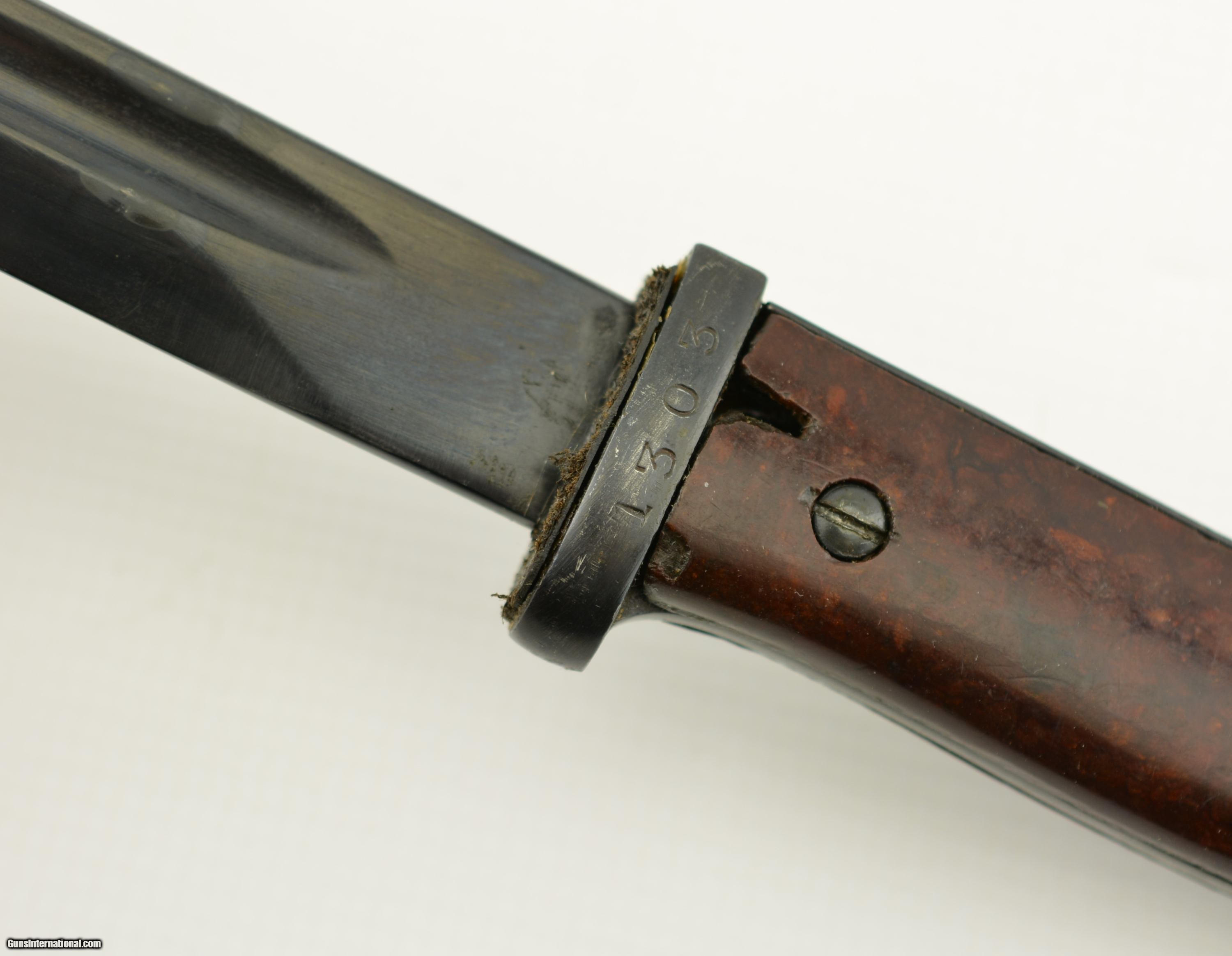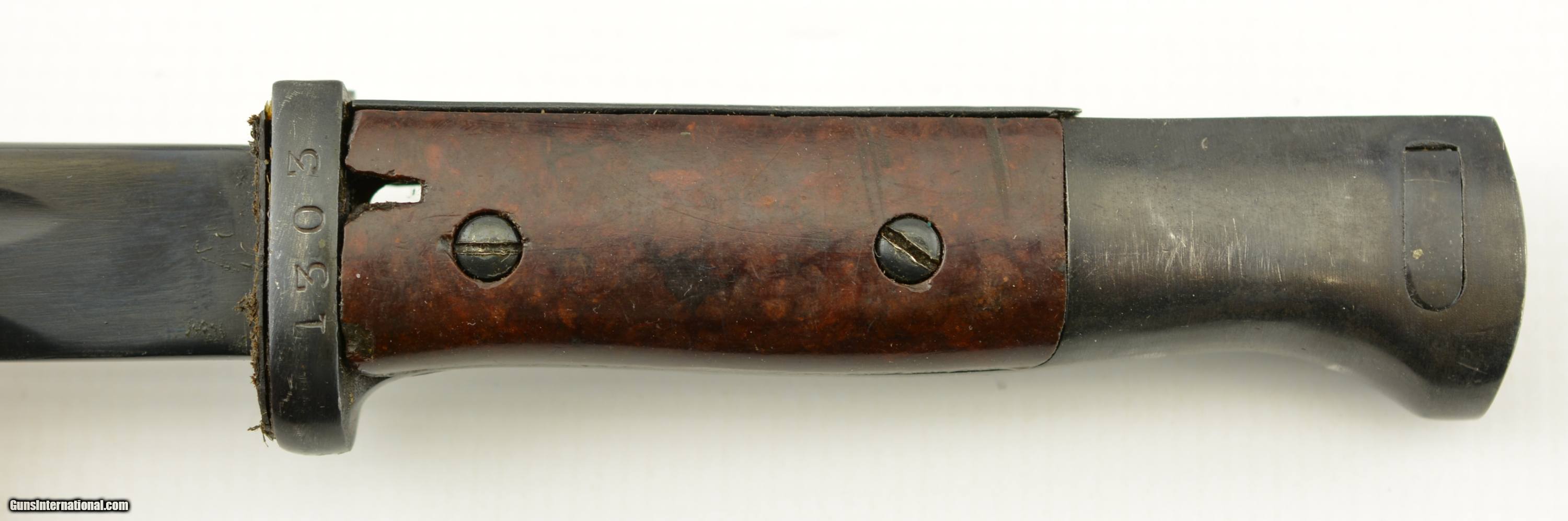 Description: This Spanish bayonet features an unmarked refurbished blade with fine pitting under finish, flashguard and rearely seen red composite grips. The only marks are "1303" on guard. The grips show wear, a few scratches and a couple chips. A very good example of this Spanish weapon. SOLD Manufacturer: Spanish Model: Bayonet |