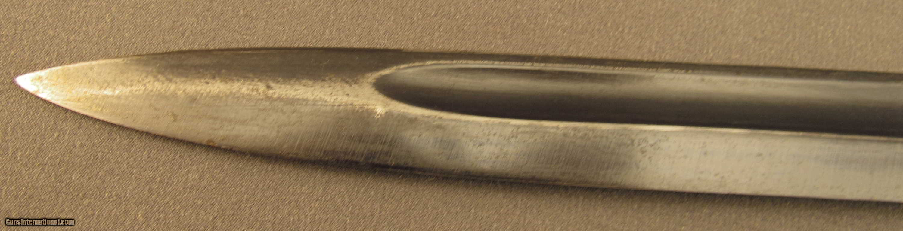 Description: This Spanish mauser bayonet is in very good condition with refurbished blade showing light pitting scattered beneath finish and retaining 90% blue. Crossguard shows stamped serial number. Wood grips are in very good condition with marks from use. SOLD Manufacturer: Spanish Model: 1943 |