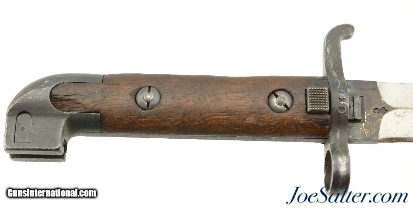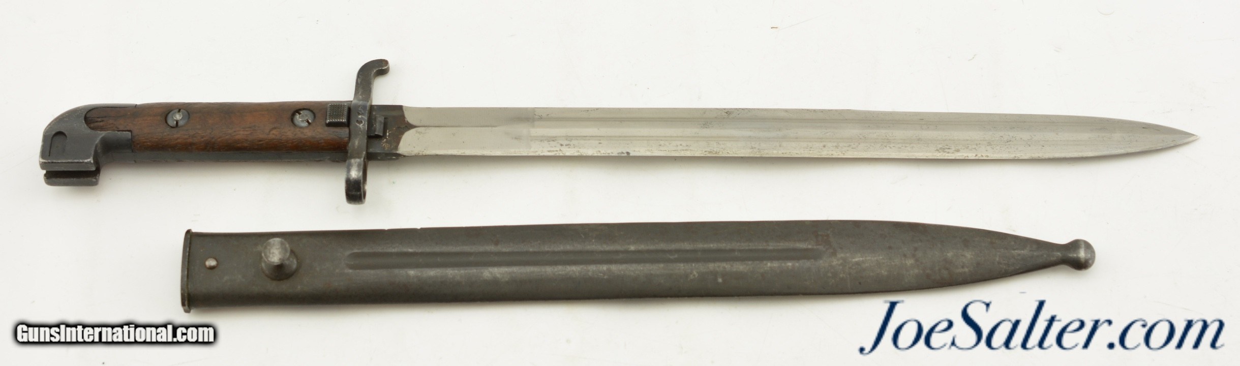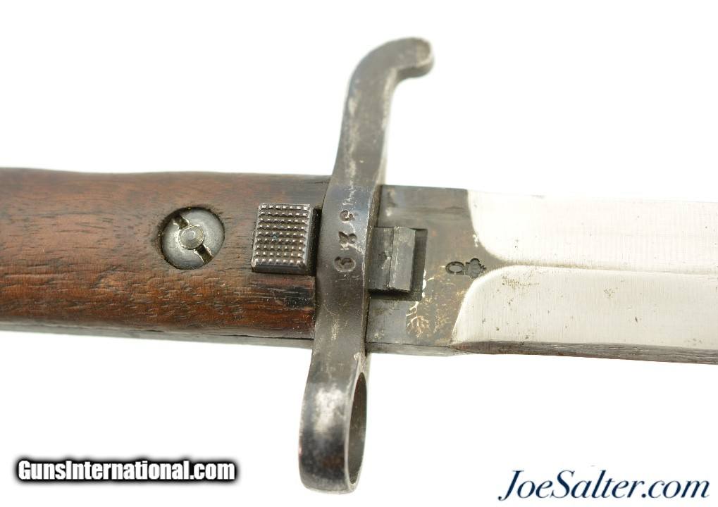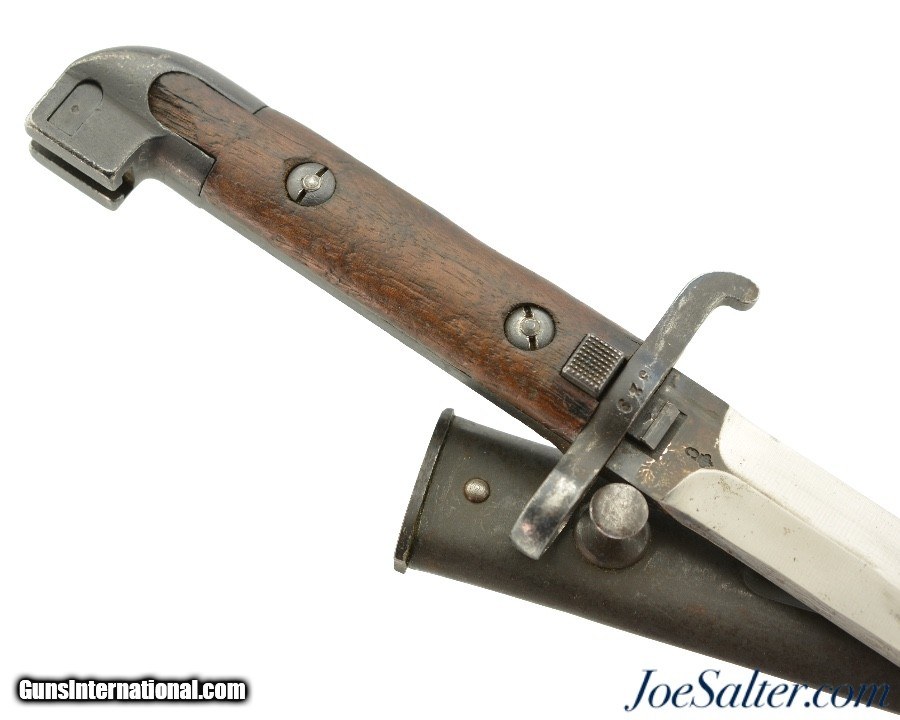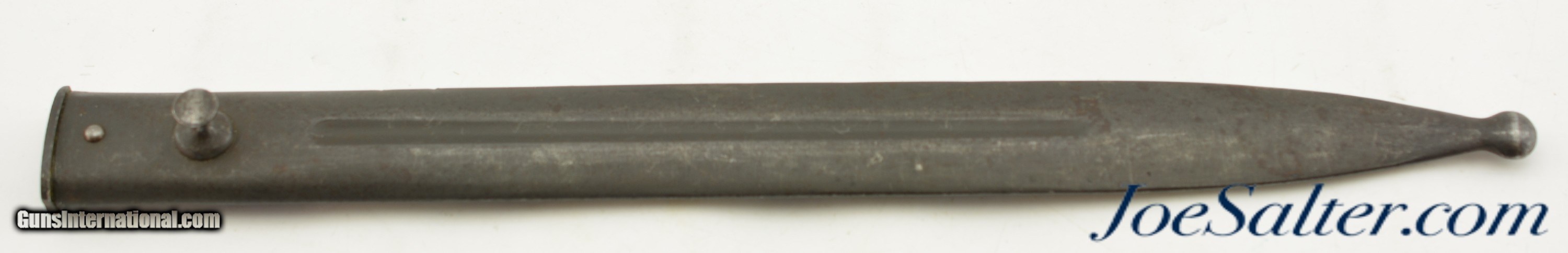 Description: This is an original Swedish M1894/14 Bayonet with Scabbards. The excellence condition unsharpened 13 1/4" blade is marked on the ricasso, Crown and the revere Crown over C. The rest of the blade is bright with almost no signs of use. The guard and pommel have most of the original finish with the gaurd being marked "329" reverse "4/K7 No 200" The wood handle is in good condition with lots of dents, dings, no cracks or ships and nice patina. The all steel scabbard is in very good condition with little finish and Crown marked.; Price: $239.00 Contact Seller |