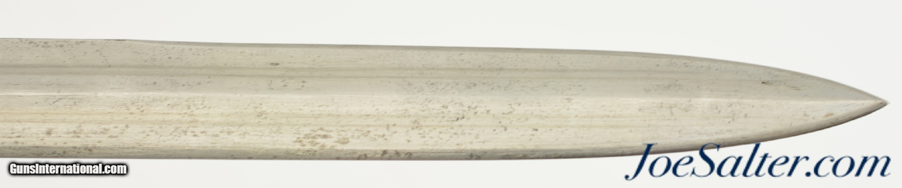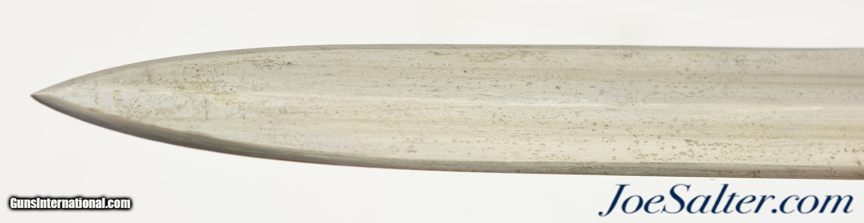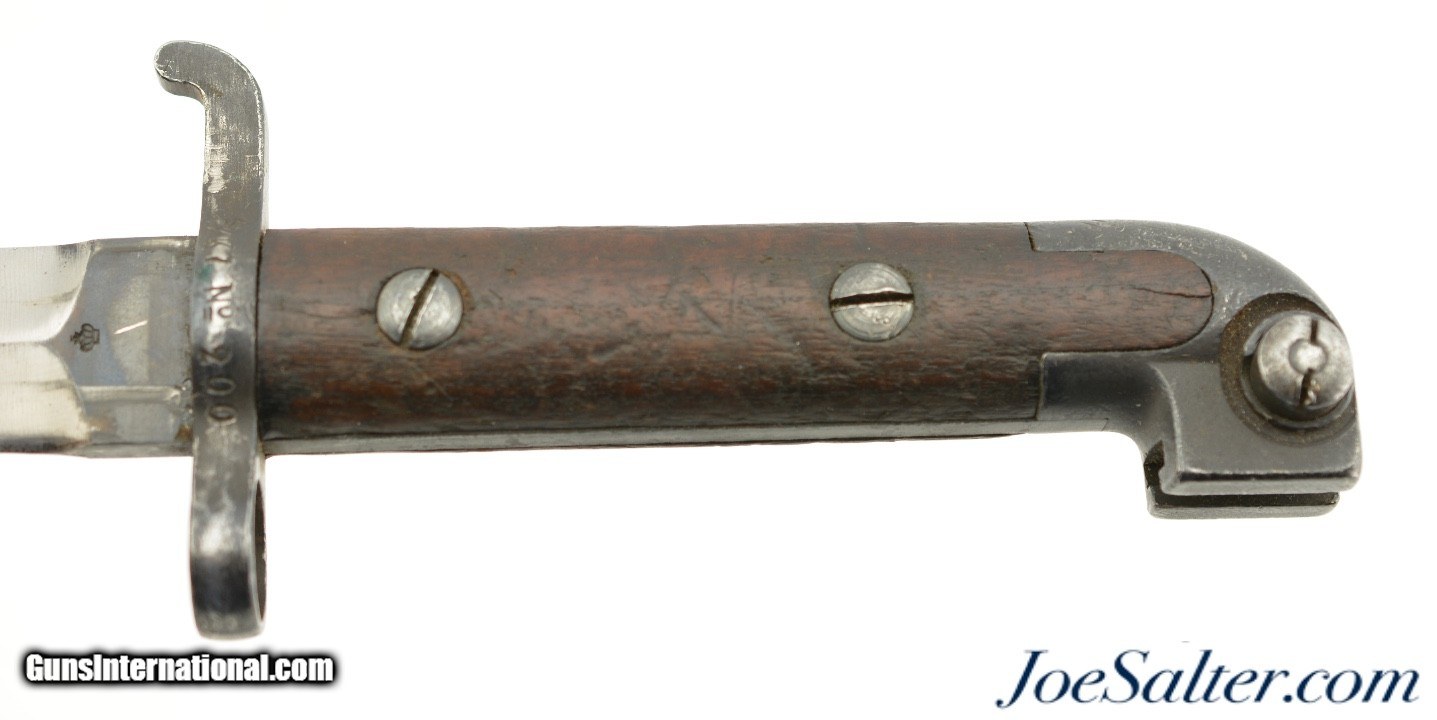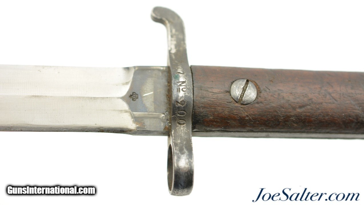 Description: This is an original Swedish M1894/14 Bayonet with Scabbards. The excellence condition unsharpened 13 1/4" blade is marked on the ricasso, Crown and the revere Crown over C. The rest of the blade is bright with almost no signs of use. The guard and pommel have most of the original finish with the gaurd being marked "329" reverse "4/K7 No 200" The wood handle is in good condition with lots of dents, dings, no cracks or ships and nice patina. The all steel scabbard is in very good condition with little finish and Crown marked.; Price: $239.00 Contact Seller |