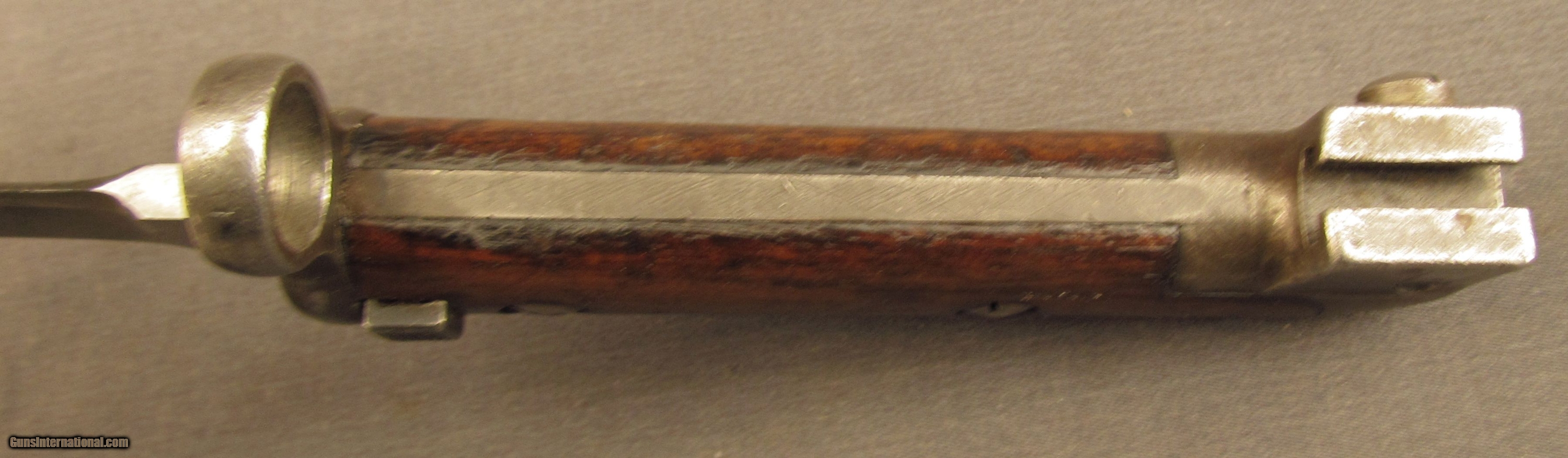 Description: Swedish Model 194 bayonet with steel gray parkerized scabbard. Overall length is 18” with a 13” blade. Ricasso marked “EJ/CROWN/AB” Wooden grips have some scattered dings and light marks. SOLD Manufacturer: Swedish Model: Bayonet |
