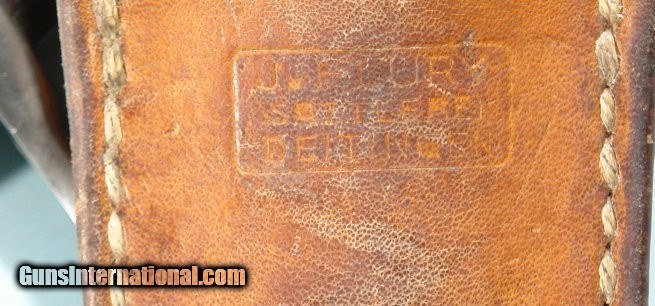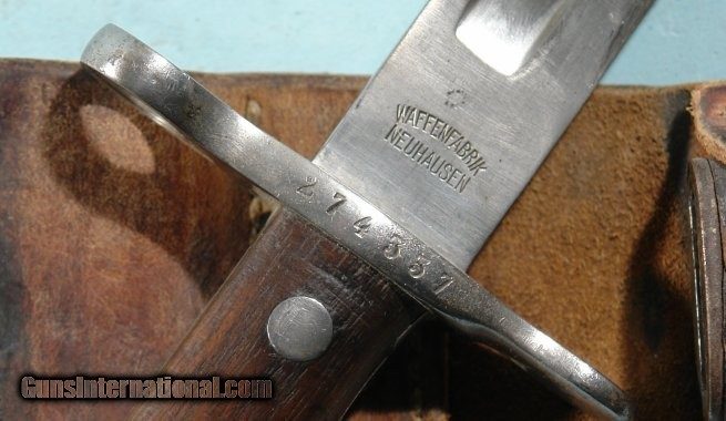 Description: SWISS MODEL 1889/11 BAYONET & SCABBARD FOR SCHMIDT RUBIN 1889, K11 (1911) OR K31 RIFLE. Serial number on hilt, "Waffenfabrik Neuhausen" on ricasso crisply struck with excellent fullered blade still in the white. Blade still has original false edge. Hilt, pommel and original wood grip panels also pristine. Leather covered (slightly scored) steel scabbard with leather frog having "J. Flury/ Sattlerei(saddlery)/ Deitingen" stamp on back along with "Sz" under Swiss cross. Drag tip with Swiss cross stamp as well. Prime example for the Schmidt Rubin 1889, 1911 or K31 rifle. SOLD |