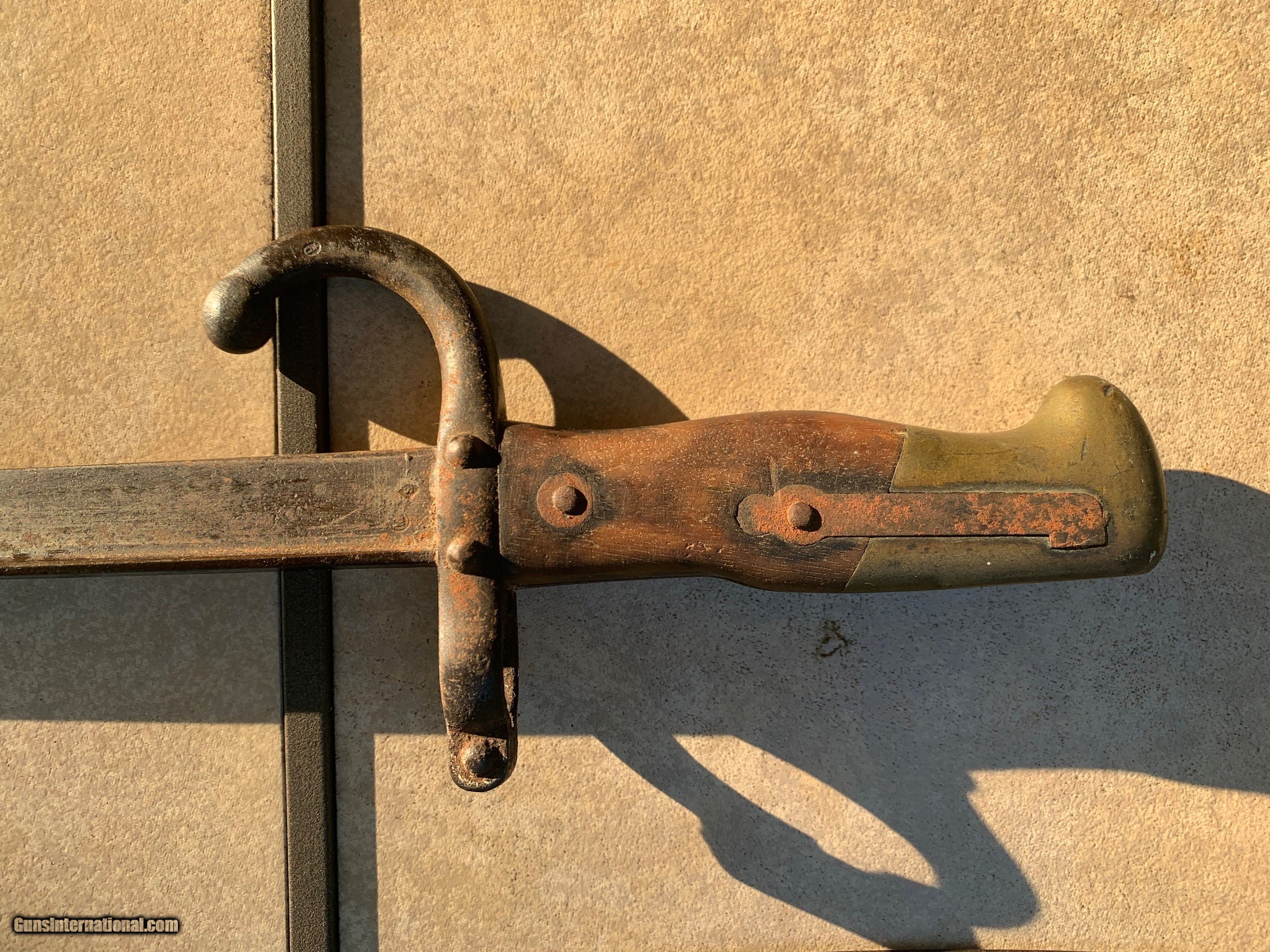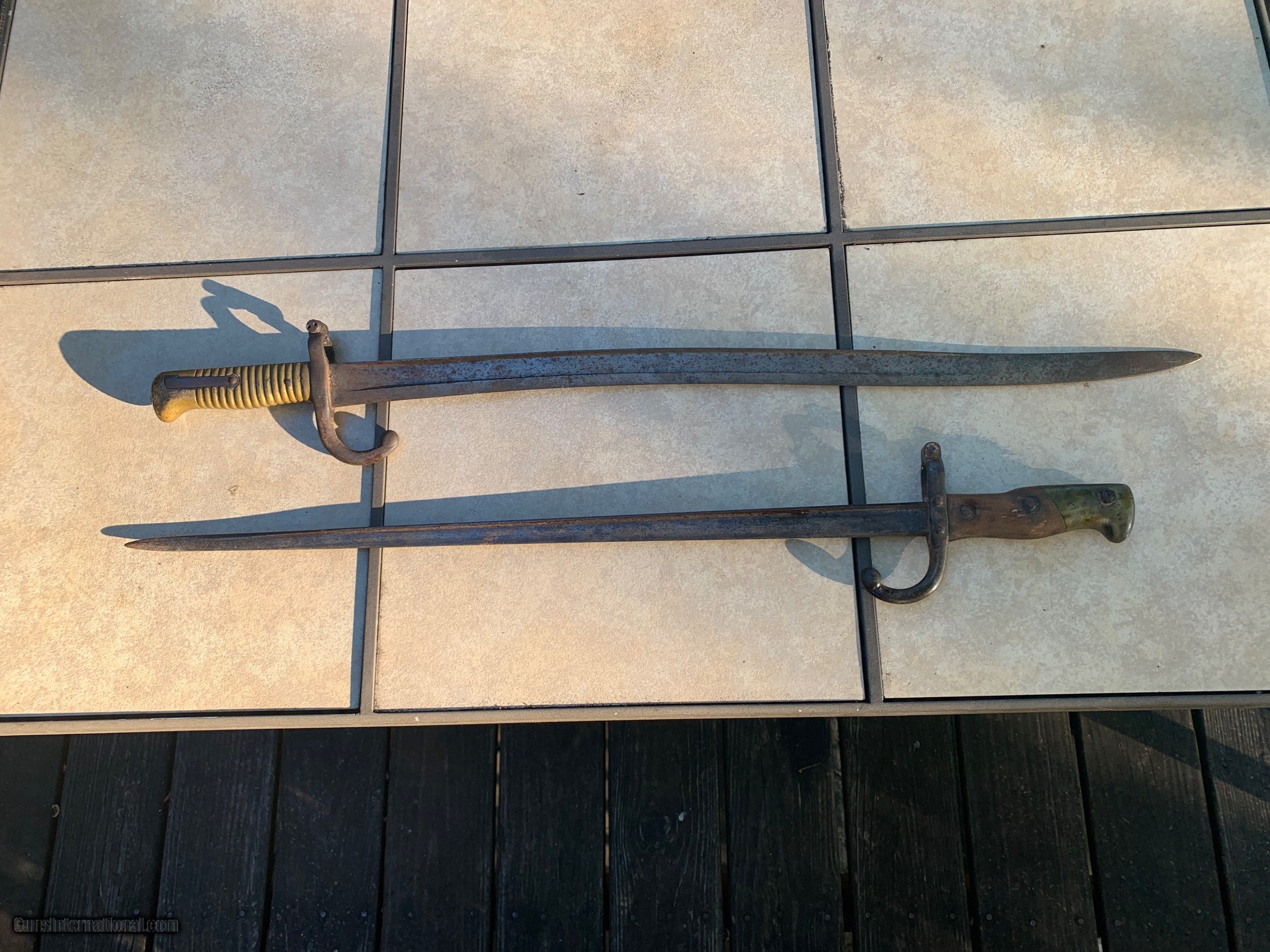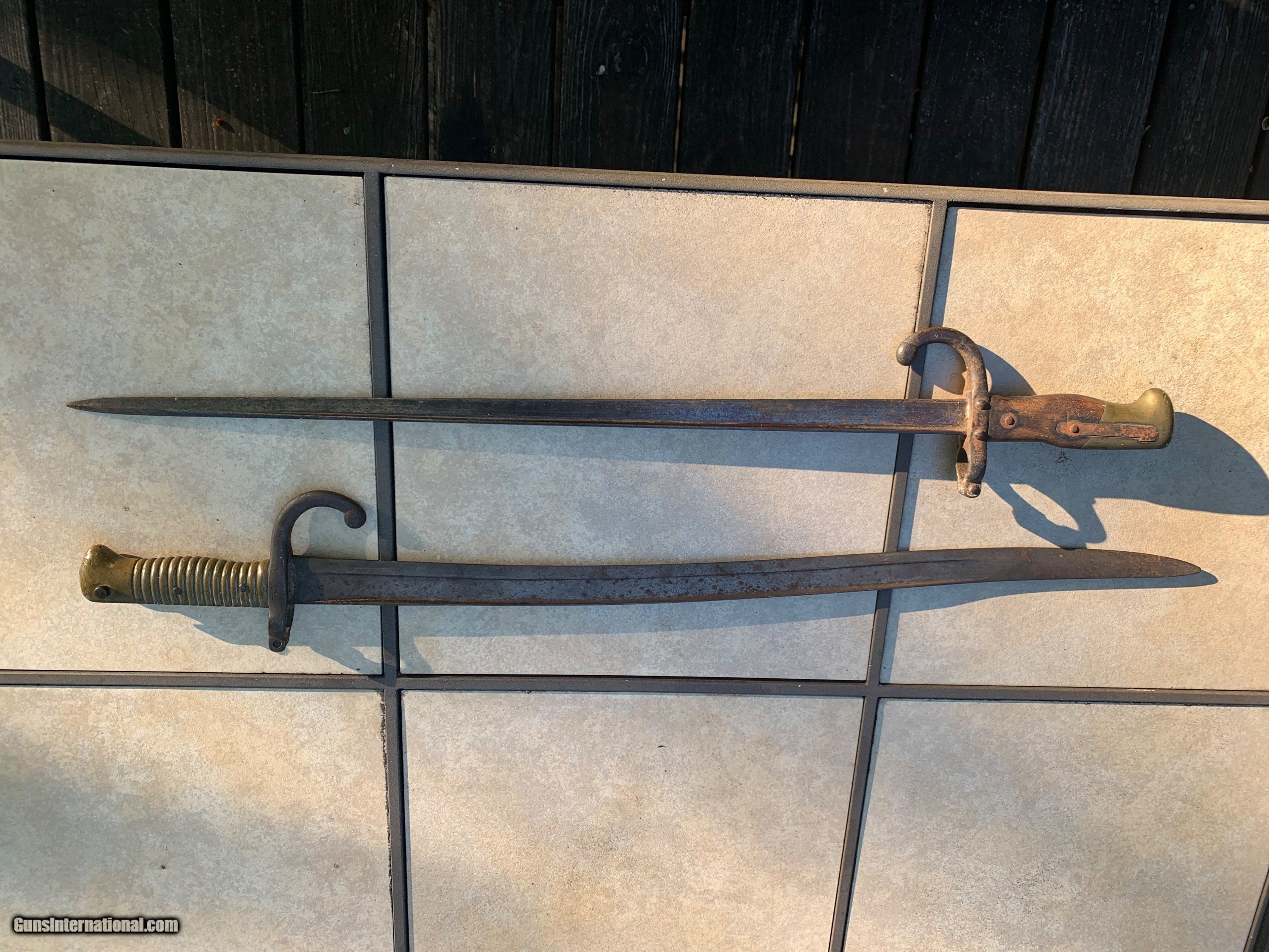 Description: Curved blade bayo inscribed with a name and 1867. The straight blade bayo is inscribed with a name and 1879. Buyer pays shipping. SOLD |