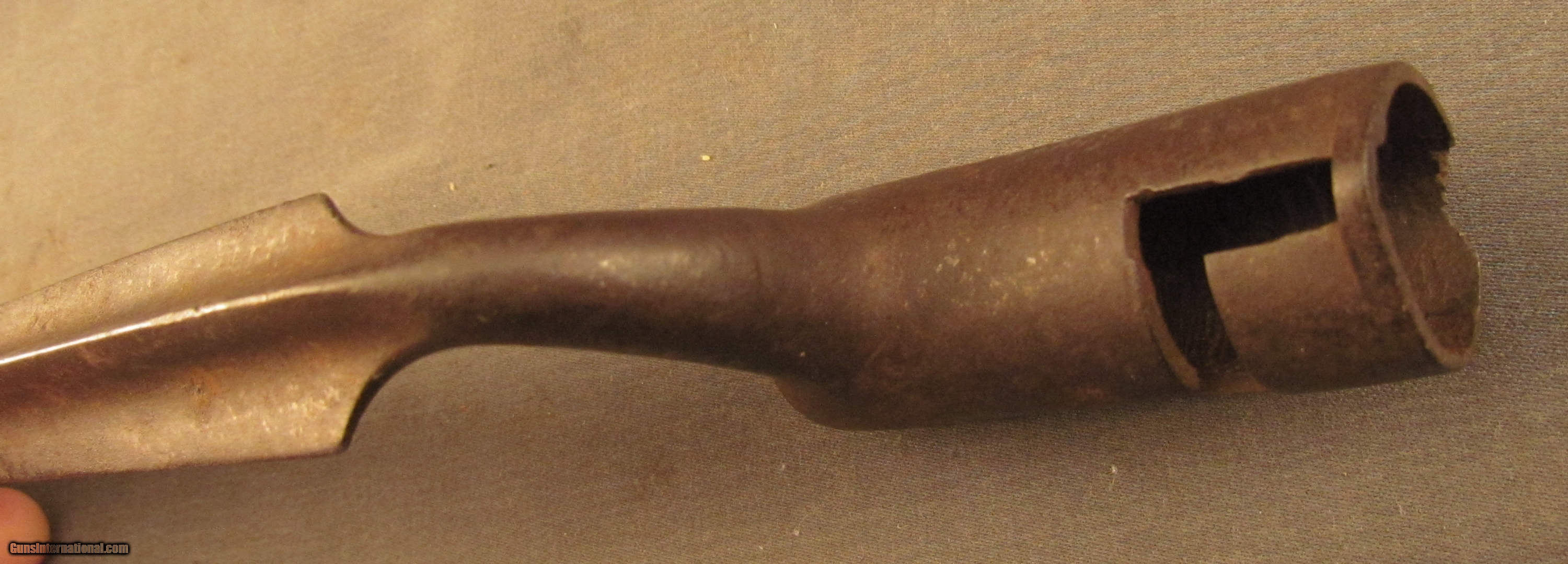 Description: This 18 inch bayonet features a 14 1/2 inch blade with a 6 inch flute in face. Blade is stamped US and M near elbow indicating Federal ownership prior to sale to Maryland. Socket is just over 2 1/2 inches long with simple L Mortice and very small thin bridge. Muzzle diameter varies from .875 to .890 inches. Socket is missing a small piece at rear on top and all surfaces have developed a mostly dark patina with oxidation stains, light scale and several areas of pitting. This bayonet is shown on page 34 or Reilly's American Socket bayonets and scabbards as well as on page 197 #2 of Janzen's bayonets. SOLD Manufacturer: US Military Model: Bayonet |