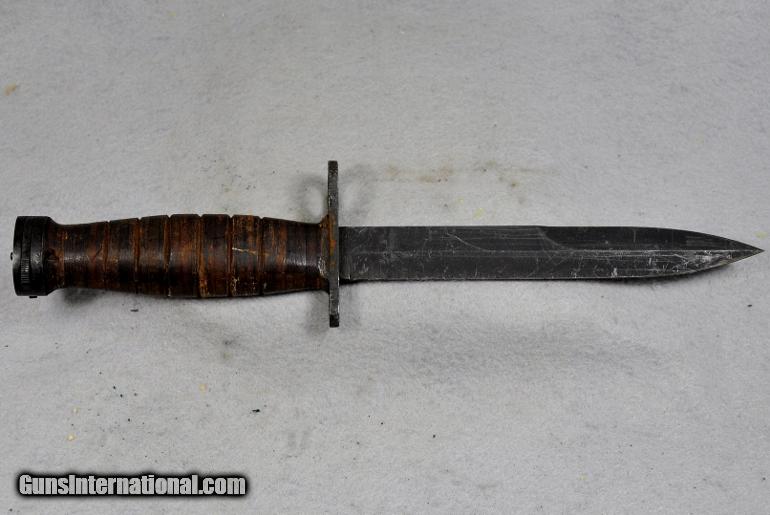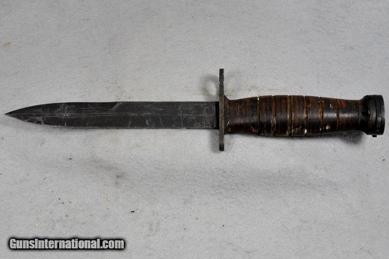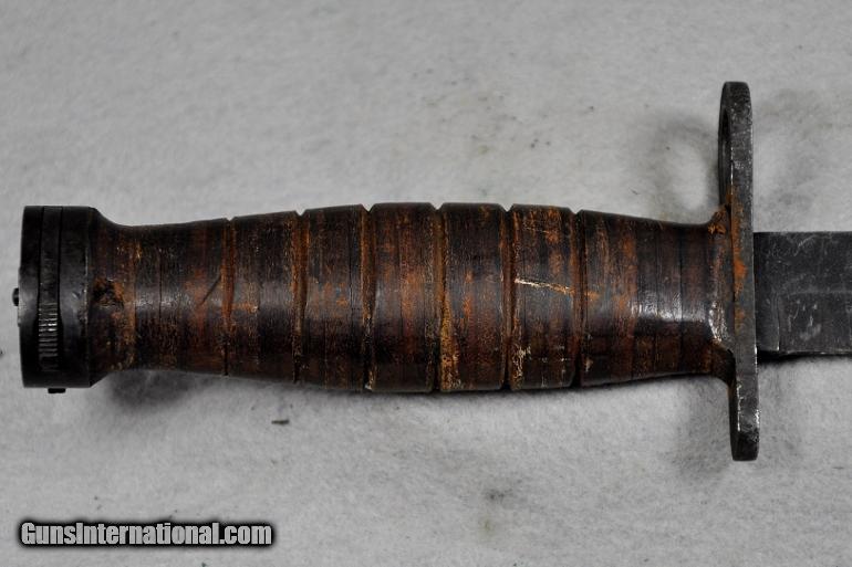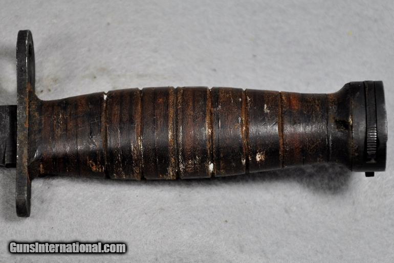Description: Bayonet/Knife, U. S. M4, for M1 carbine, EARLY LEATHER HANDLE, Mfg. by Case, original finish on blade, nice Retail value $150.00, Sale priced at $99.00 SOLD |