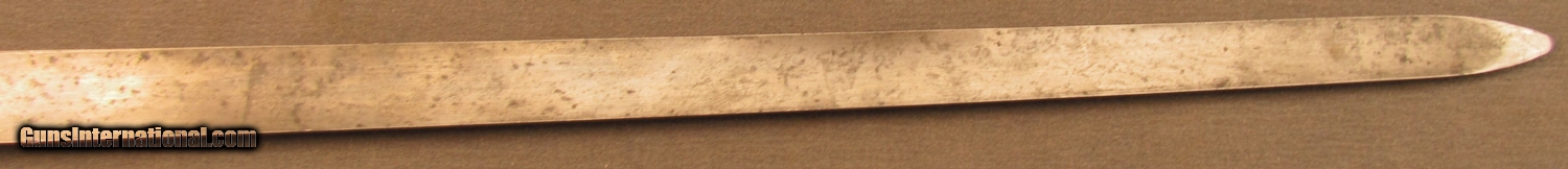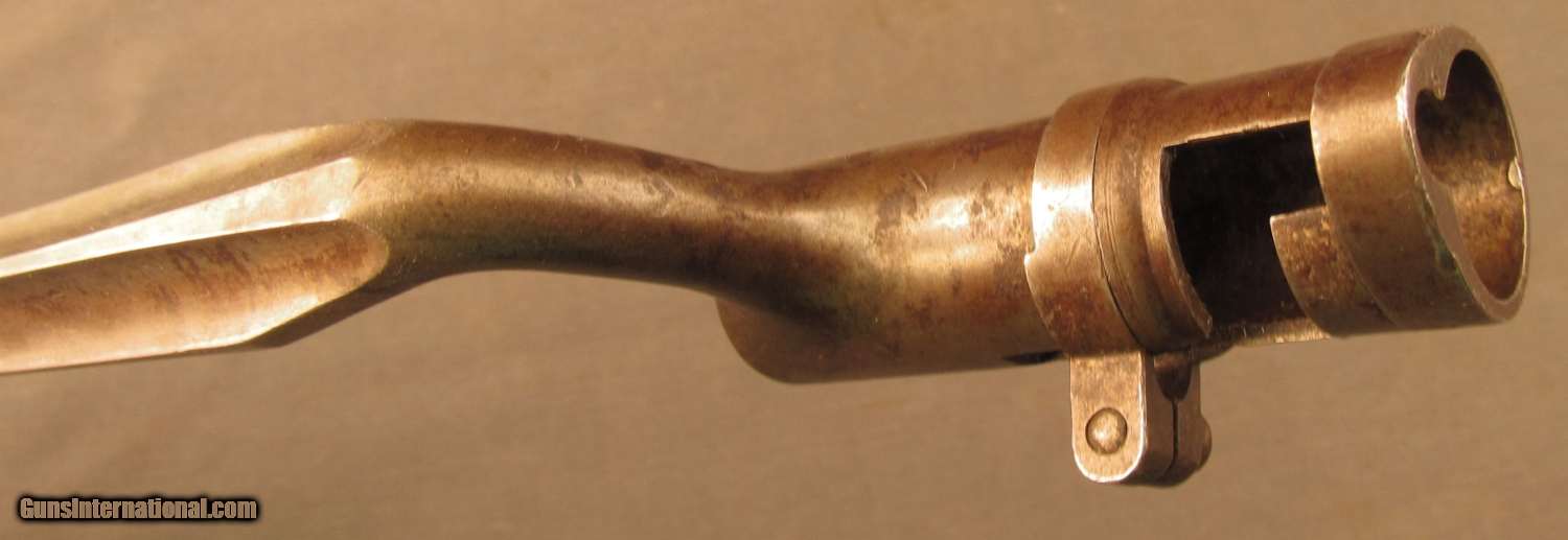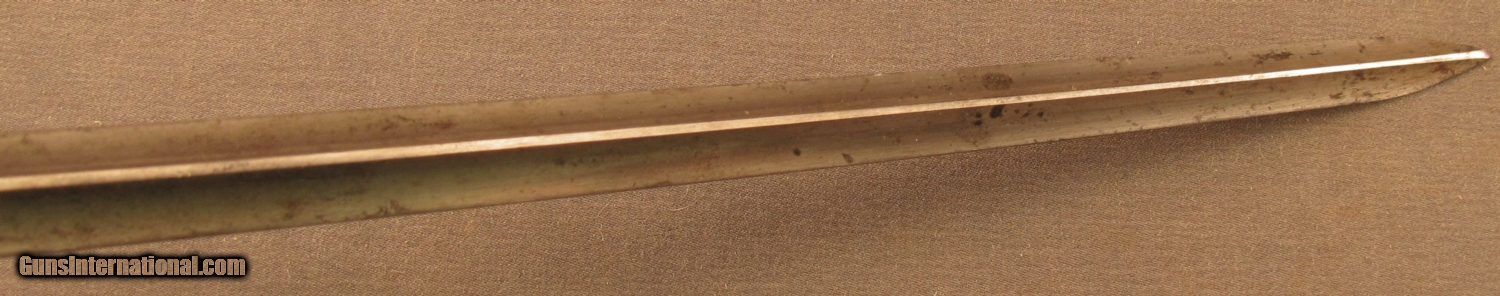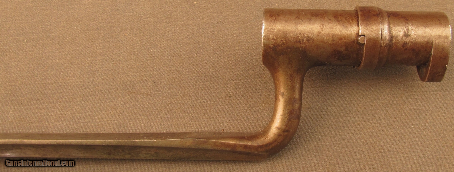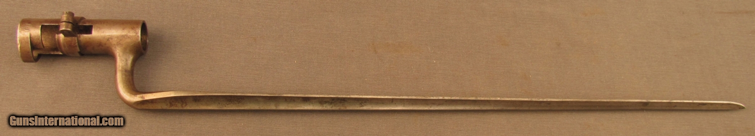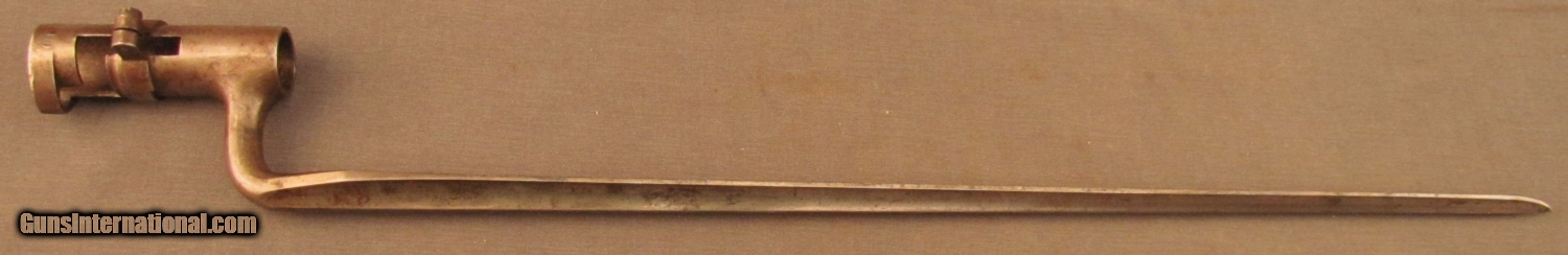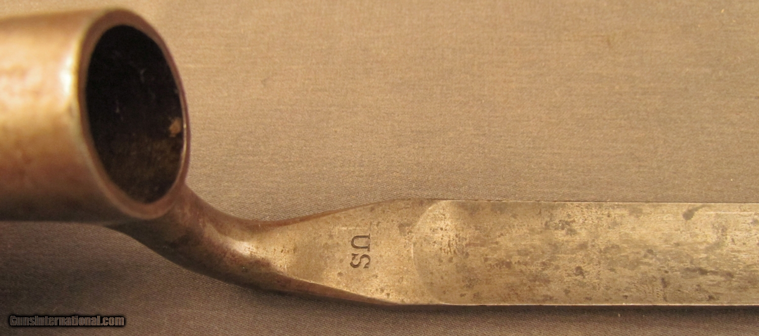 Description: This 21 inch bayonet is marked US on ricasso and "10" on socket. Blade is 18 inches, socket 3 inches, OD is 15/16 and ID is 25/32. Surfaces show staining and dried grease most prevalent on socket. Lock ring rotates freely. No scabbard is present. This is one of the more common civil war bayonets. SOLD Manufacturer: U.S. Model: 1862 |