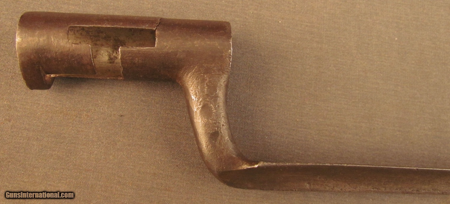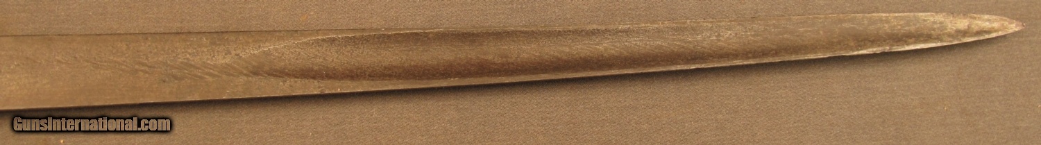 Description: This 19 inch bayonet features a tapered point blade with deep 7 3/4 inch face flute. Blade shows partial markings with "J", "P" and part of "S" visible. Socket is a hair under 3 inches long and is slightly bent with two half inch tears at mortice slot. Muzzle inside diameter measures about .835 . Surfaces show a dark patina with light oxidation and areas of pitting. SOLD Manufacturer: US Military Model: 1816 |