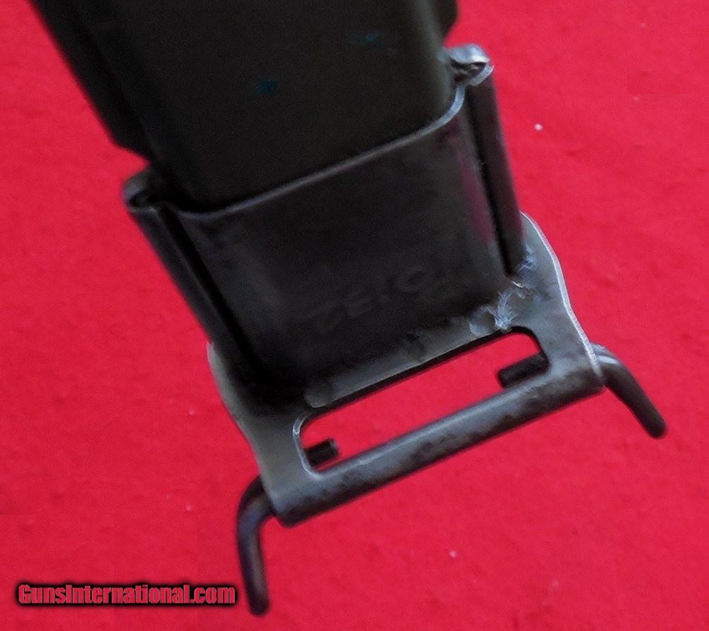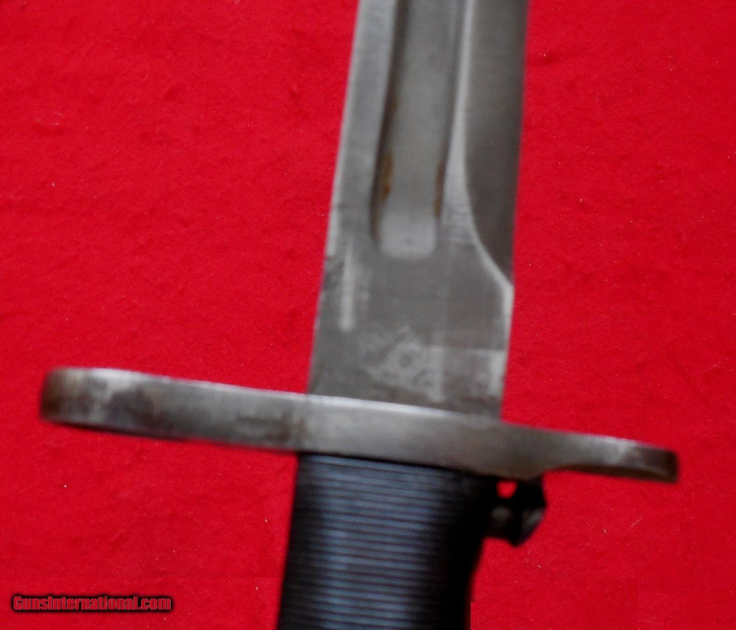 Description: U.S. WW II Model 1942 Bayonet with Scabbard, made by Utica Cutlery. This bayonet for the M1 Garand and the M1903 rifles measures 20 1/2'' overall and bears a 16'' straight single-edged blade with a 5 1/2'' false edge, single unstopped fullers and a spear-point tip. The reverse face of the ricasso is marked ''U. C. / U. S. (centered by Ordnance Bomb) / 1942'', and the obverse is marked with a light Ordnance Wheel. The blade retains about 50% Parkerized finish with light wear on the ricasso and spine, scattered oxidation staining and scattered very light chips along the edge. The metal surfaces of the hilt show old oxidation, generous remnants of Parkerized finish and light wear on the high edges. The ribbed hard rubber grips are in excellent condition. The included M3 scabbard consists of an OD green fiberglass body and a steel throat, throat reverse stamped B/1-5/N, the steel throat having been cleaned to bright with spots of oxidation staining and ''P0132" previous owners ID lightly hand scratched on the underside of the throat. The overall condition as described and photographed is good plus- very good. Inv. # US 4392 SOLD Rifle Caliber: .30-06 Springfield |