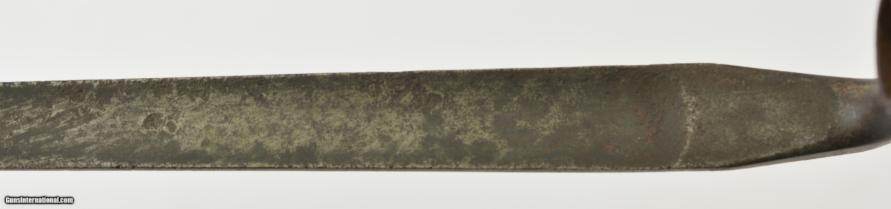 Description: This is a well-made bayonet that measures 23 7/8" overall, with a 21 3/8" angular blade having a coffin-shaped ricasso, and full-length, hollow ground back flutes. The shank measures 1 1/8" long, while the 2 5/8" long socket, which has an L-shaped mortise with functional locking ring. The metal has an overall mottled plum-brown patina with scattered spots of mild freckling and a pinprick pitting. The bayonet mortise fits a .43 caliber Peabody very closely, although there is a fair bit of play between the socket and the barrel. SOLD Manufacturer: Peabody Model: Bayonet |