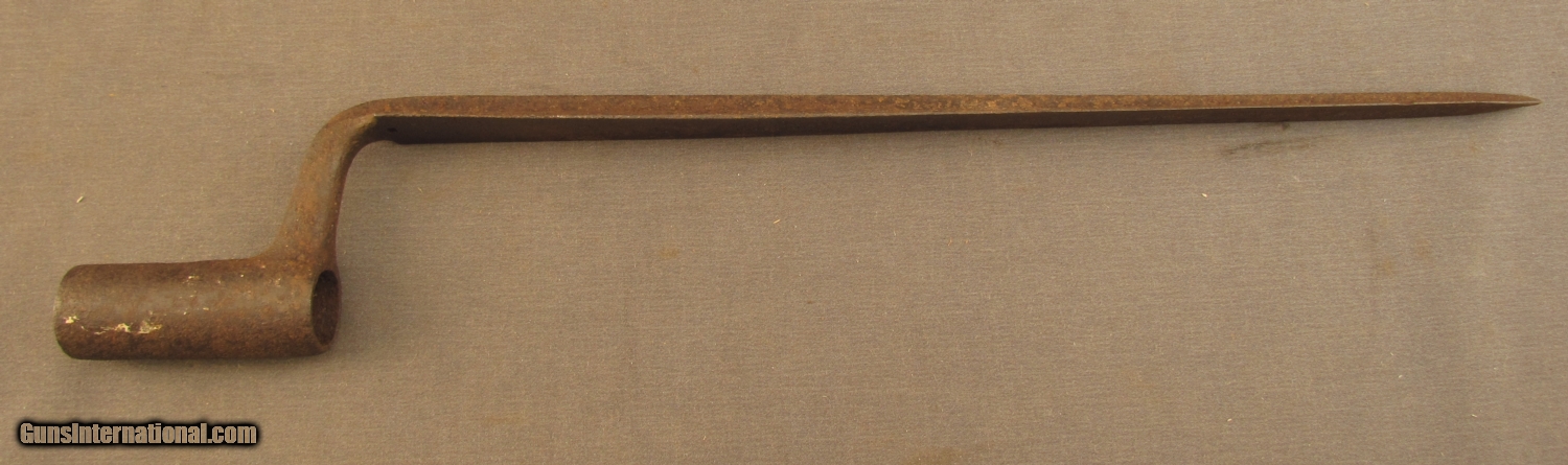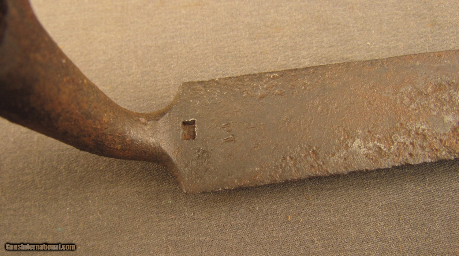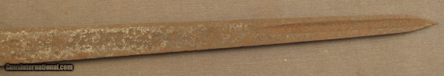 Description: This scarce early bayonet is deeply stamped US with lighter PT above. This 17 inch bayonet has no bridge sharp shoulders and has been repointed during period of use with sides filed to a point probably after tip was broken. Socket is 2 5/8 inches long with .860 inside diameter at muzzle. Top of blade has a five inch fuller at tip. Surfaces show heavy pitting and scale. An interesting early US bayonet that probably saw service in the war of 1812. SOLD Manufacturer: U.S. Model: 1795 |