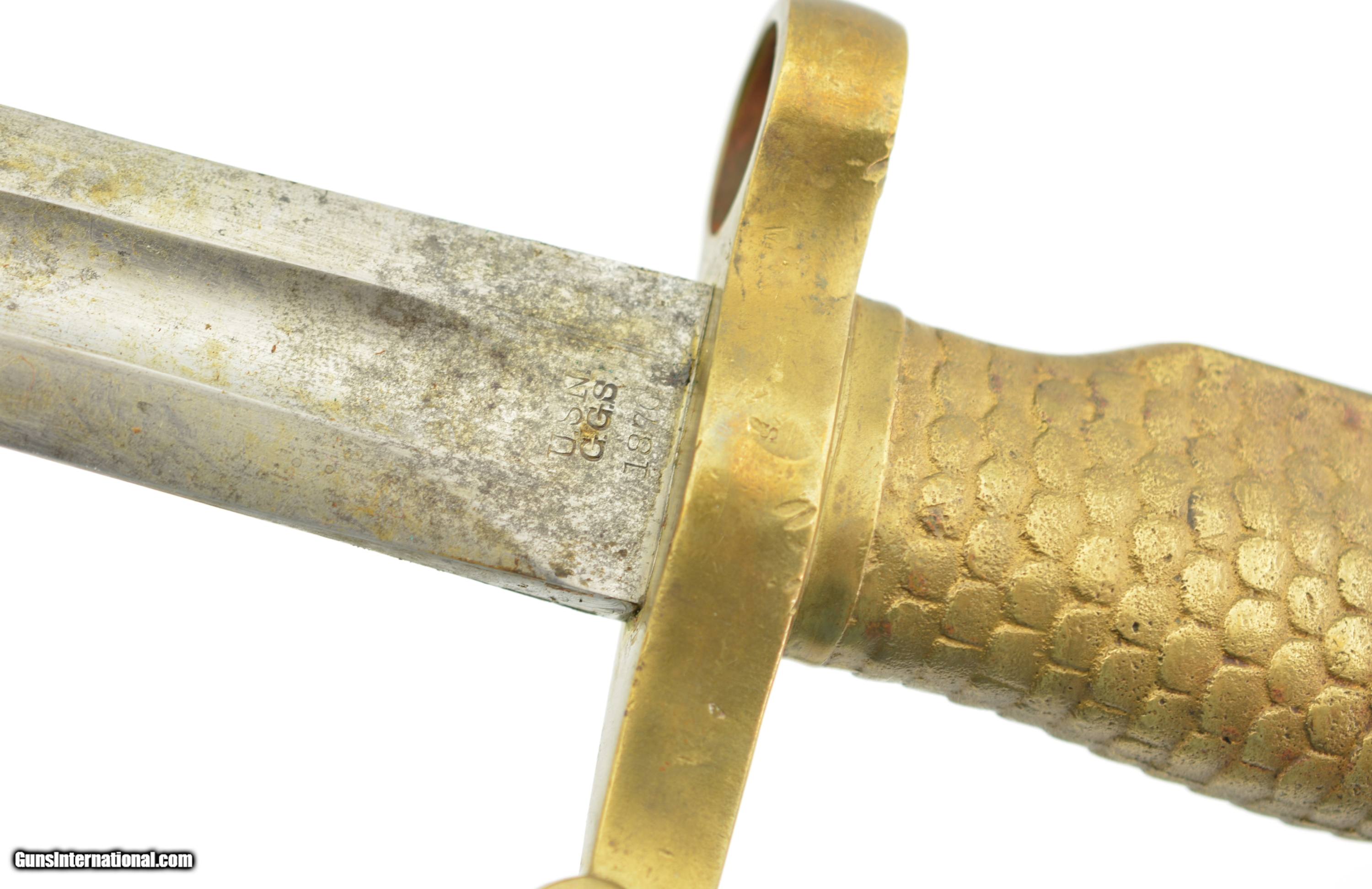 Description: This is the Type II bayonet for the .50 caliber, Model 1870 Rolling Block Navy Rifle, and measures 24 3/4" overall, with a 20 1/8" straight, double-edged blade having 3/4 length central fullers. The steel has an overall mottled gray patina with scattered areas of dark freckling, and deposits of dried, protective grease along both sides of the blade. The ricasso has the Ames "Scroll" trademark on the ricasso reverse, while the obverse has "U.S.N. / GGS / 1870" naval markings. The cast brass hilt has a mellow yellow-ochre tarnish, and a noticeable dent on the quillon finial. The press-stud is still functional, and both the "GGS" and "IA" inspector stamps are still legible. The leather and brass scabbard is in fair shape with shallow dents on the throat and chape (which is missing the frog stud), and some minor crazing along the black leather body. Additionally, the leather near the tip has an old tape repair. This is a good-very good example of a scarce US Navy bayonet. SOLD Manufacturer: Spfld Model: Bayonet |