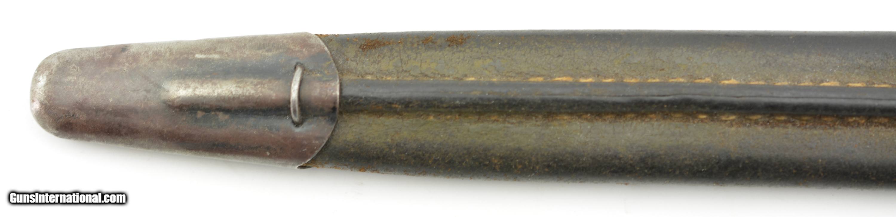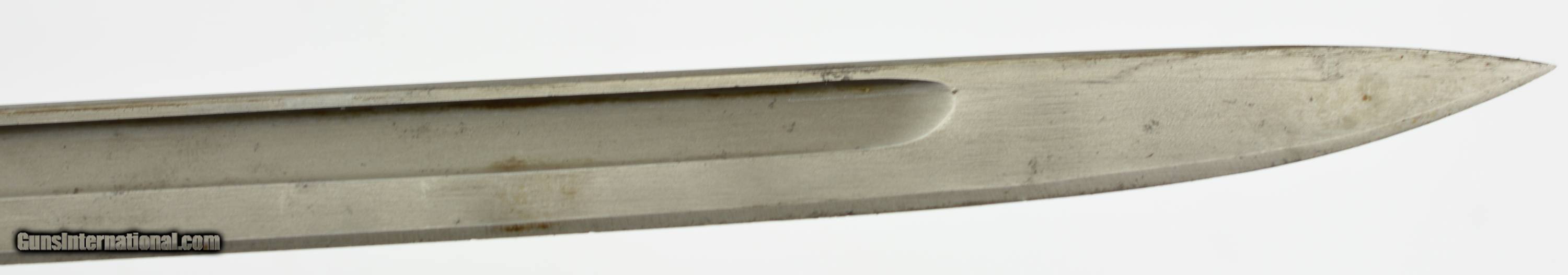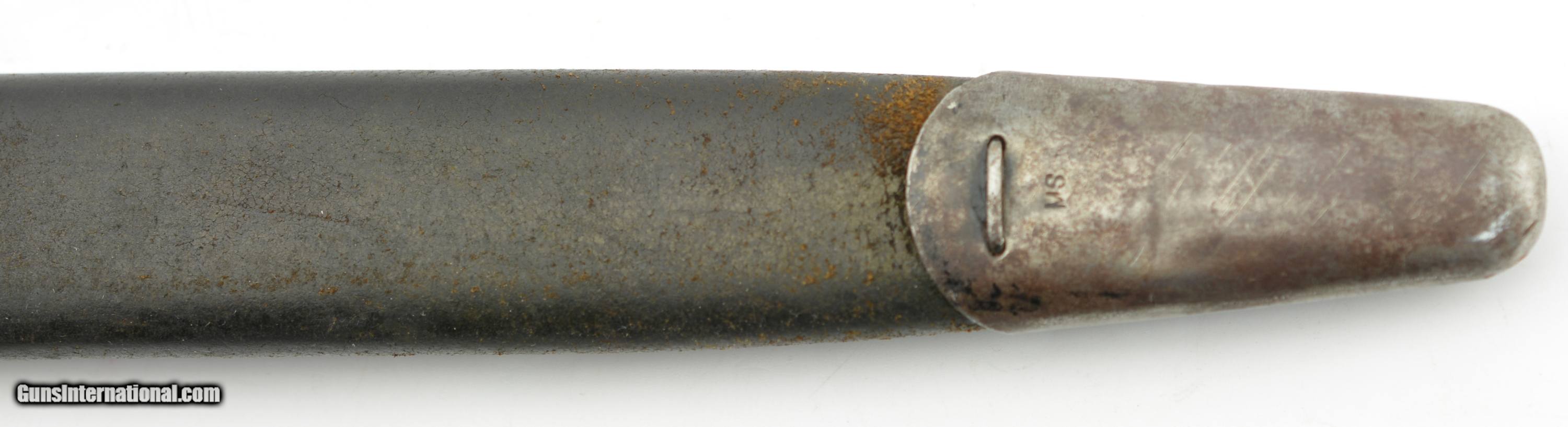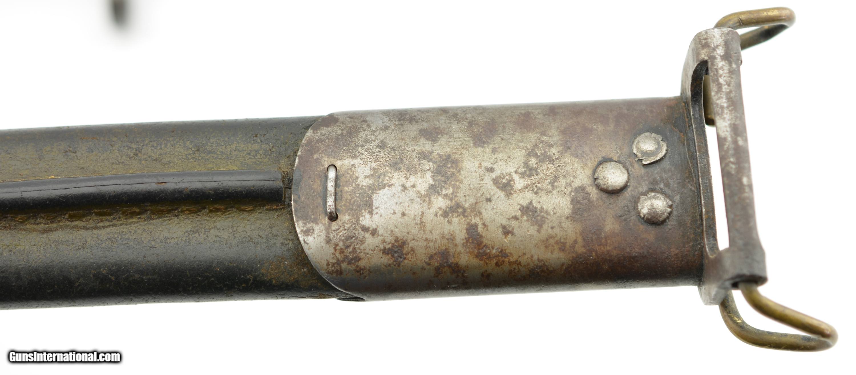 Description: This is a nice example that measures 21 3/4" overall, with a 17" single-edged blade having single fullers. The blade has a fine original dull gray factory finish with some minor spots of plum-brown freckling near the tip, and dark original bluing on the ricasso. The ricasso itself has crisp original stamps with "1917" date and "W (in circle)" on the obverse, and "(flaming bomb) / US" (plus inspection stamps) on the reverse. The hilt retains most of the original blue finish with gray meyal on the balance, and the walnut grips are in fine condition. The bayonet is housed in the original leather and steel scabbard that has a mottled gray-black patina on the throat and chape, while traces of the original olive paint are present along the seam along the reverse. This is a very nice example of a desirable Winchester-made bayonet, and is in fine-near excellent condition overall. SOLD Manufacturer: Winchester Model: Bayonet |