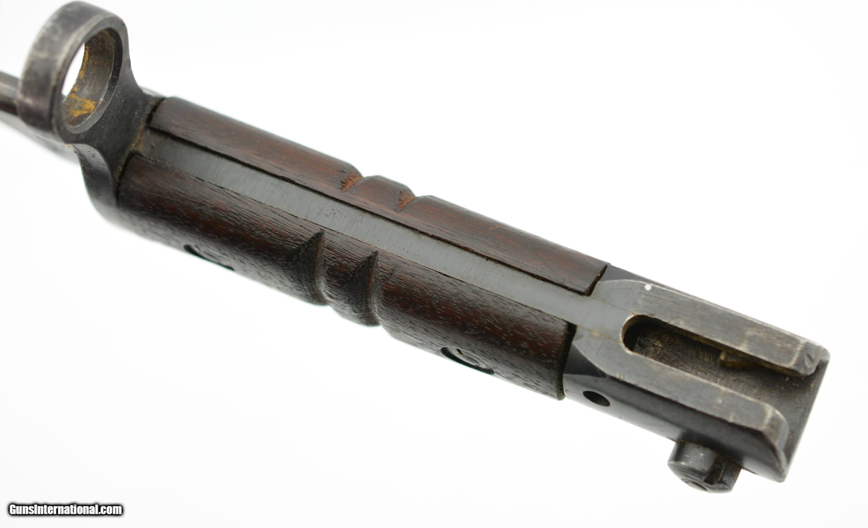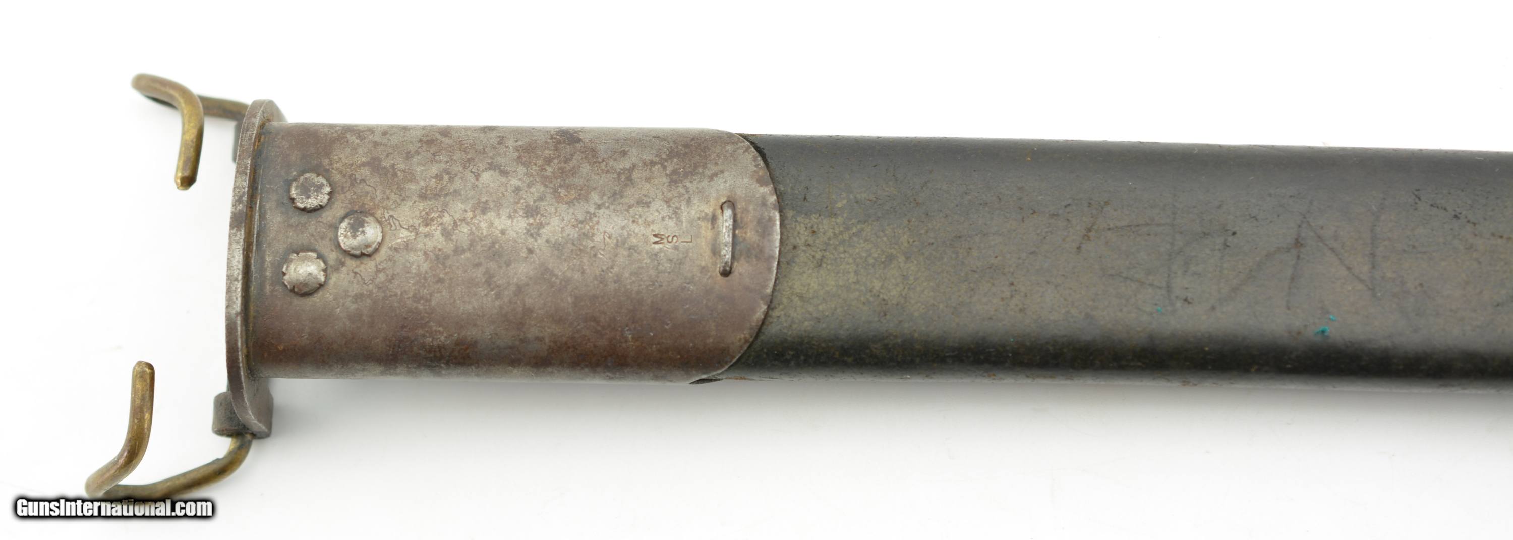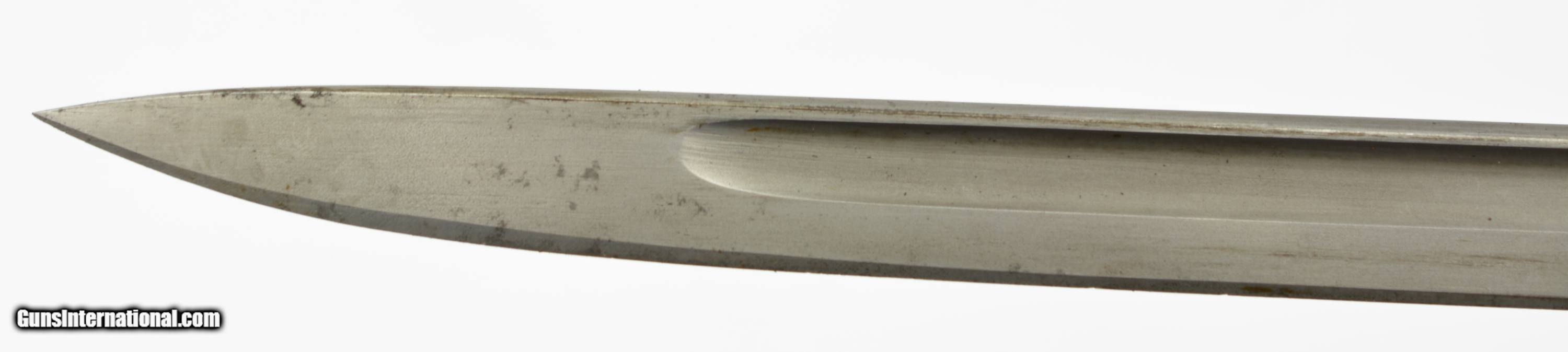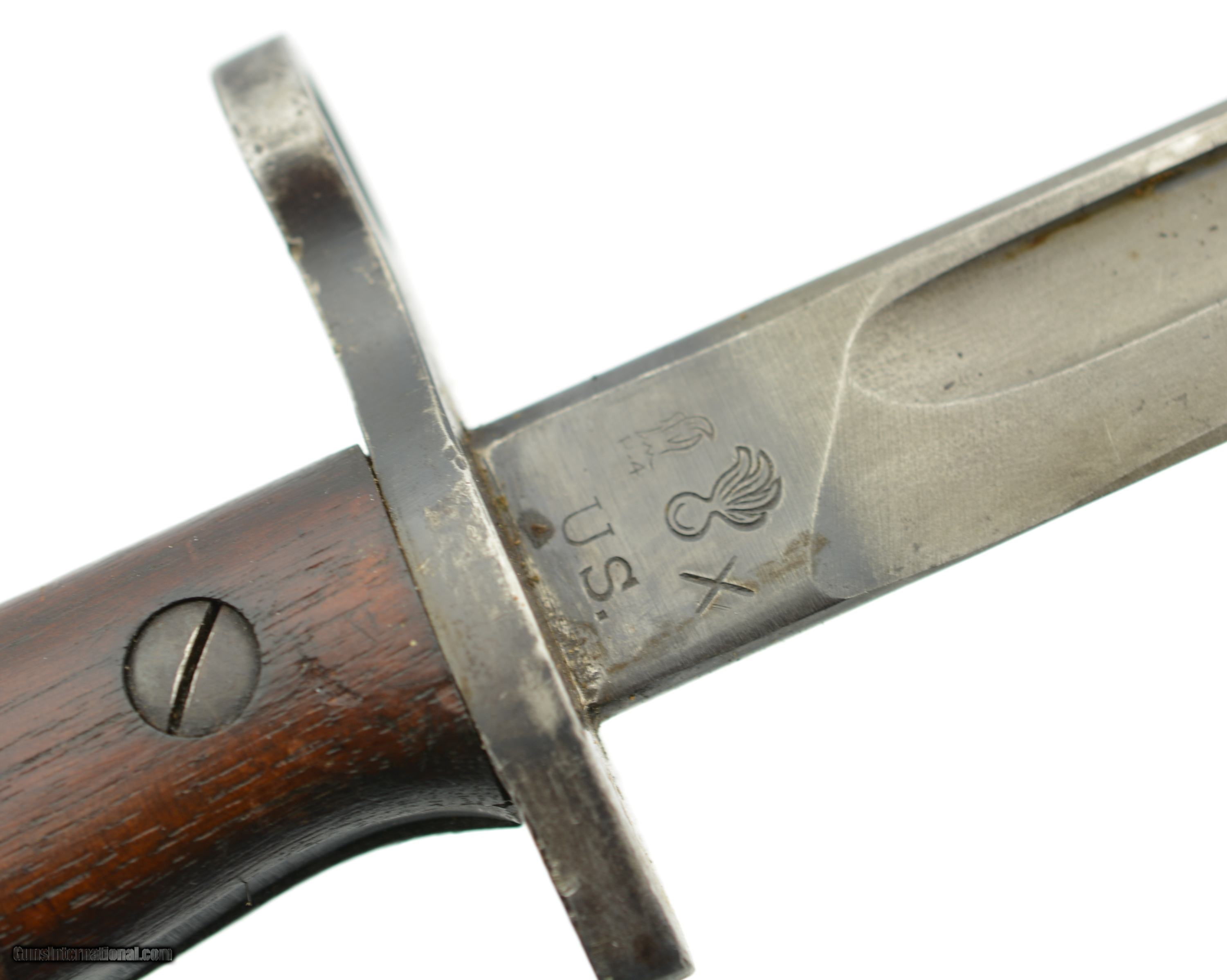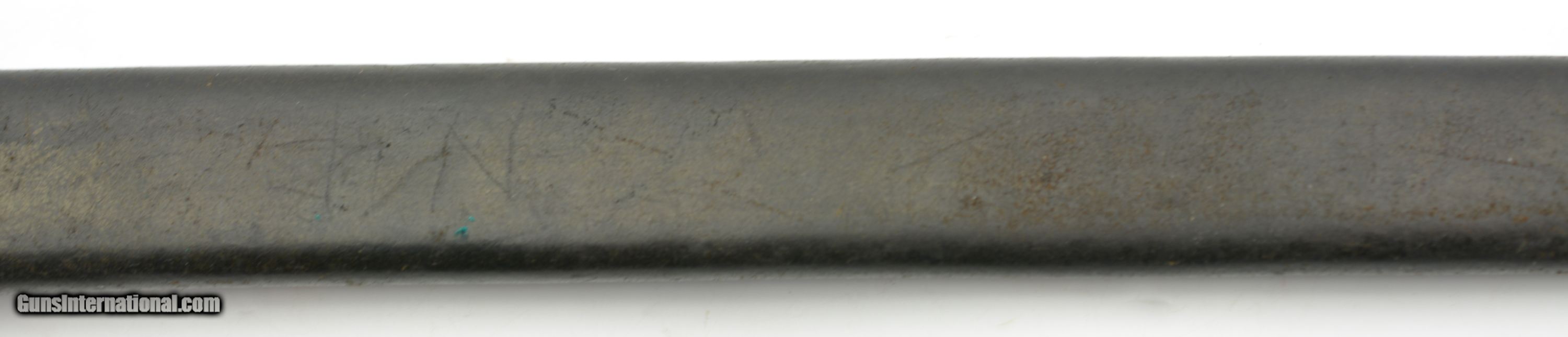 Description: This is a nice example that measures 21 3/4" overall, with a 17" single-edged blade having single fullers. The blade has a fine original dull gray factory finish with some minor spots of plum-brown freckling near the tip, and dark original bluing on the ricasso. The ricasso itself has crisp original stamps with "1917" date and "W (in circle)" on the obverse, and "(flaming bomb) / US" (plus inspection stamps) on the reverse. The hilt retains most of the original blue finish with gray meyal on the balance, and the walnut grips are in fine condition. The bayonet is housed in the original leather and steel scabbard that has a mottled gray-black patina on the throat and chape, while traces of the original olive paint are present along the seam along the reverse. This is a very nice example of a desirable Winchester-made bayonet, and is in fine-near excellent condition overall. SOLD Manufacturer: Winchester Model: Bayonet |