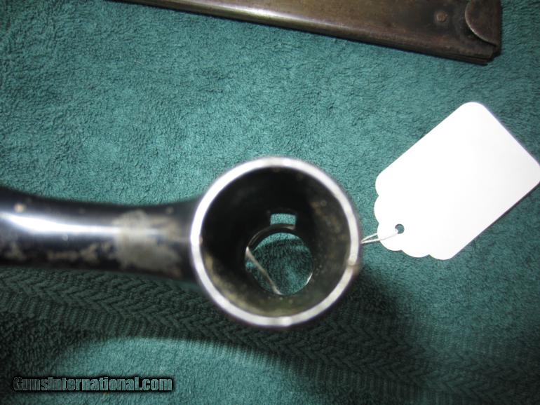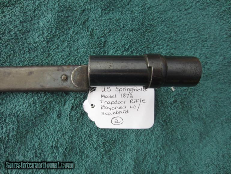 Description: US Springfield Model 1873 Trapdoor Rifle Socket Bayonet with Scabbard. The blade has retained most of its finish with some light pitting and scratches. The scabbard has some scratches and pitting but no dents, but does have a 1 inch spit at top - there is a picture that shows it. The bayonet measures a total of 21 inches in length. The socket measures 3 inches. SOLD |