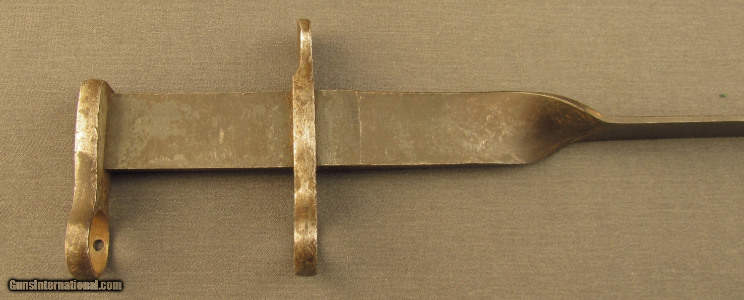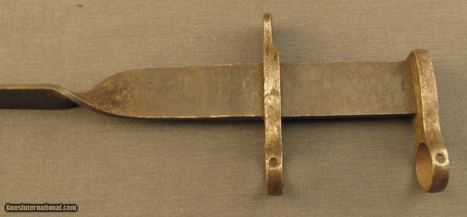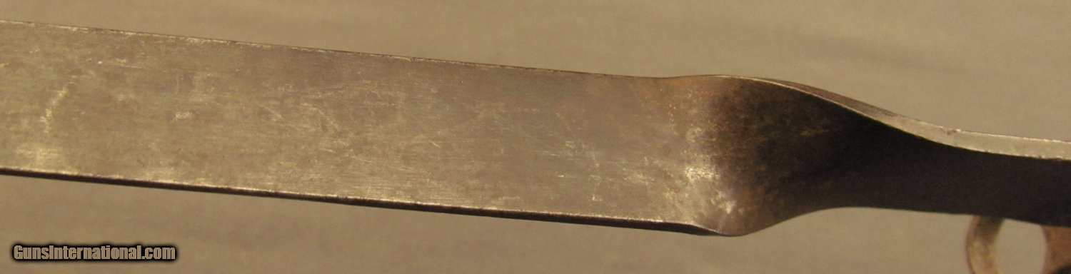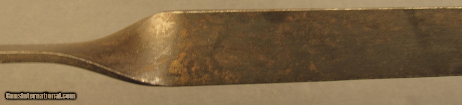Description: This 1909 training bayonet features a 16 inch spring steel blade with leather covered tip. This bayonet is pictured and described on page 103 of Brophy's Springfield 1903 rifles book and pg 236 #1 in Janzen's bayonets. This item is well used with scratches , dents and dings. The blade retains 80% worn blue with a little scattered oxidation. The leather tip is in great shape with intact seams and light wear. A rare bayonet for the advanced collector. SOLD Manufacturer: U.S. Model: 1909 |