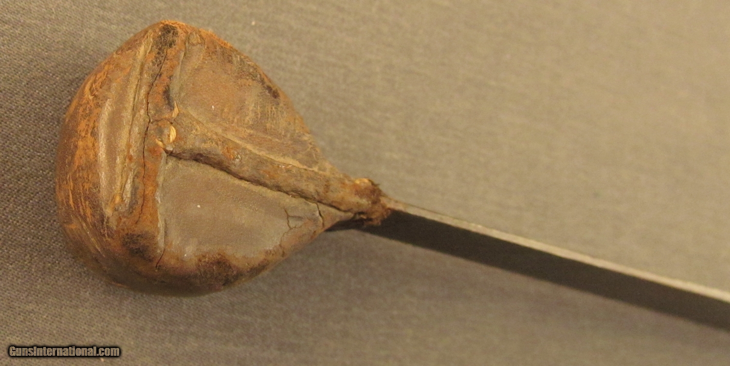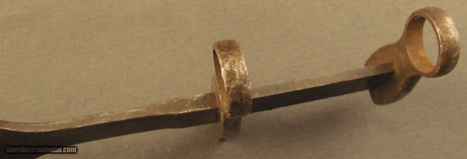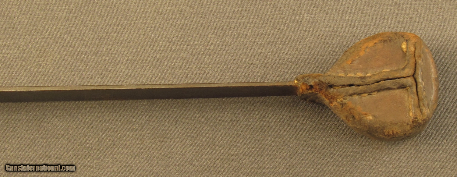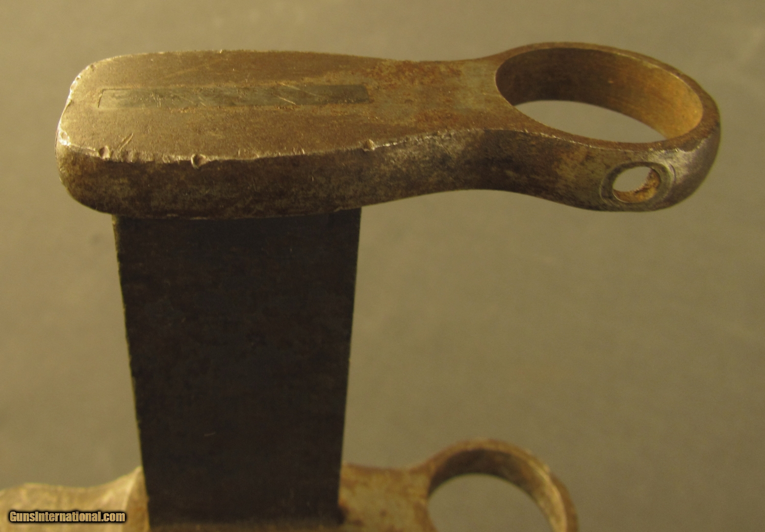 Description: This 1909 training bayonet features a 16 inch spring steel blade with leather covered tip. This bayonet is pictured and described on page 103 of Brophy's Springfield 1903 rifles book and pg 236 #1 in Janzen's bayonets. This item is well used with scratches , dents and dings. The blade retains 80% worn blue with a little scattered oxidation. The leather tip is in great shape with intact seams and light wear. A rare bayonet for the advanced collector. SOLD Manufacturer: U.S. Model: 1909 |