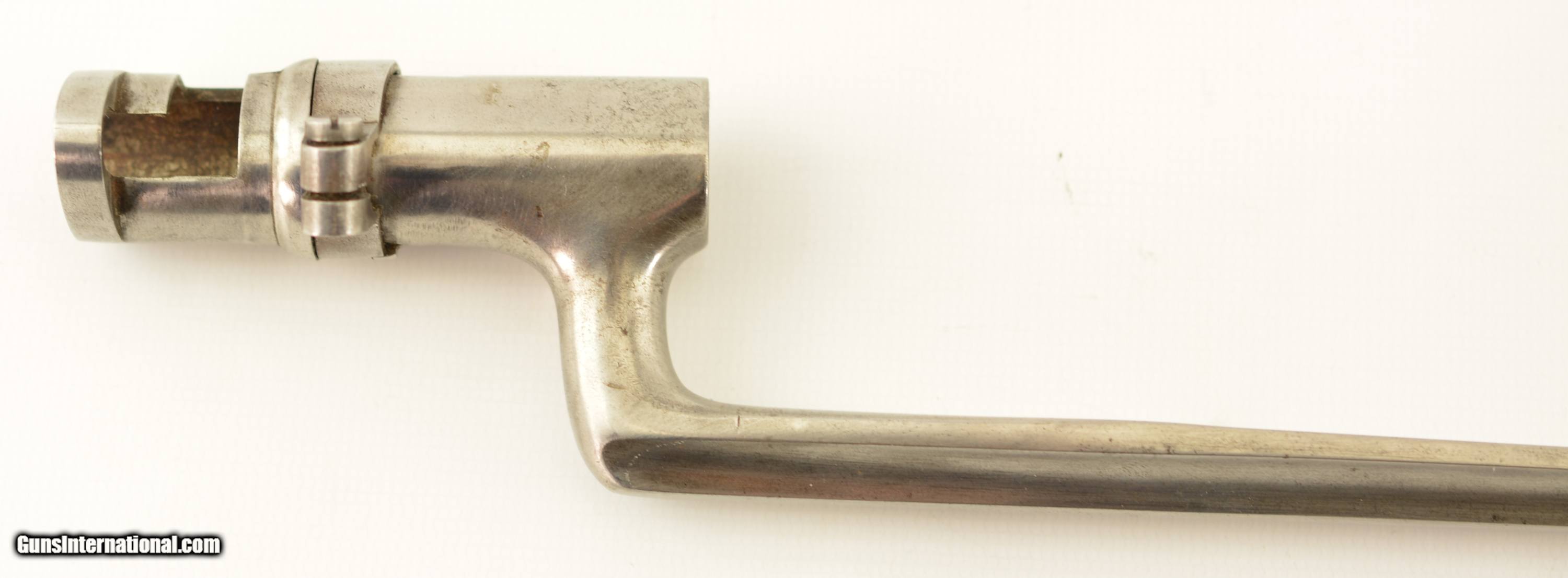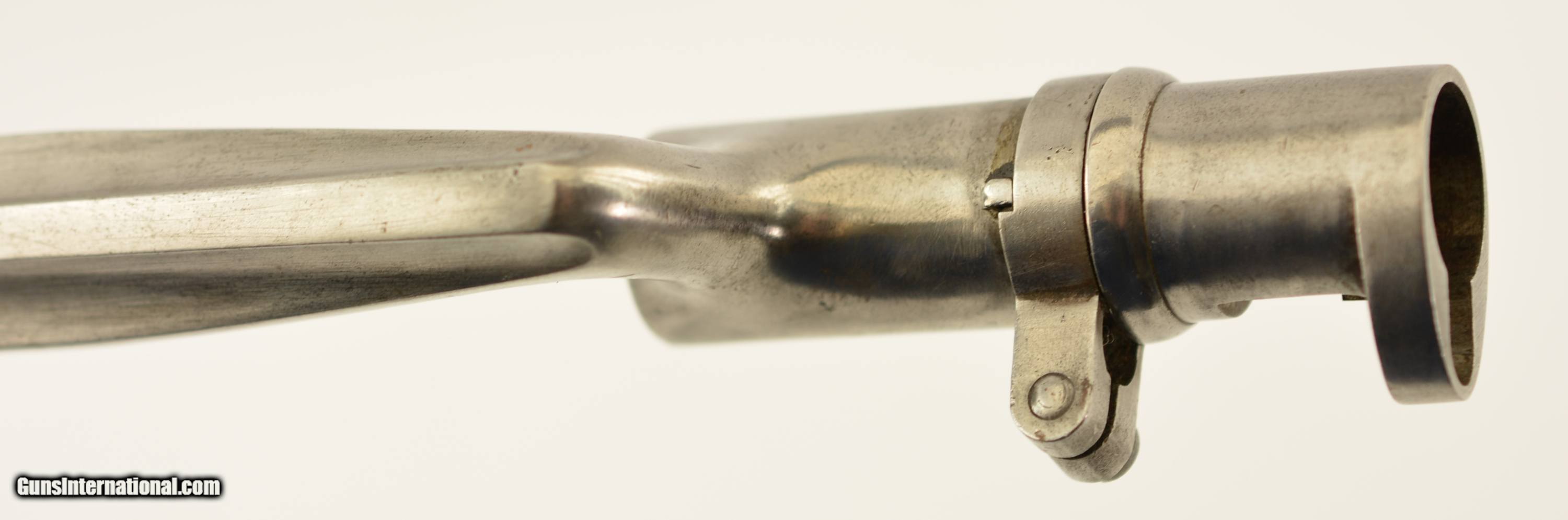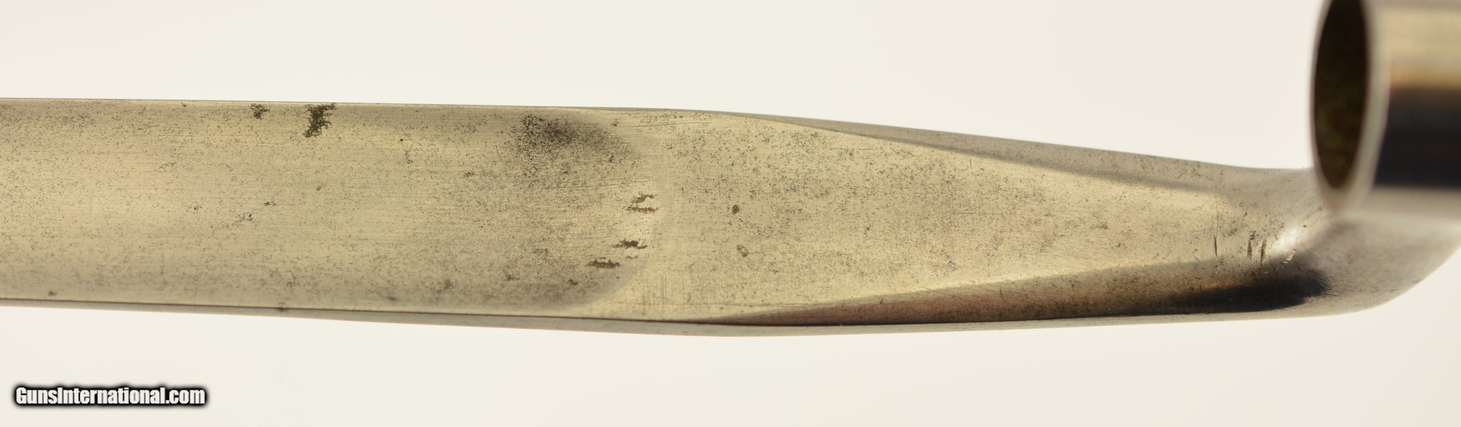 Description: This bayonet measures 20 3/4" overall with an 18 1/4" angular blade having hollow ground back flutes. The metal has an overall bright patina, with spots of thin freckling throughout, heaviest on the socket, which has a single spot of dark oxidation just ahead of the mortise. These are very well-made bayonets, and this example rates fine condition overall. SOLD Manufacturer: Winchester Model: Bayonet |