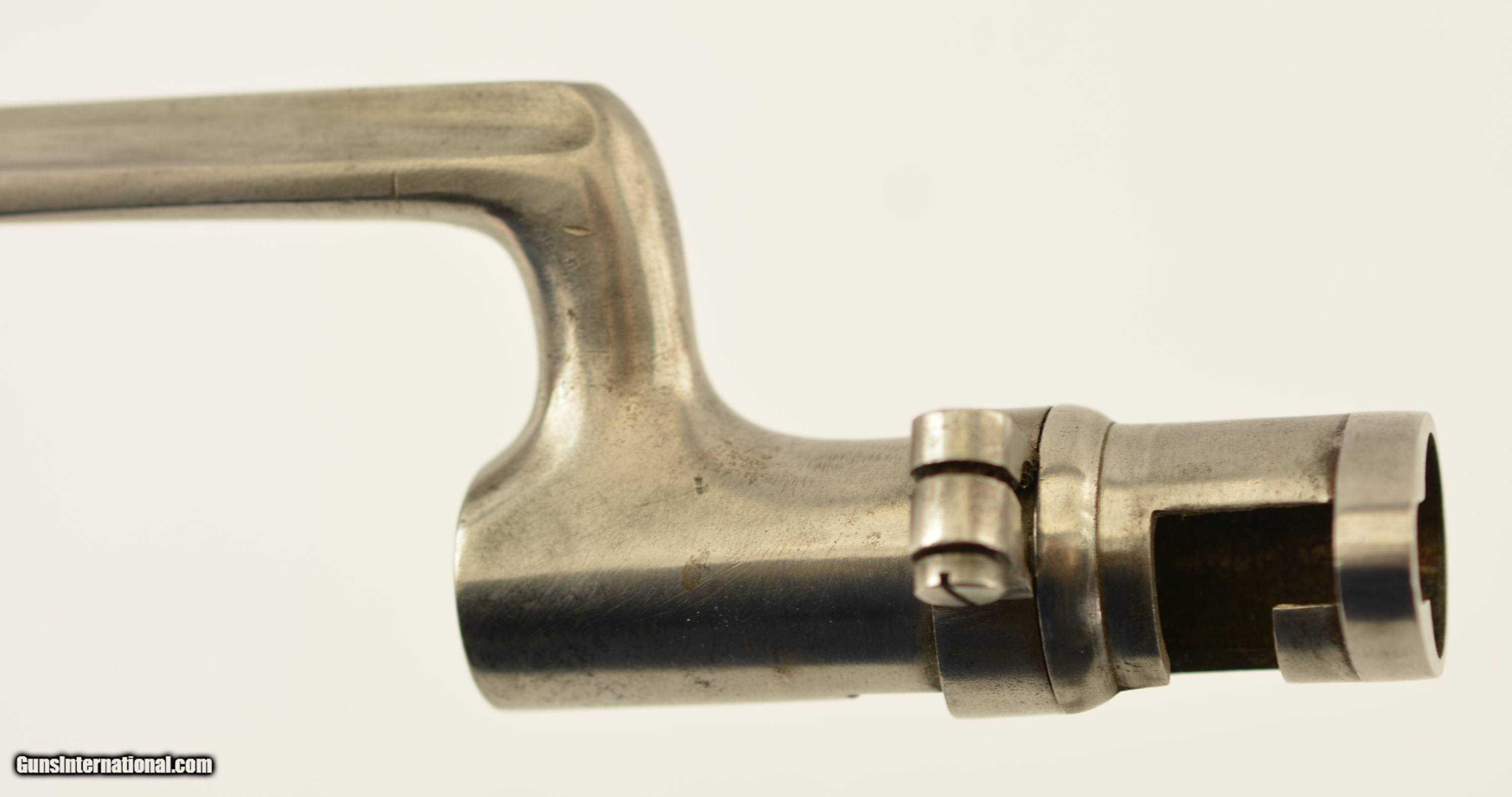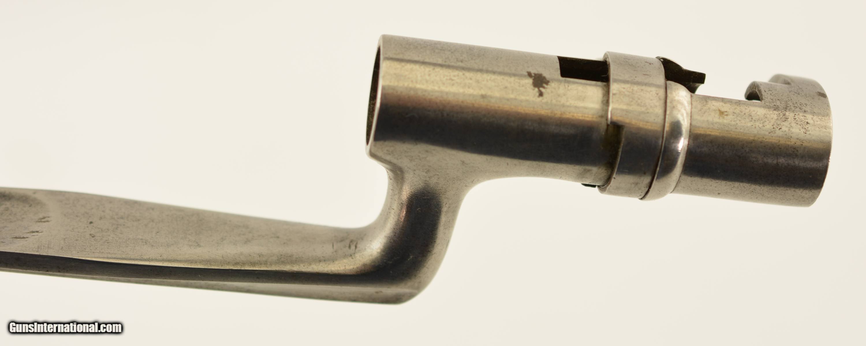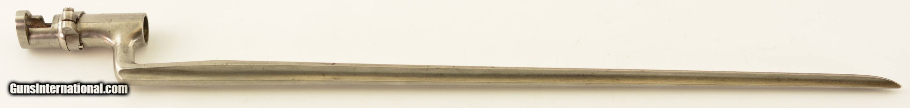 Description: This bayonet measures 20 3/4" overall with an 18 1/4" angular blade having hollow ground back flutes. The metal has an overall bright patina, with spots of thin freckling throughout, heaviest on the socket, which has a single spot of dark oxidation just ahead of the mortise. These are very well-made bayonets, and this example rates fine condition overall. SOLD Manufacturer: Winchester Model: Bayonet |