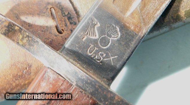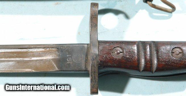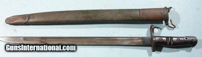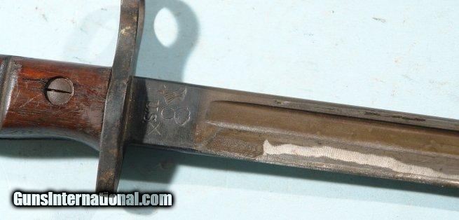 Description: WW1 U.S. REMINGTON FOR MODEL 1917 "ENFIELD" BAYONET & SCABBARD. Blued fullered blade with flaming bomb/ U.S./ Eaglehead "11" and X. Reverse of ricasso "1917' and Remington in circle. Wood grip panels with two groove panels correct. Oil hole in pommel. 1917 leather with green paint scabbard. Quillon slightly bent can be easily bent back. All original finish including green olive drab paint. Metal drag pinched at tip. Edge reground first few inches near hilt. SOLD |