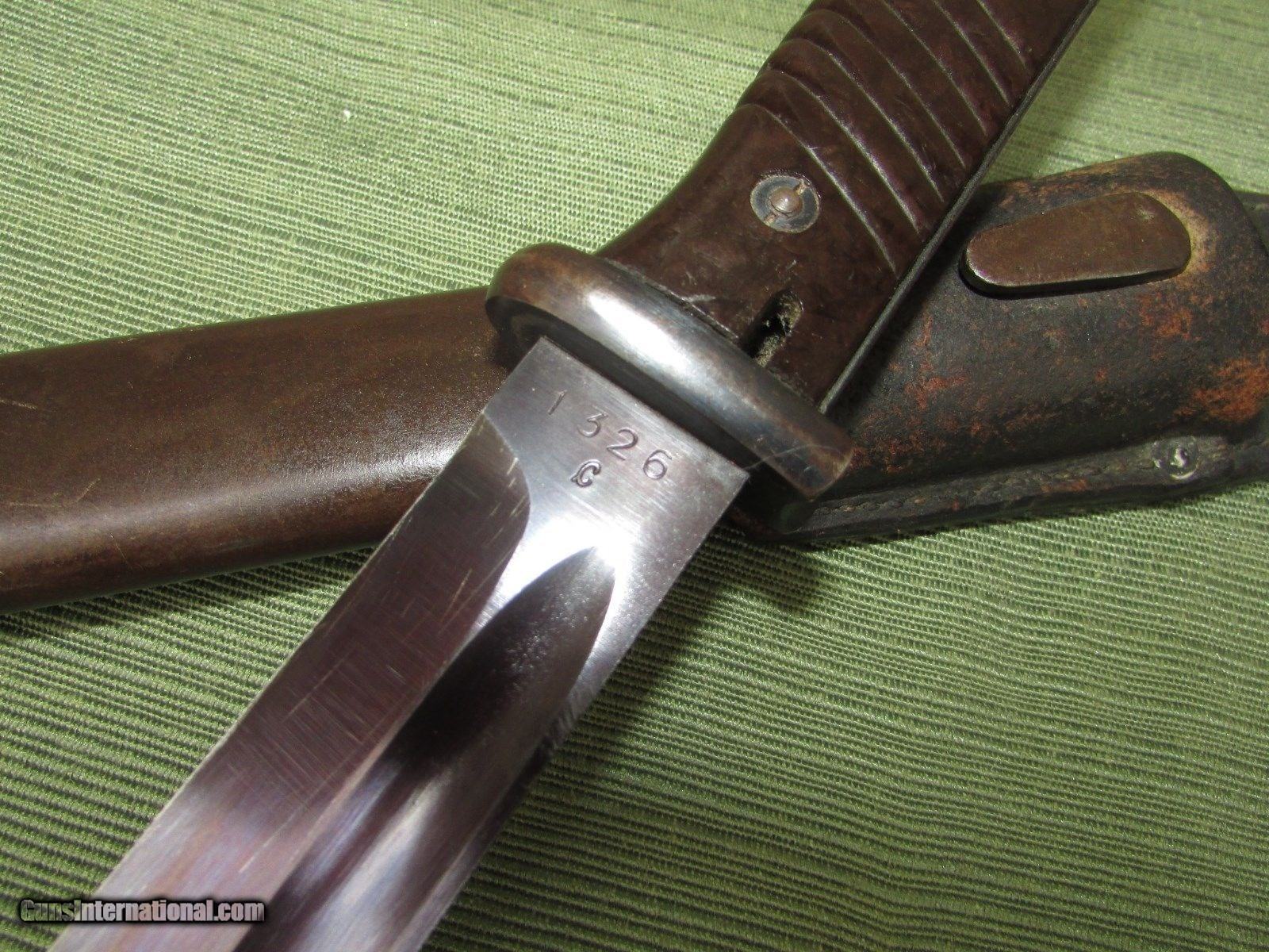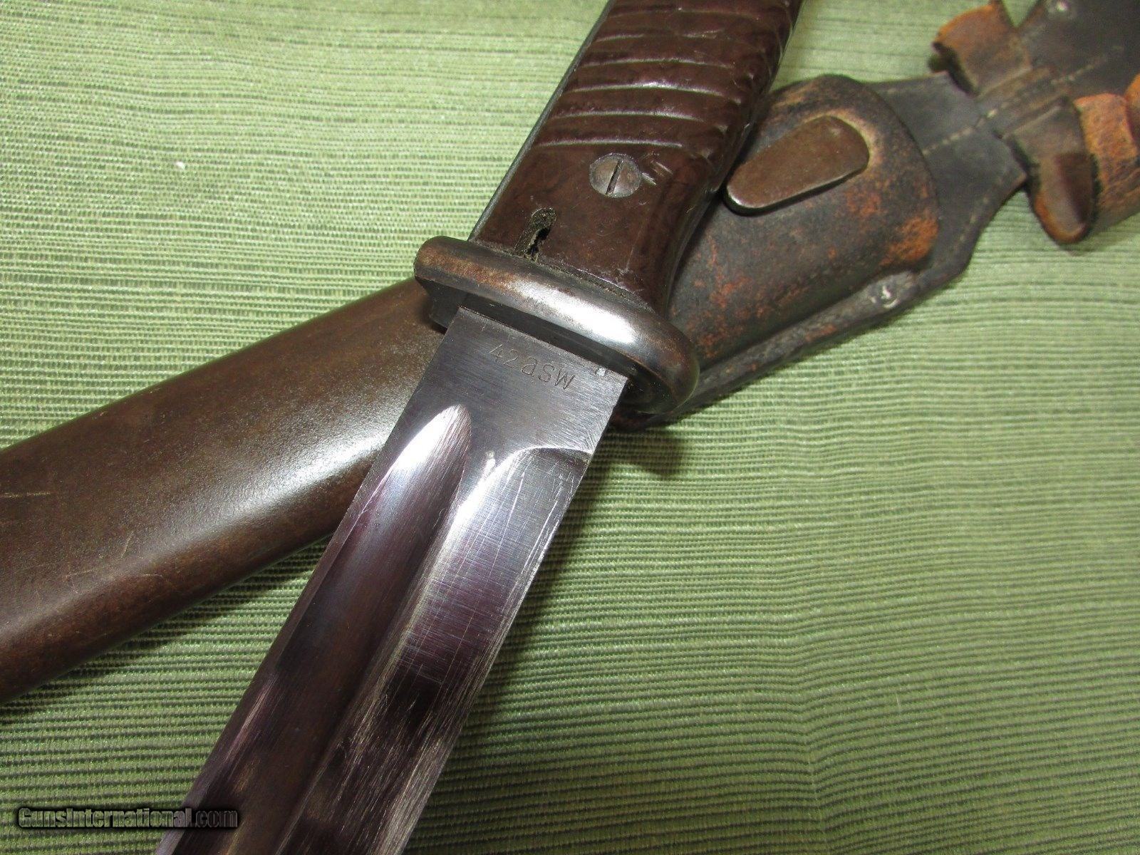 Description: Bayonet and scabbard do not have matching numbers bayonet has 42 ASW code and SN 1326c. It was made by EF Horster. Blade has about 90% factory blue finish. The very tip is just lightly dulled..No rust or pitting. Scabbard is in very nice condition no dents and has a plum patina. Number is 0468. Frog is dated 1938 with maker stamp OTTO Something? Closing tab torn as you see. Not perfect but still a very nice looking example. PRICE REDUCED SOLD thank you. SOLD |