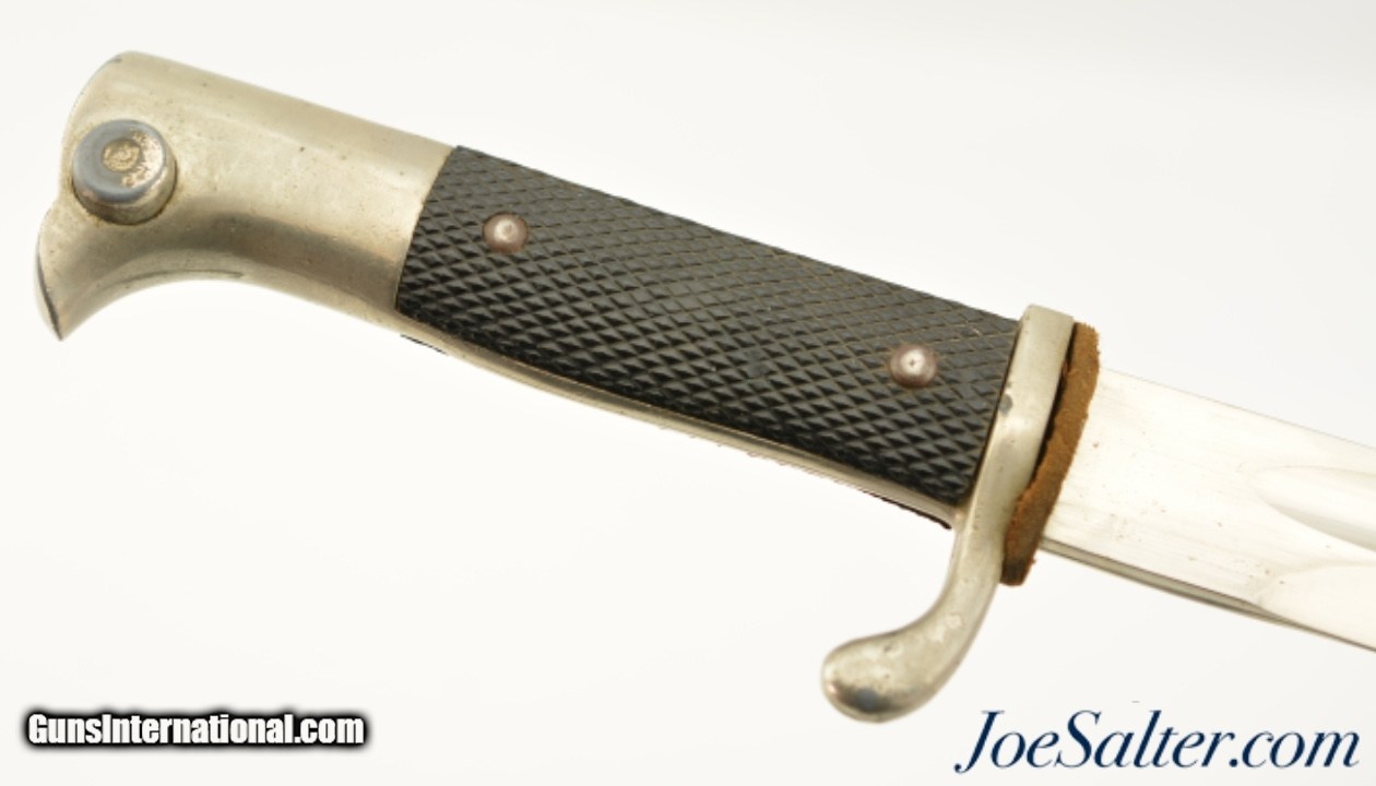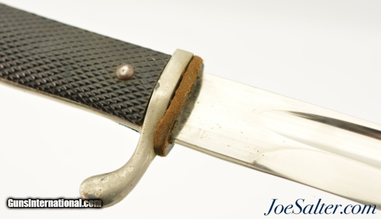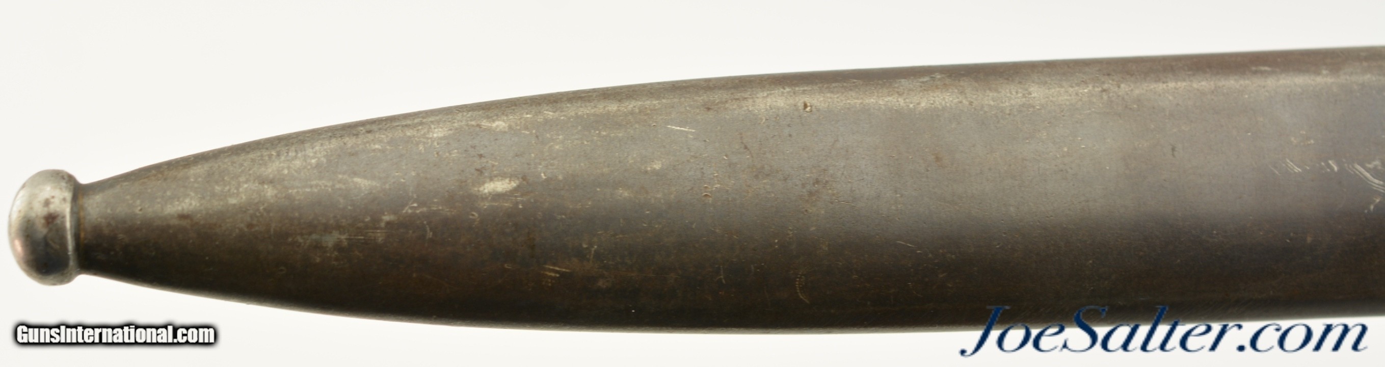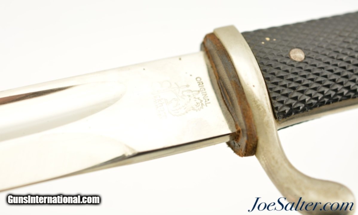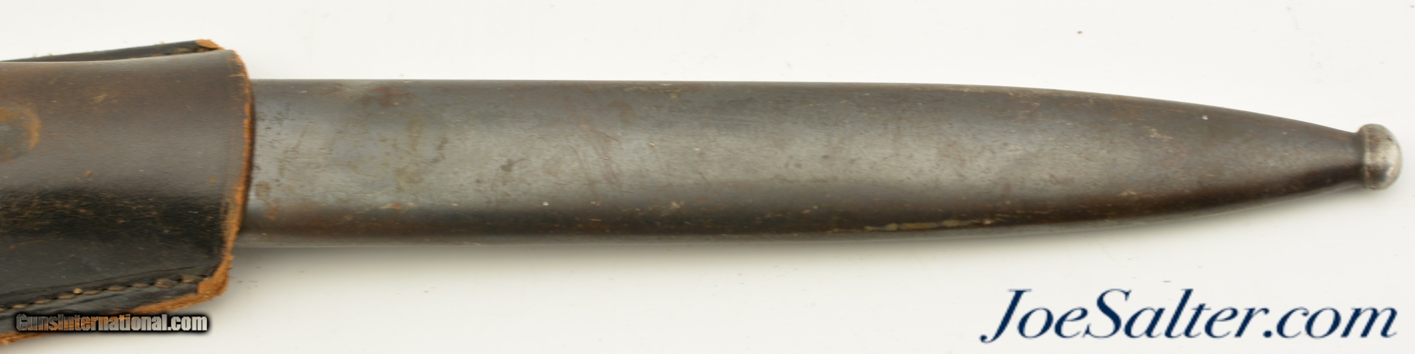 Description: This is a German WWII Wehrmacht Officers Dress Bayonet with Scabbard. This bayonet has a 9 ??" unsharpened nickel plated blade with a fuller to each side. The Eickorn Solingen produced blade is in excellent condition with light scabbard marks and almost no signs of age. The leather washer at guard is original to bayonet. The bayonet has a nickel plated, alloy, crossguard with one up-swept arm, and a stylized eagle head pommel. The hilt fittings all retain about 90% of their original nickel finish, showing typical dulled age plating with minor surface scrapes and scratches. The handle has diamond grooved, molded, black bakelite grips which are secured to the hilt by two small dome headed rivets. The red foam inserted slot, stylized eagle head pommel and stud button are intact and functions, bottom shows wear. The bayonet comes complete with an original, black, oval tipped, scabbard with most of the original finish. The black frog is in excellent condition with a few scattered scratches and light age fading. Over-all an excellent example of the Wehrmacht Dress bayonet. SOLD |
