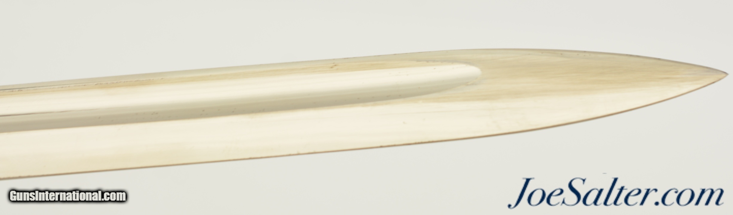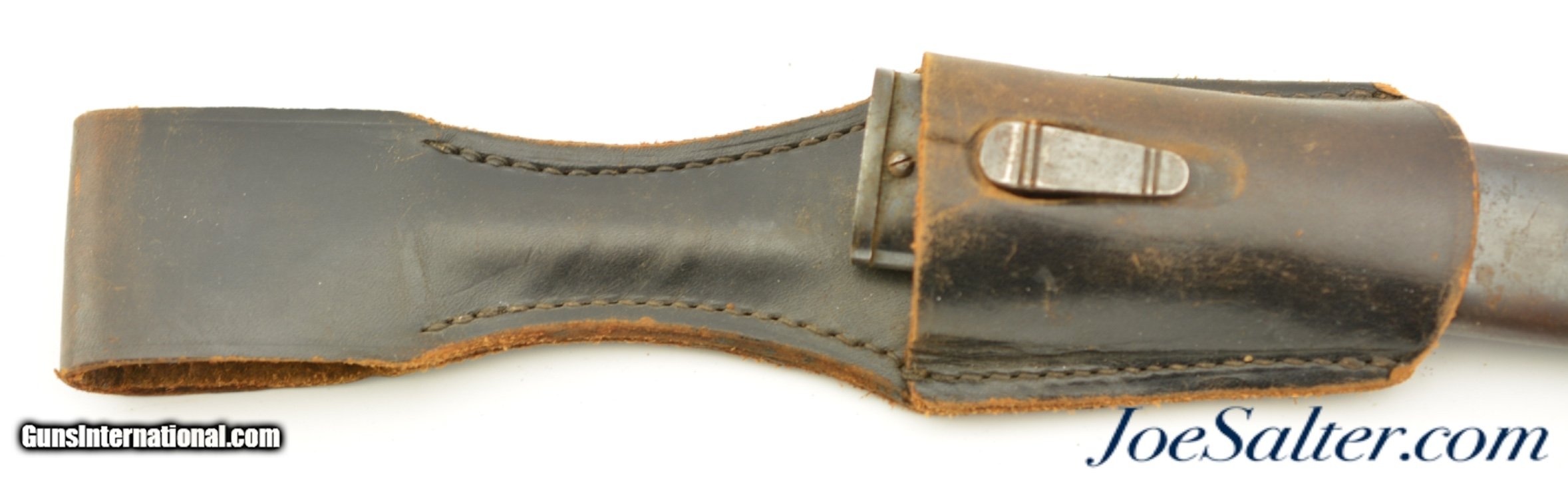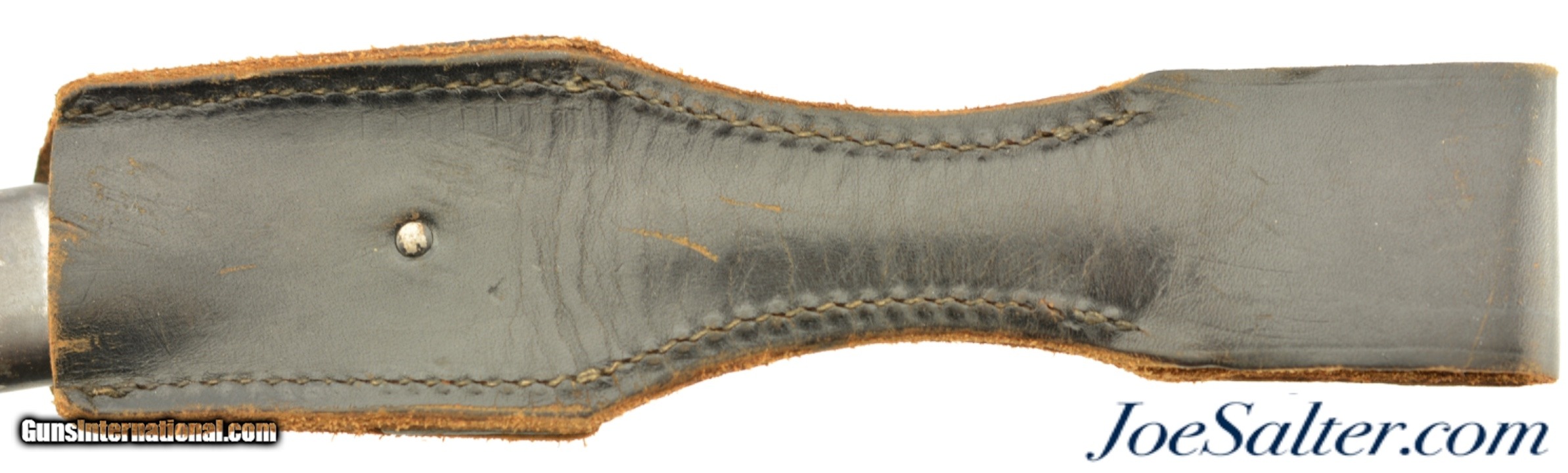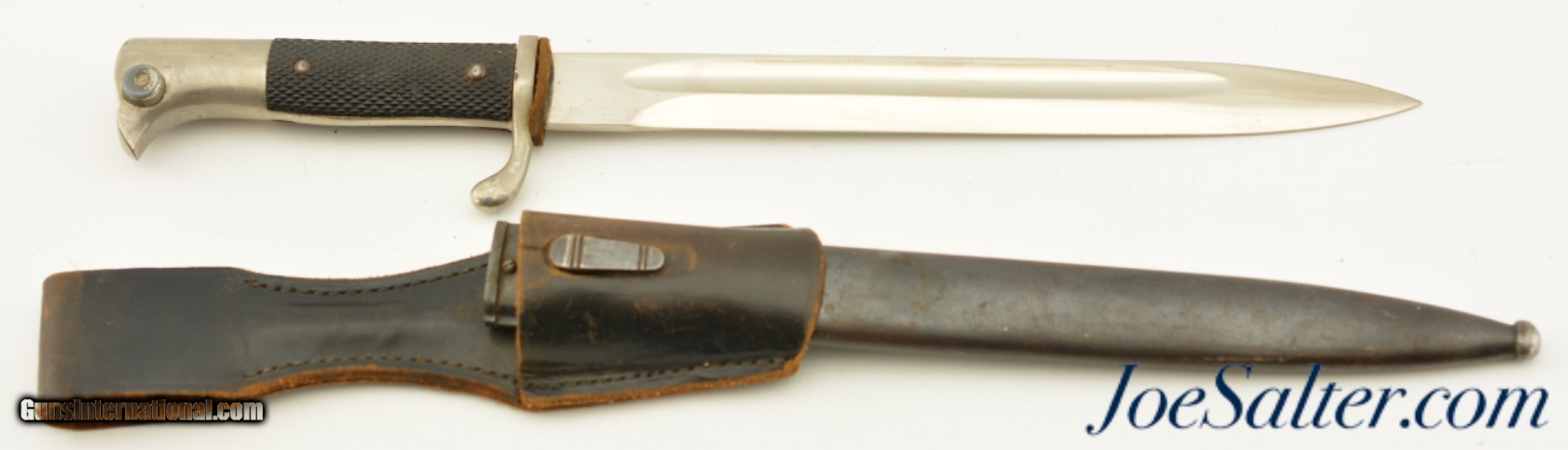 Description: This is a German WWII Wehrmacht Officers Dress Bayonet with Scabbard. This bayonet has a 9 ??" unsharpened nickel plated blade with a fuller to each side. The Eickorn Solingen produced blade is in excellent condition with light scabbard marks and almost no signs of age. The leather washer at guard is original to bayonet. The bayonet has a nickel plated, alloy, crossguard with one up-swept arm, and a stylized eagle head pommel. The hilt fittings all retain about 90% of their original nickel finish, showing typical dulled age plating with minor surface scrapes and scratches. The handle has diamond grooved, molded, black bakelite grips which are secured to the hilt by two small dome headed rivets. The red foam inserted slot, stylized eagle head pommel and stud button are intact and functions, bottom shows wear. The bayonet comes complete with an original, black, oval tipped, scabbard with most of the original finish. The black frog is in excellent condition with a few scattered scratches and light age fading. Over-all an excellent example of the Wehrmacht Dress bayonet. SOLD |