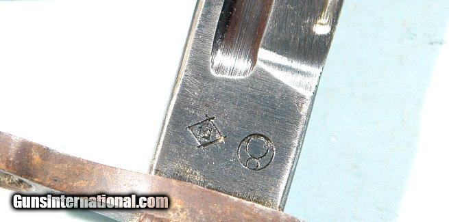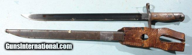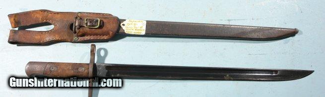 Description: WW2 JAPANESE TYPE 30 (EARLY STYLE) ARISAKA BAYONET, SCABBARD AND FROG. Mukden arsenal stamp on ricasso. Excellent blued fullered blade original. Straight hilt with no hook. Original wood grip panels held on with original screws unturned. Serial number on butt of bird's head pommel cap. Original steel scabbard with excellent frog with nice stitching and buckle. SOLD |