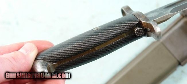 Description: WW2 U.F.H. (UNION FORK & HOE) U.S. MODEL 1942 BAYONET & M3 SCABBARD FOR M-1 GARAND & 1903 RIFLE. 16" stopped fuller blade with traces of original parkerizing under preservative laquer which will clean off nicely if u so choose. Crisp "U.F.H." over flaming bomb in between "U.S." and over "1942". Original plastic grip panels. Nice spring tension on locking button. Traces of original parkerizing in recesses of metal on birdshead pommel. Correct single screw grip attachment. Grips excellent with no looses or cracks. Correct period Model M3 scabbard with flaming bomb and US and excellent condition. SOLD |