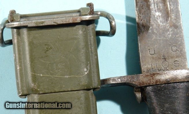 Description: WW2 UTICA CUTLERY CO. U.S. M1 M-1 GARAND BAYONET W/SCABBARD. All original and very good plus. Stamped “U. C./ORDNANCE BOMB/ U.S.”. Original “U.S./ORDNANCE BOMB” inspected scabbard. SOLD |