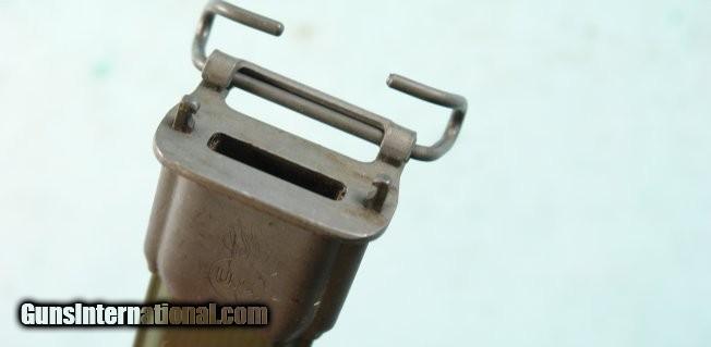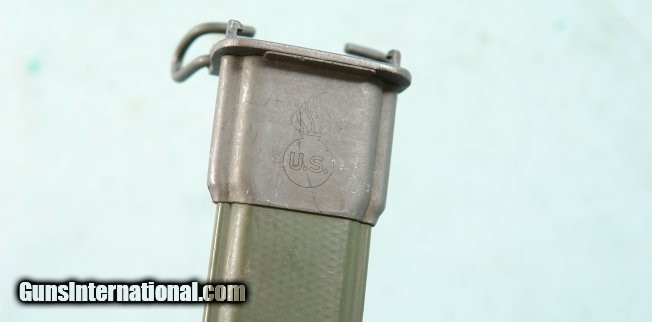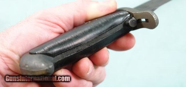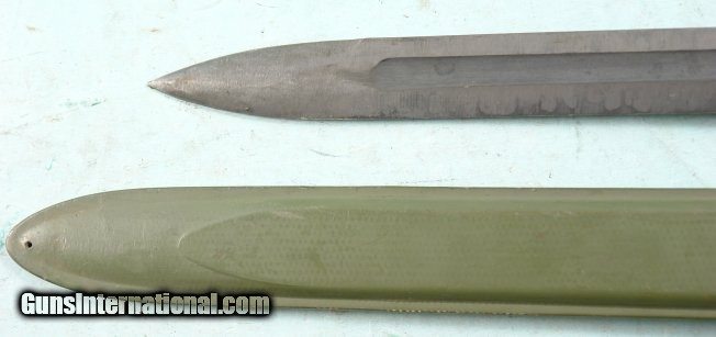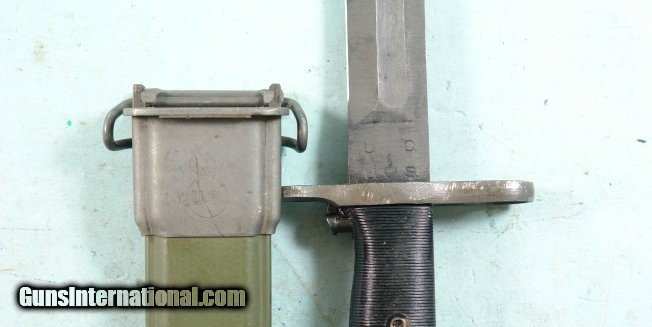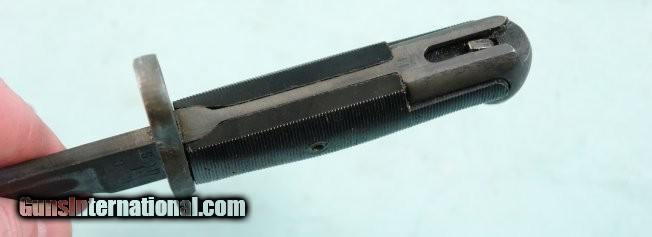 Description: WW2 UTICA CUTLERY U.S. MODEL M1 OR M-1 GARAND RIFLE BAYONET WITH CORRECT M7 SCABBARD. Blade 10" with 6" stopped fuller. All original condition with period parkerizing and crisp "U.C." over "U.S." with flaming bomb in between. Correct black plastic grips and fully working order release button and figs nice and snug in it's correct green scabbard with flaming bomb surrounding "US". Nice original untouched period Garand bayonet. SOLD |
