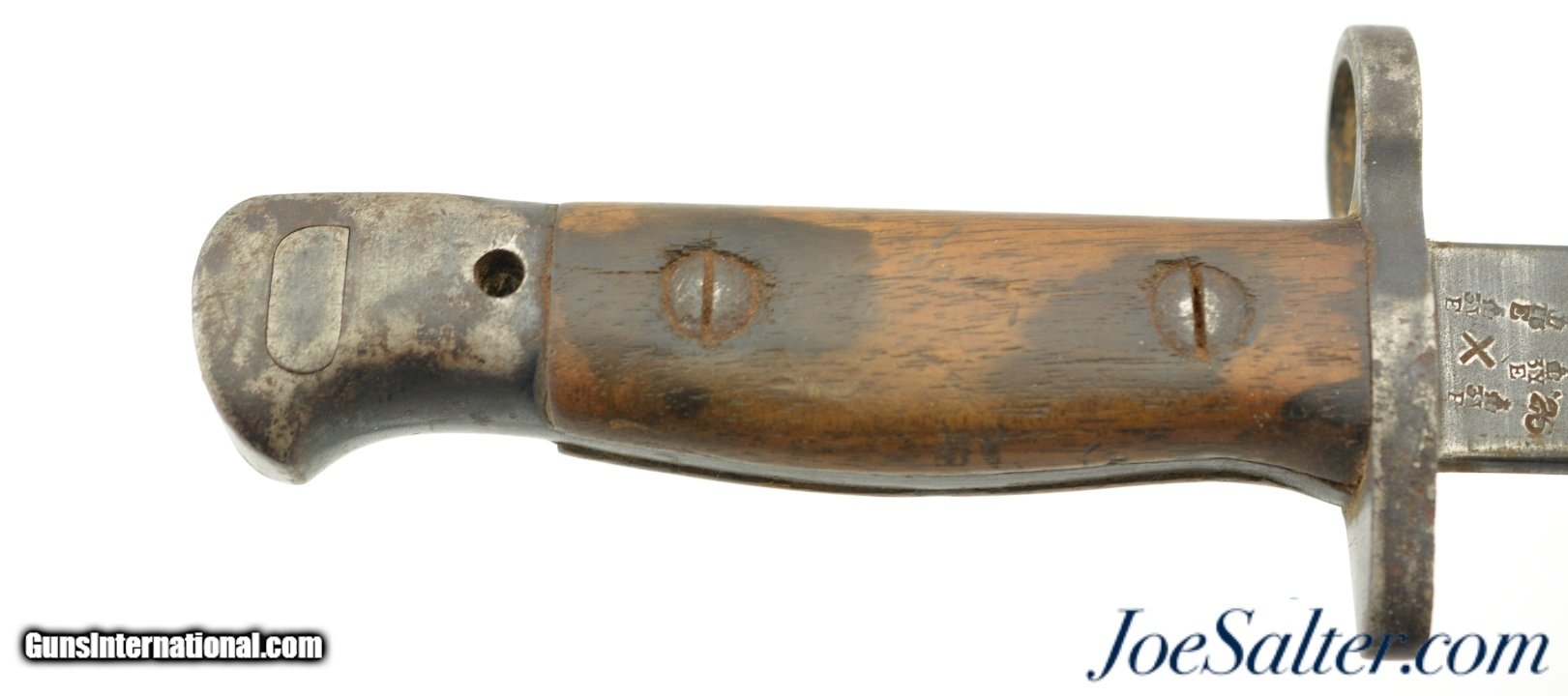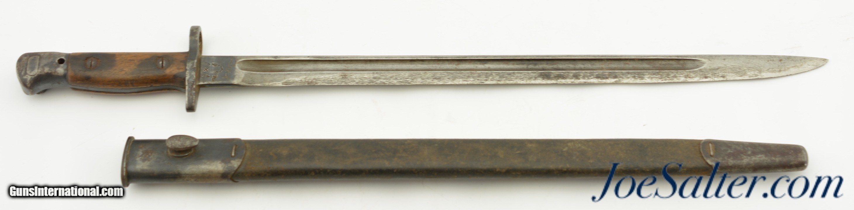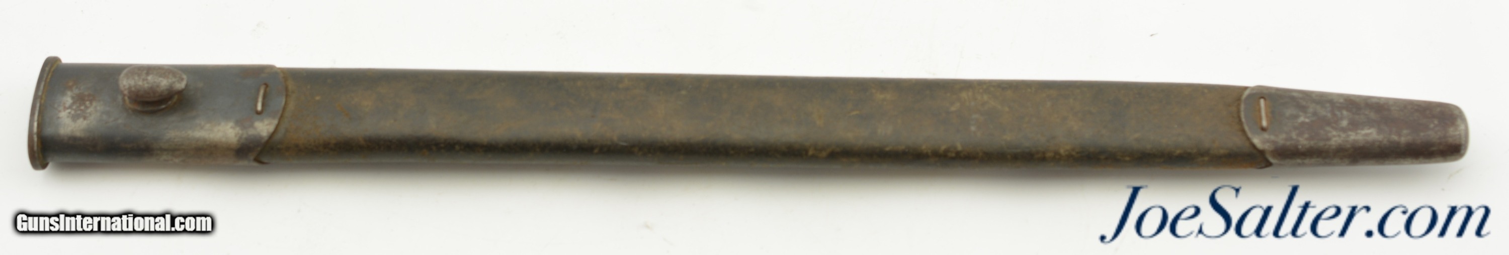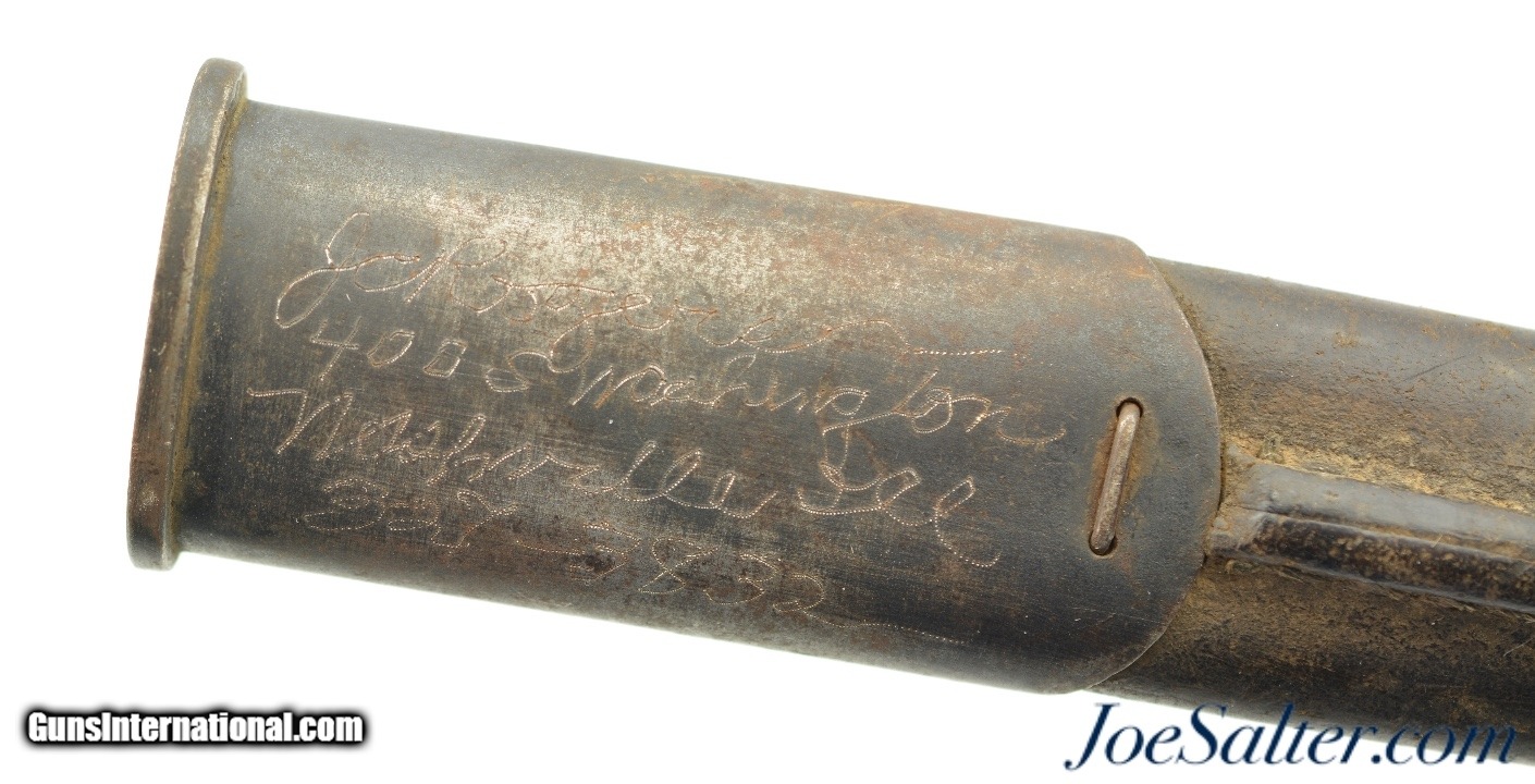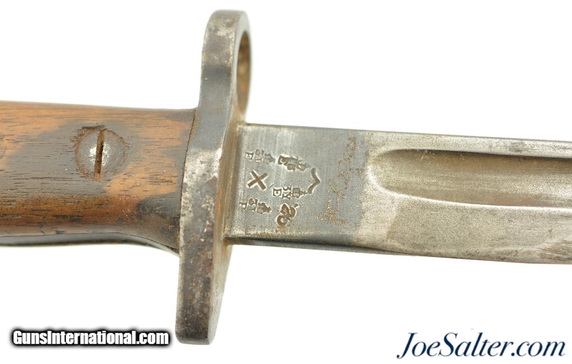 Description: This is a British Pattern 1907 second model made by Sanderson in 04/17. The blade is in good+ sharpened condition with light oxidation and nearly unmarred edge and correct tip, also is blued for the first inch and bright for the remainder. The crossguard shows signs of normal wear and light oxidation with most of the original blue. The handle has a deep rich patina with no visible proof marks on either sides. Lastly ending in a functional rifle lug pommel with no markings and the correct oil cleaning hole. Comes with a correct leather scabbard with tight stitching and no proof mark, in very good condition. Both the blade and the scabbard have a name that has be electric penciled much later in the bayonets life. Can not make out what it says. SOLD |
