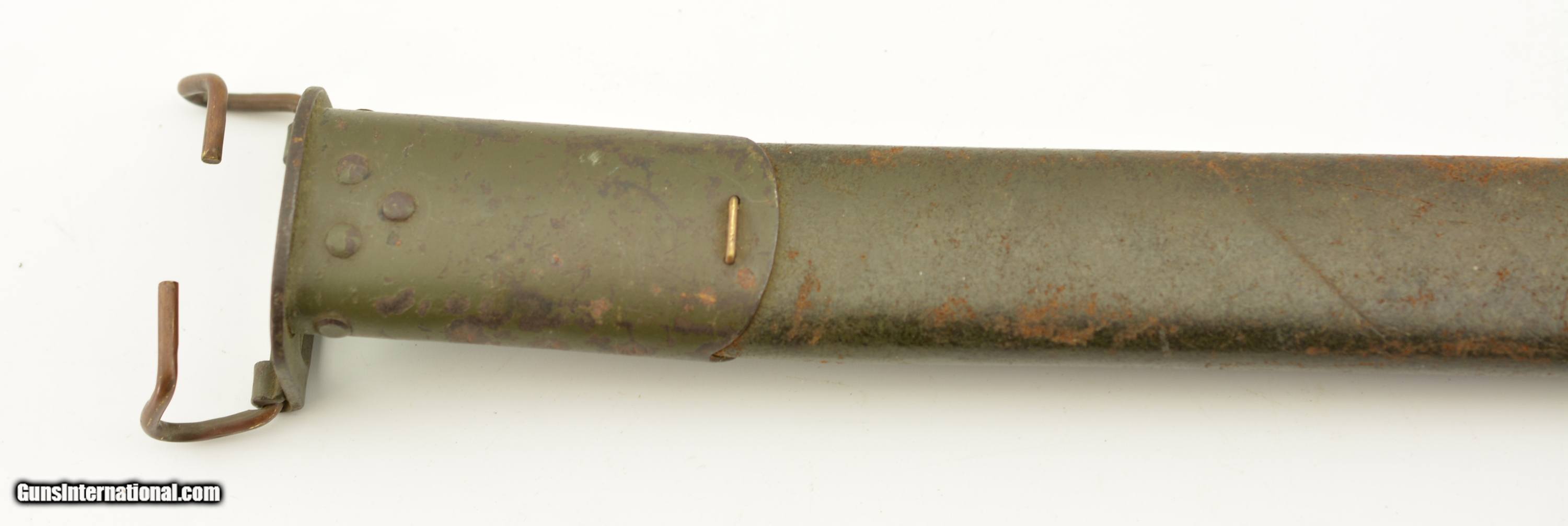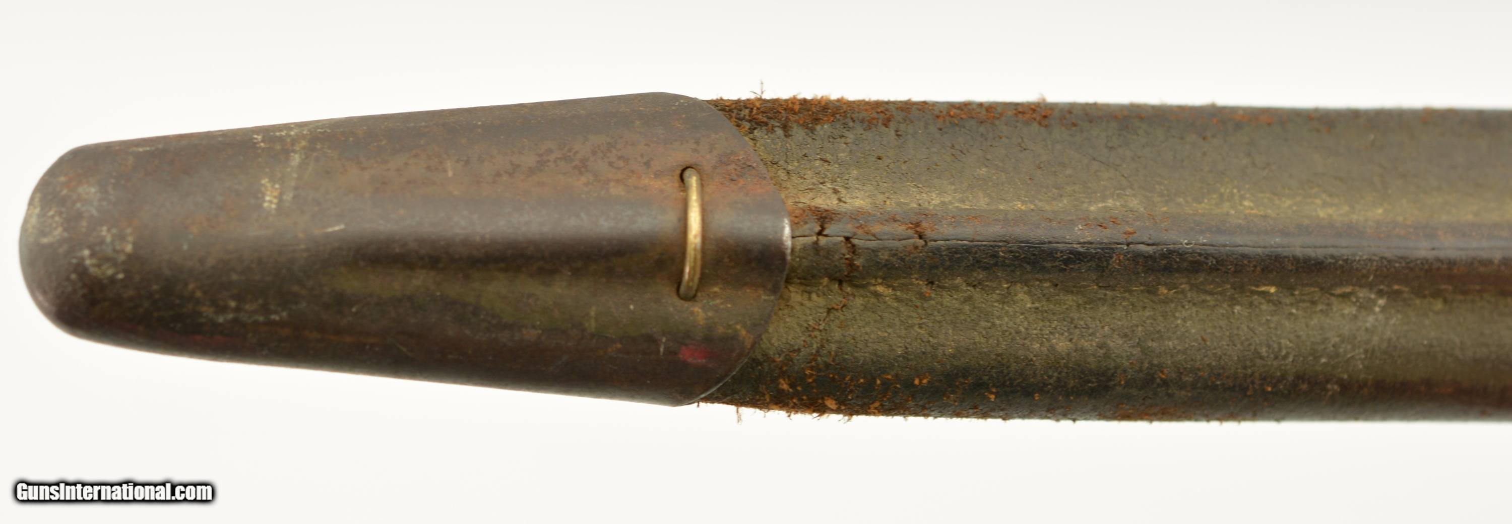 Description: This is a WWI British Pattern 1913 Bayonet made in June of 1917 by the Remington arms Co. for the British Army. It is 21 ¾" overall, 16 7/8" unsharpened blade. The blade retains 85%+ of original bluing which is lightly mottled and a slightly altered tip. All the British proof marks are correct on one side of the ricasso while the other is marked with Remington, model and year. The guard retains a good portion of the original finish with signs of some oxidation. The wooden handles are tight and in good condition with some small chips missing on both scales with a 7 stamped on the left scale. This bayonet is accompanied by the period correct double stitched leather scabbard marked 1918 and M.S. with most of the orig green paint and double hook mounting system. This scabbard is in very good to excellent condition with a small crack above the ferrule. Overall the combination is in excellent condition. SOLD Manufacturer: British Model: bayonet |