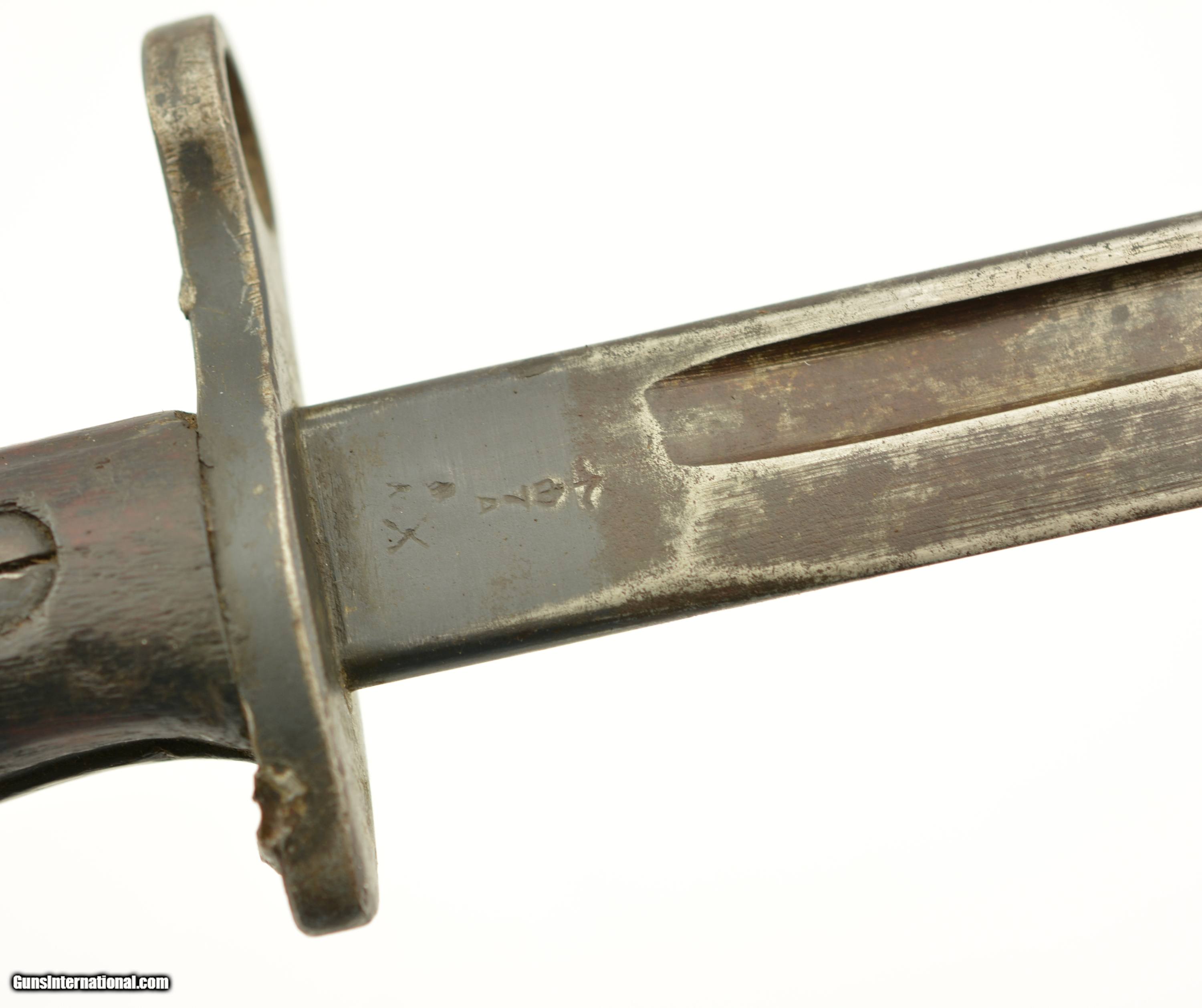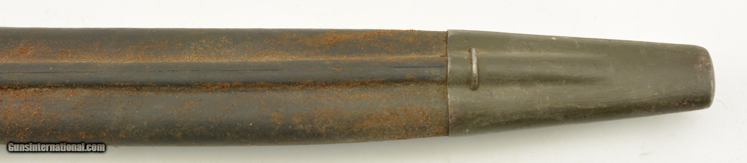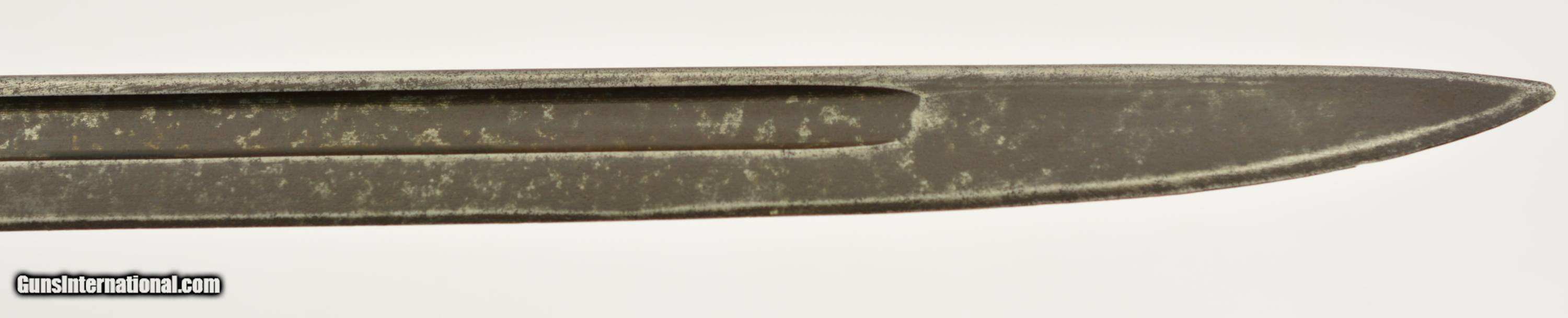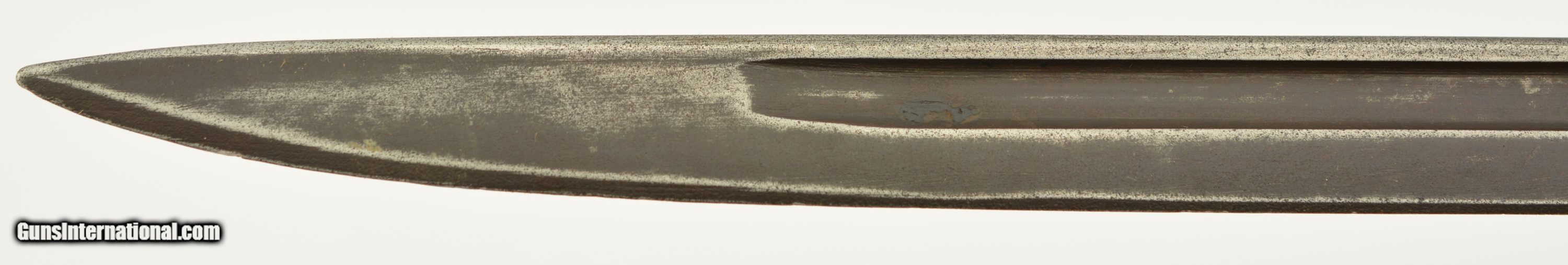 Description: This is a WWI British Pattern 1913 No. 3 Mk. I Bayonet made in March of 1916 by the Remington arms Co. for the British Army. It is 21 ¾" overall, 17 3/8" unsharpened blade. The blade retains 50%+ of original bluing which is lightly mottled and has a slightly altered tip. The edge has one small nick near the tip. All the British proof marks are correct on one side of the ricasso while the other is marked with Remington, model and year. The guard shows signs of being welded at some point (see photos). The wooden handles are tight and is fine condition with the functioning pommel being stamped with ‘541’. This bayonet is accompanied by the period correct No.2 Mk.1 double stitched scabbard. This scabbard is in excellent condition with only some soil aging with both the chap and locket in fine condition with excellent patina. Overall the combination is in very good condition. SOLD Manufacturer: British Model: Bayonet |