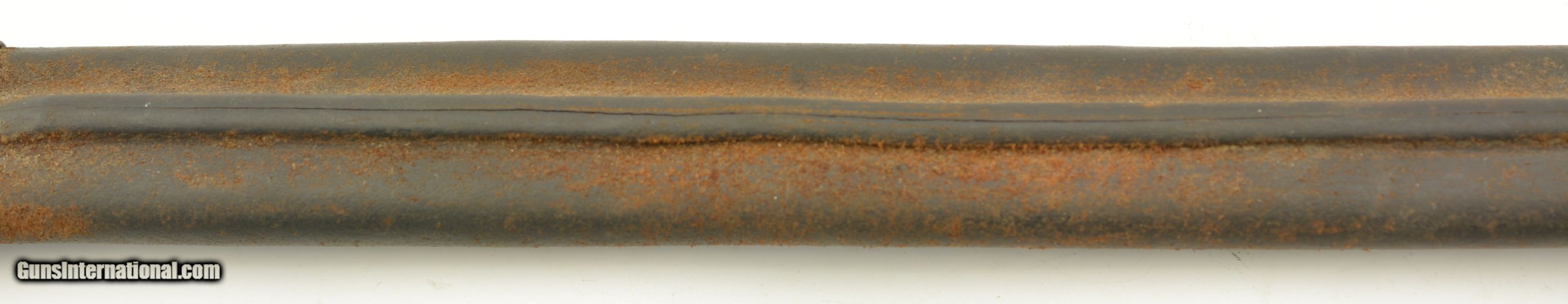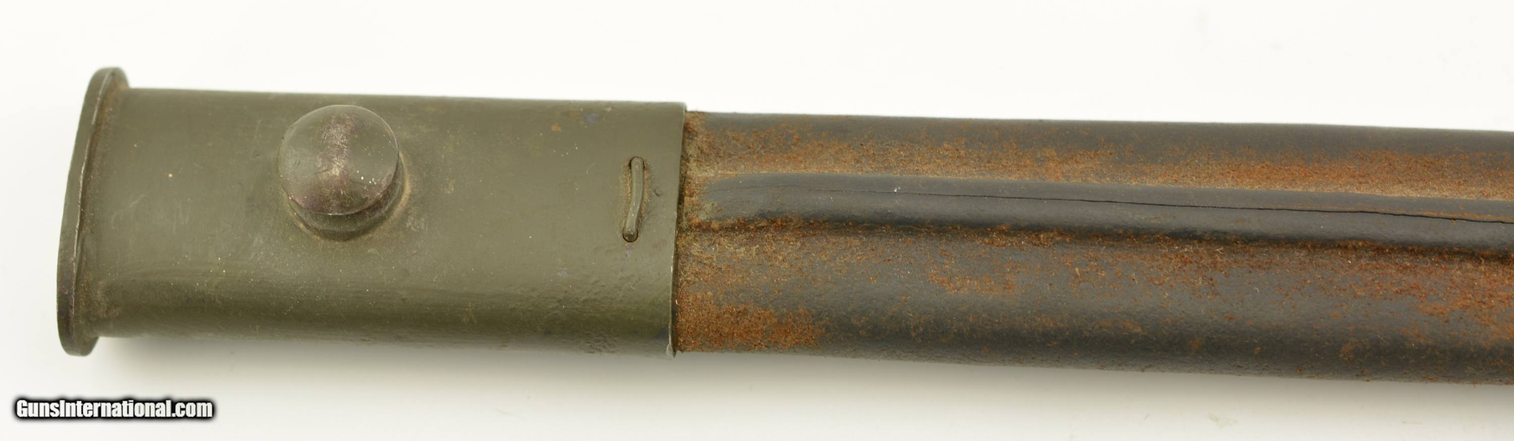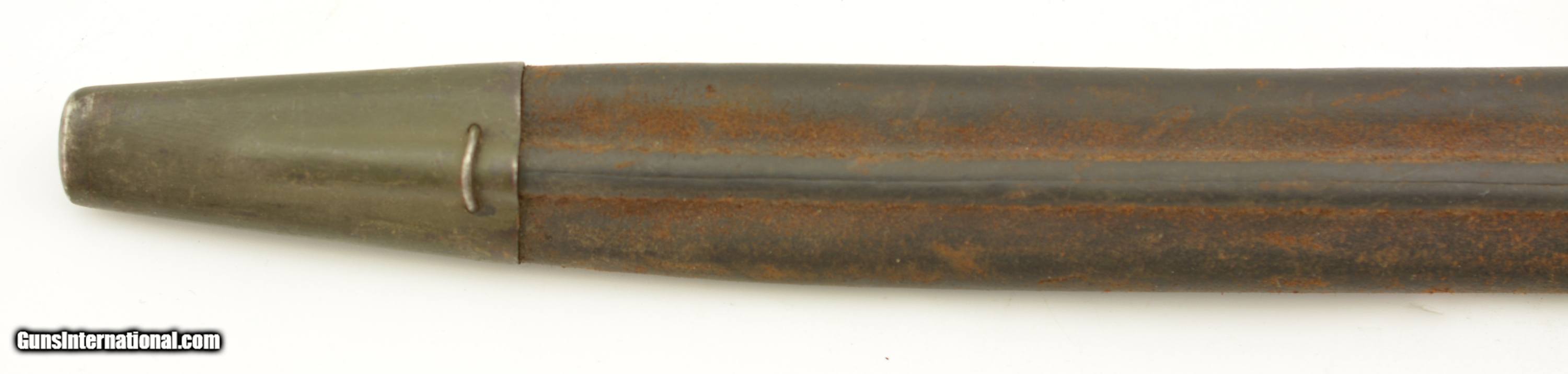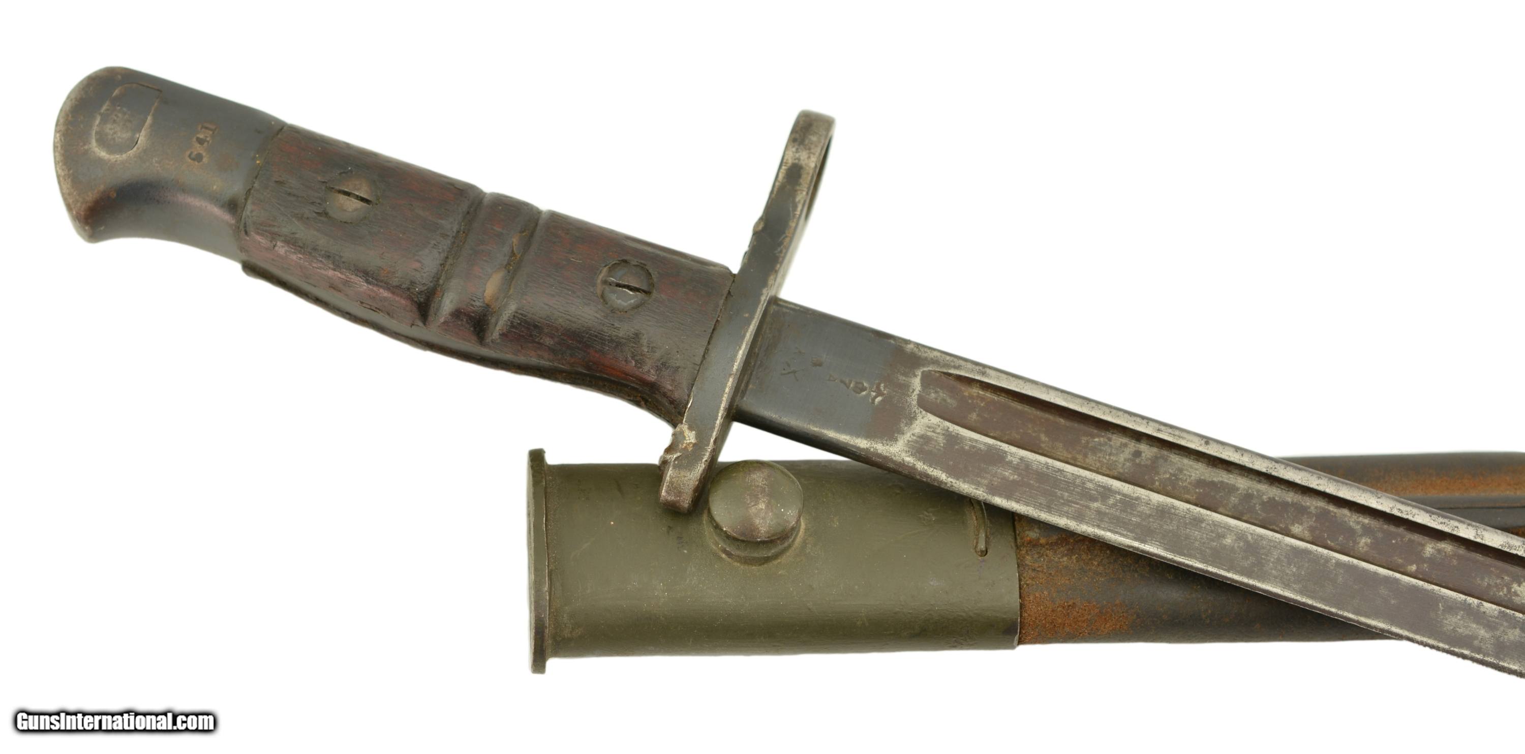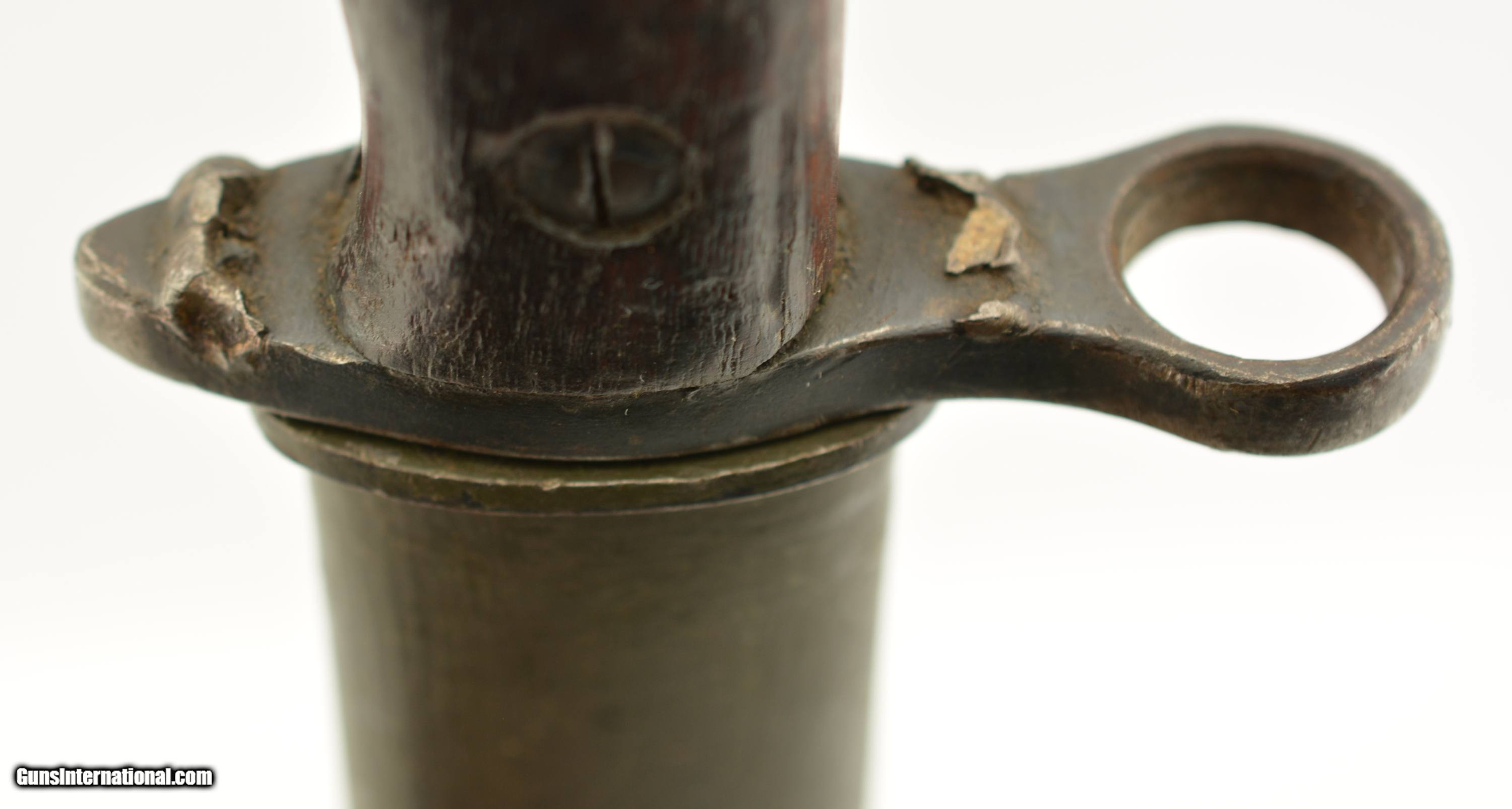 Description: This is a WWI British Pattern 1913 No. 3 Mk. I Bayonet made in March of 1916 by the Remington arms Co. for the British Army. It is 21 ¾" overall, 17 3/8" unsharpened blade. The blade retains 50%+ of original bluing which is lightly mottled and has a slightly altered tip. The edge has one small nick near the tip. All the British proof marks are correct on one side of the ricasso while the other is marked with Remington, model and year. The guard shows signs of being welded at some point (see photos). The wooden handles are tight and is fine condition with the functioning pommel being stamped with ‘541’. This bayonet is accompanied by the period correct No.2 Mk.1 double stitched scabbard. This scabbard is in excellent condition with only some soil aging with both the chap and locket in fine condition with excellent patina. Overall the combination is in very good condition. SOLD Manufacturer: British Model: Bayonet |