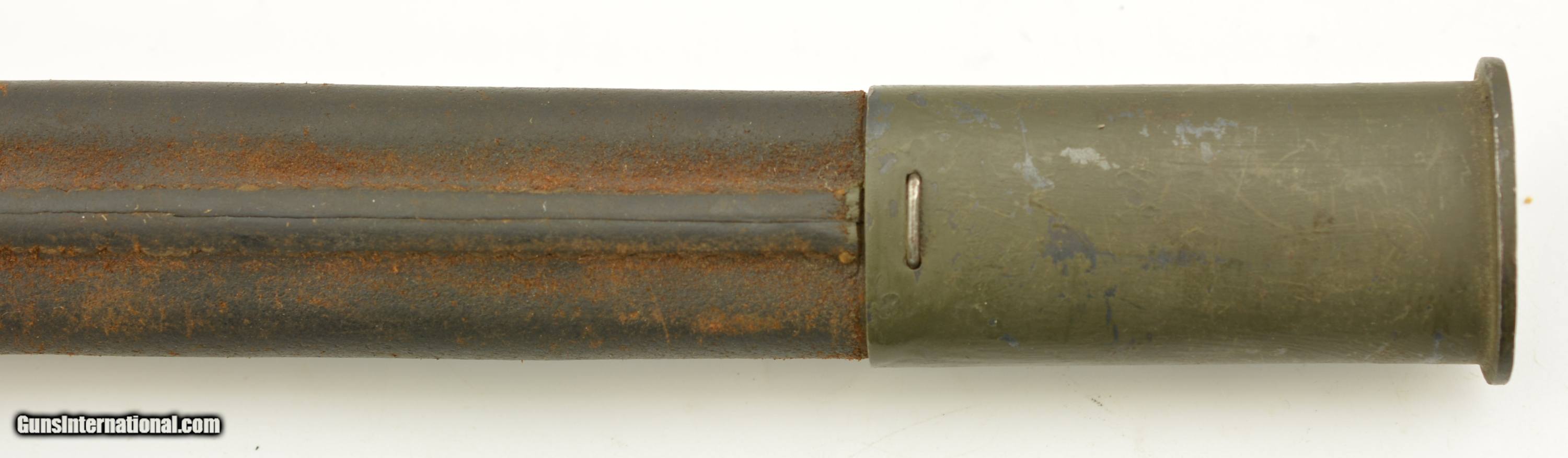 Description: This is a WWI British Pattern 1913 No. 3 Mk. I Bayonet made in March of 1916 by the Remington arms Co. for the British Army. It is 21" overall, 17 3/8" unsharpened blade. The blade retains 50%+ of original bluing which is lightly mottled and has a slightly altered tip. The edge has one small nick near the tip. All the British proof marks are correct on one side of the ricasso while the other is marked with Remington, model and year. The guard shows signs of being welded at some point (see photos). The wooden handles are tight and is fine condition with the functioning pommel being stamped with "541". This bayonet is accompanied by the period correct No.2 Mk.1 double stitched scabbard. This scabbard is in excellent condition with only some soil aging with both the chap and locket in fine condition with excellent patina. Overall the combination is in very good condition. SOLD |